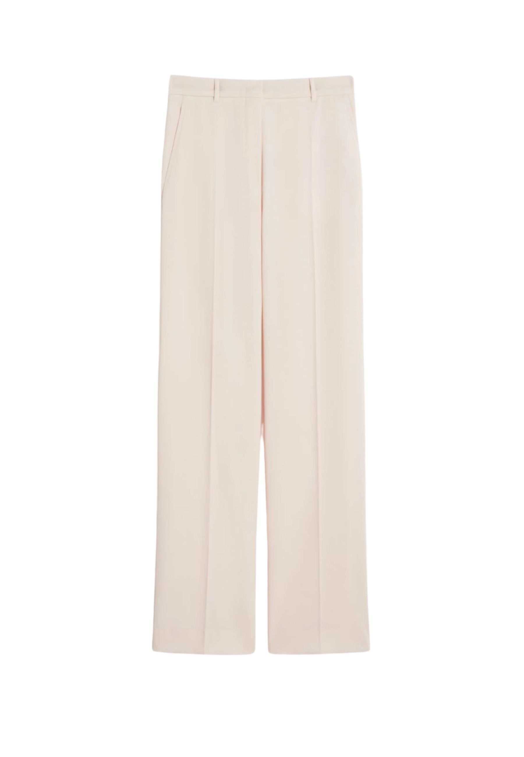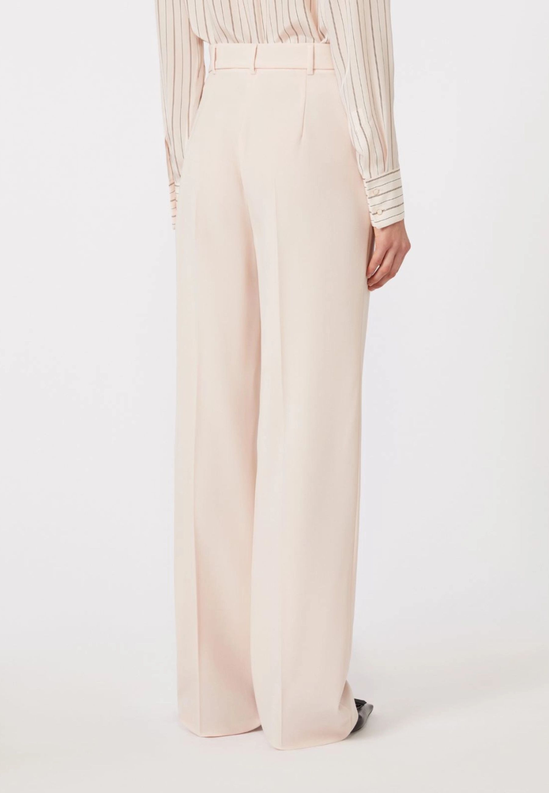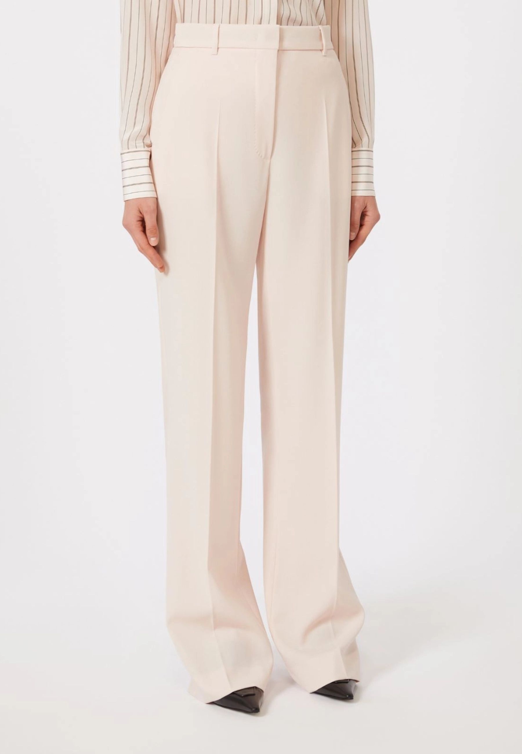 Pantalone firmato Max Mara realizzato in crêpe satin di pura lana vergine, un tessuto elegante e confortevole che garantisce una vestibilità impeccabile. Il modello è caratterizzato da una raffinata linea straight leg, valorizzata da dettagli sartoriali che richiamano lestetica del tailoring classico.