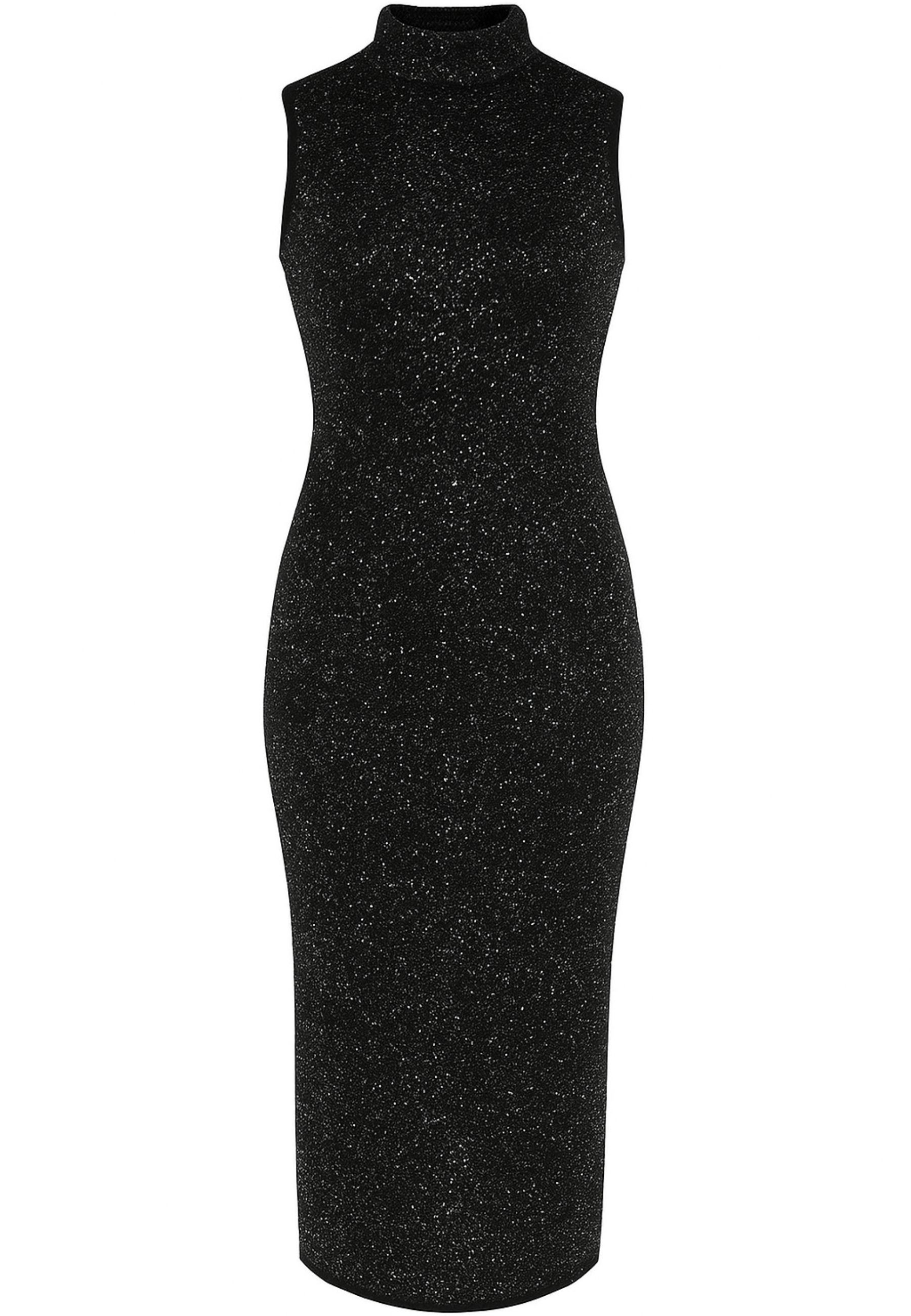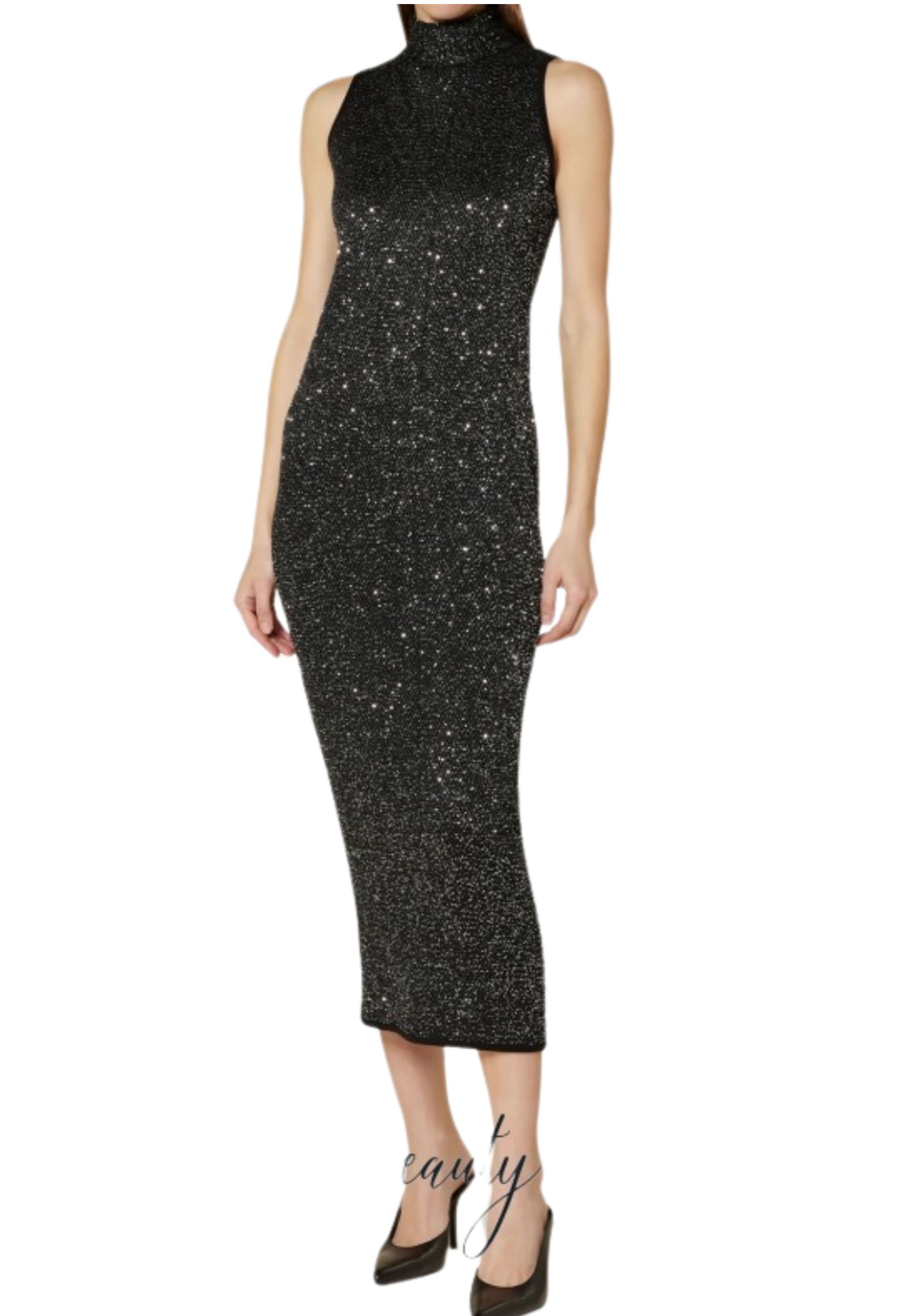 Abito lungo senza maniche firmato Max Mara Studio, realizzato in maglia lamé elasticizzata con una raffinata finitura brillante. Il modello, caratterizzato da un design minimal e contemporaneo, presenta collo alto e linea aderente che scolpisce la silhouette con eleganza. Il tessuto fluido e luminoso aggiunge un tocco sofisticato ideale per la sera o per occasioni speciali.