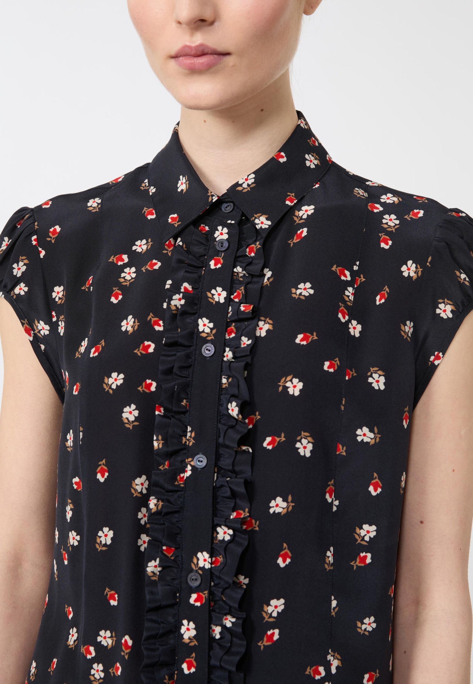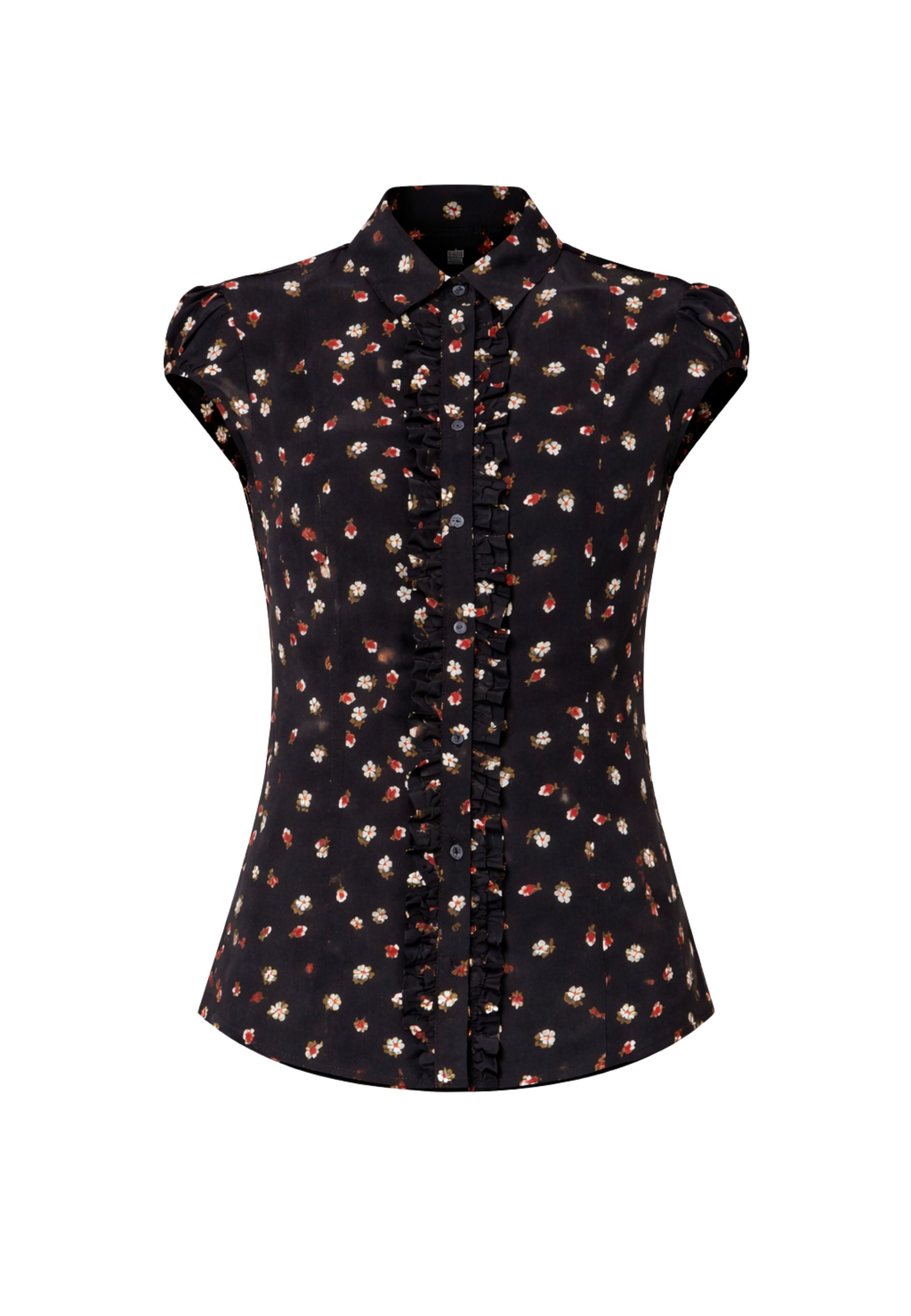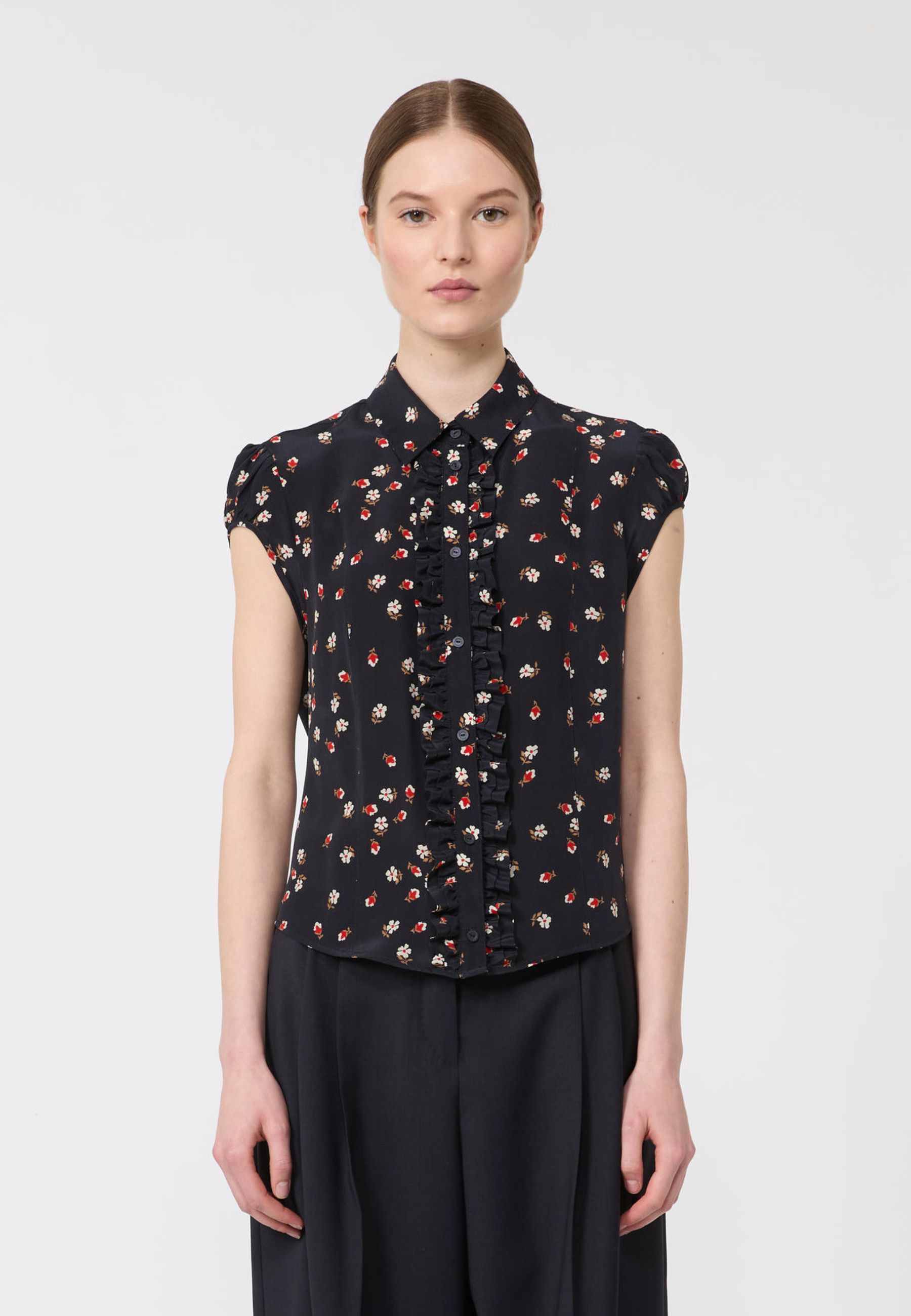 La linea leggermente sfiancata definisce la figura con discrezione, mentre il plastron frontale arricchito da piccole rouches aggiunge un dettaglio romantico e sofisticato. Il colletto classico a camicia e la chiusura frontale con bottoni a vista in tono completano il design con un tocco di eleganza senza tempo. Le maniche corte a sbuffo donano volume e femminilità, mentre il fondo stondato rende il capo versatile, perfetto sia dentro pantaloni sartoriali sia sopra gonne o denim.