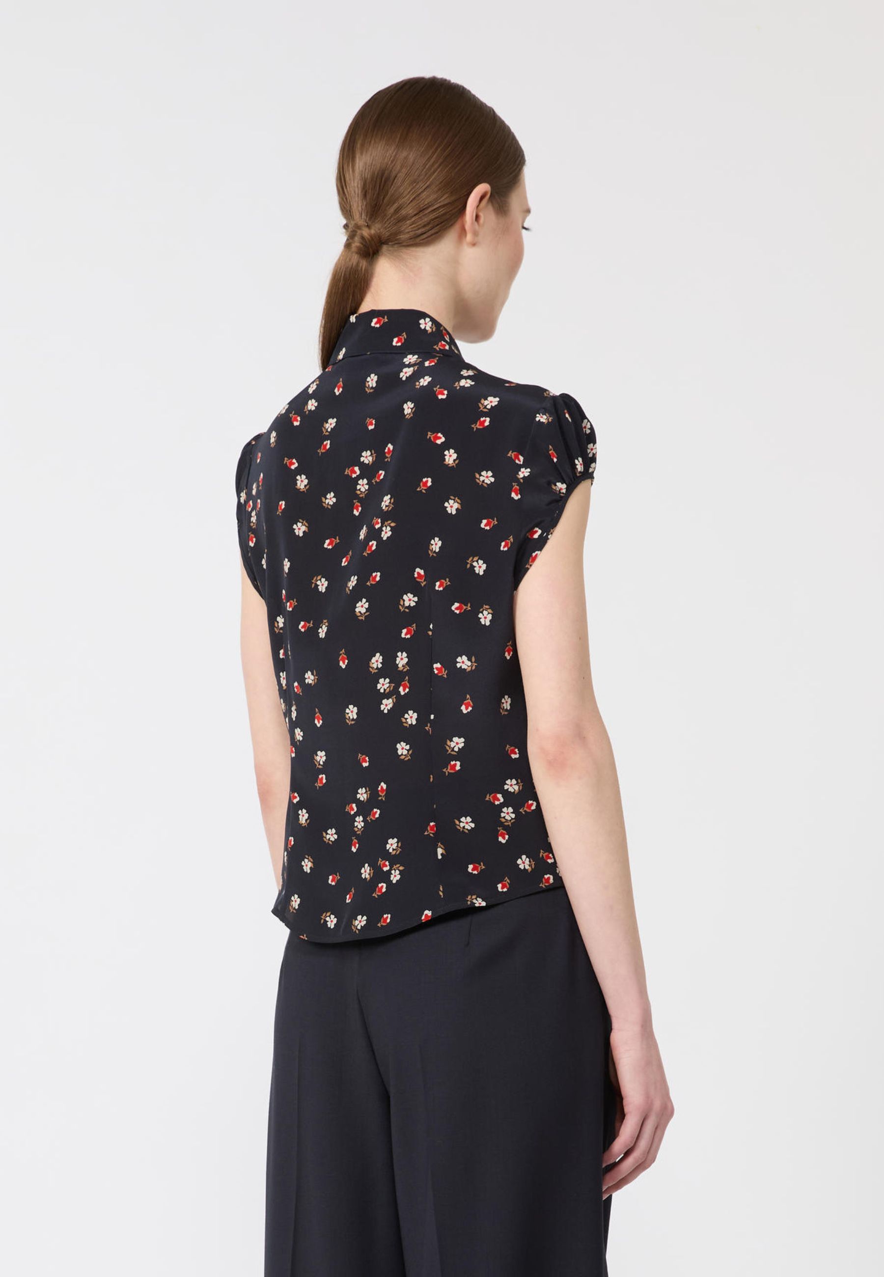 Camicia raffinata realizzata in crêpe de Chine di pura seta lavata, caratterizzata da una texture fluida e leggera che valorizza la silhouette. Il modello, ispirato allo stile femminile degli anni 40, presenta un motivo di collezione stampato all over che dona eleganza e movimento al capo.