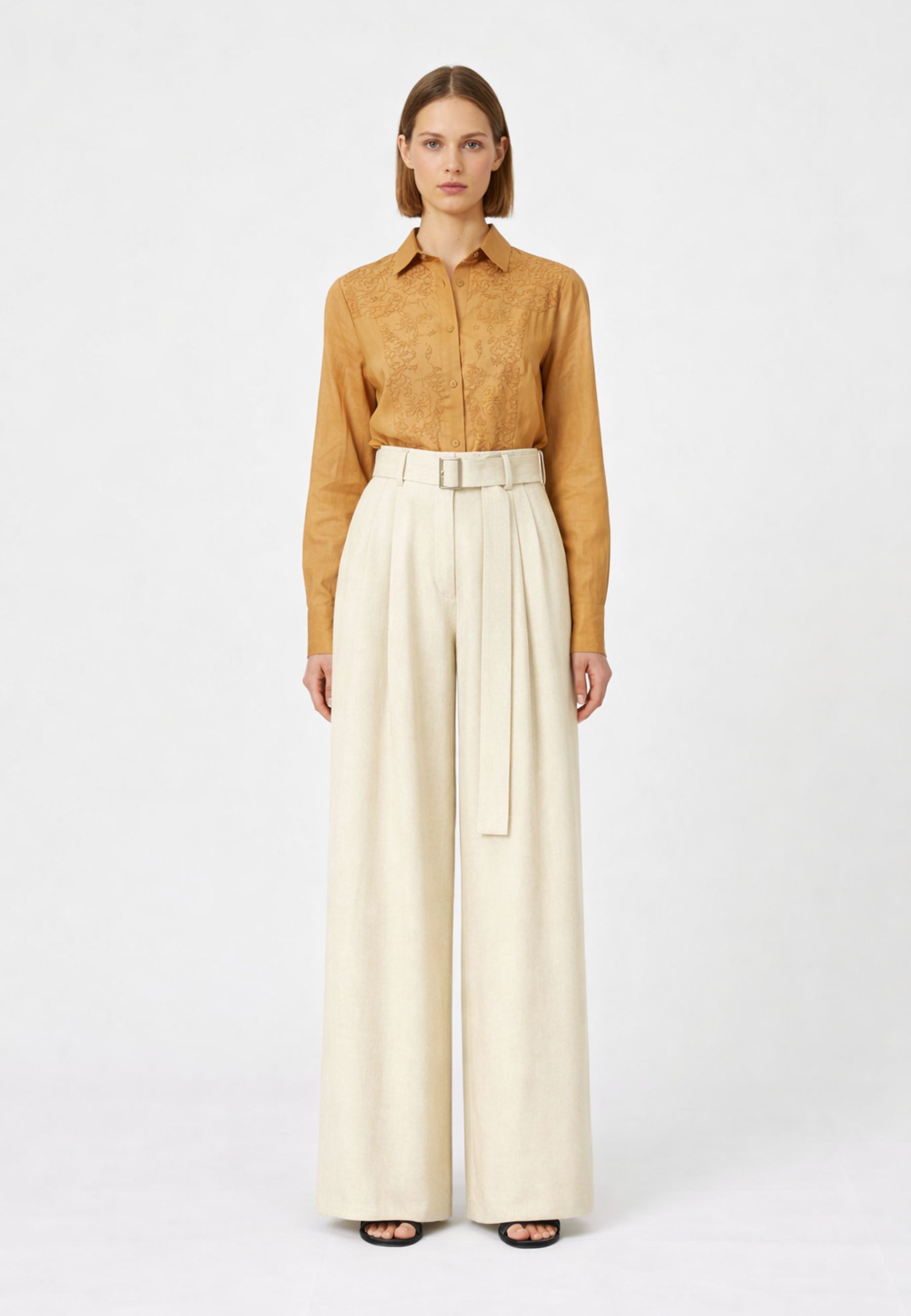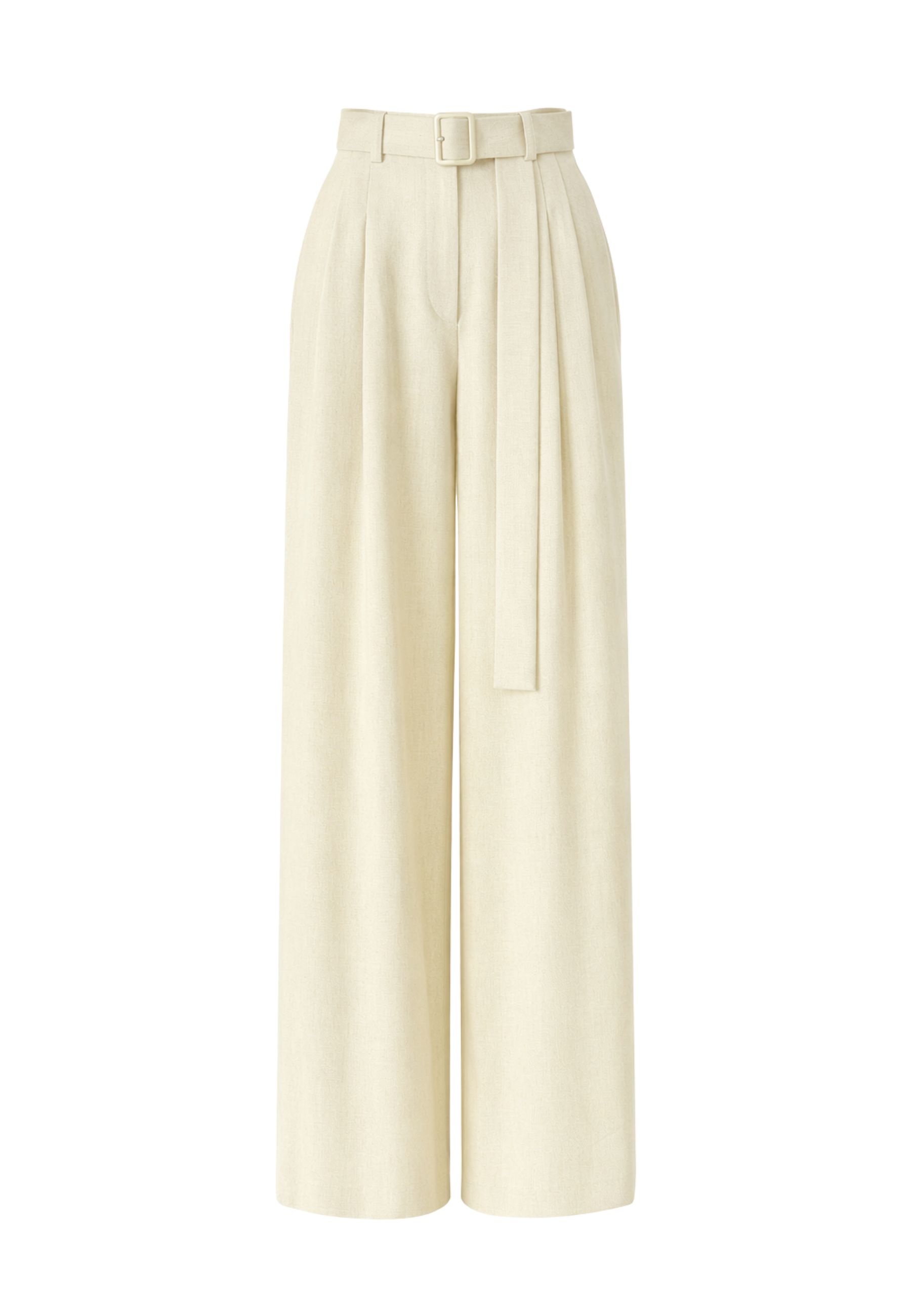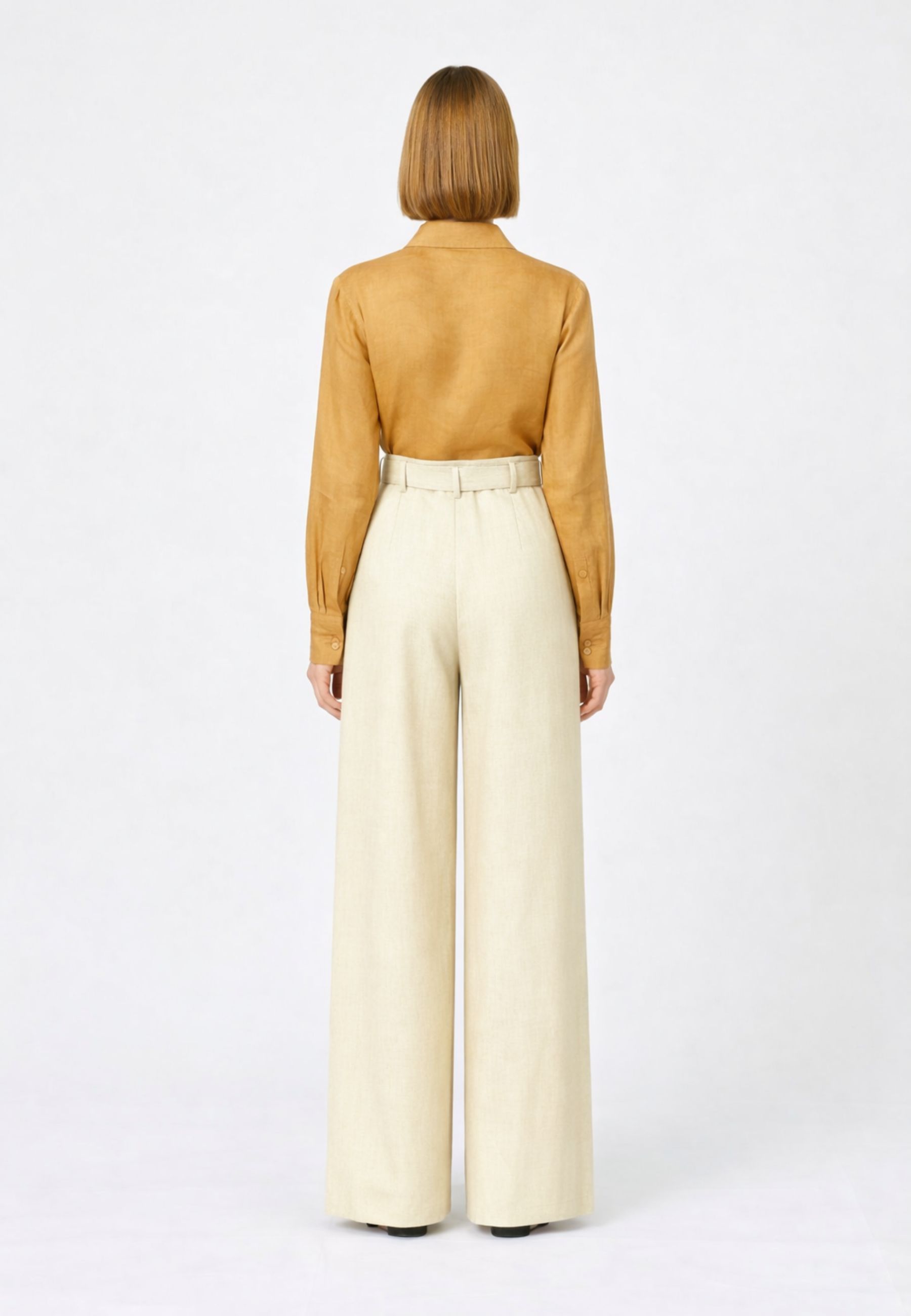 Pantalone Max Mara Studio a vita alta dalla linea ampia e leggermente oversize, realizzato in tela leggera di puro lino lavato, fresca e naturale al tatto. Il modello presenta gamba larga con doppia pinces sul davanti e piega stirata, per una silhouette elegante e fluida.