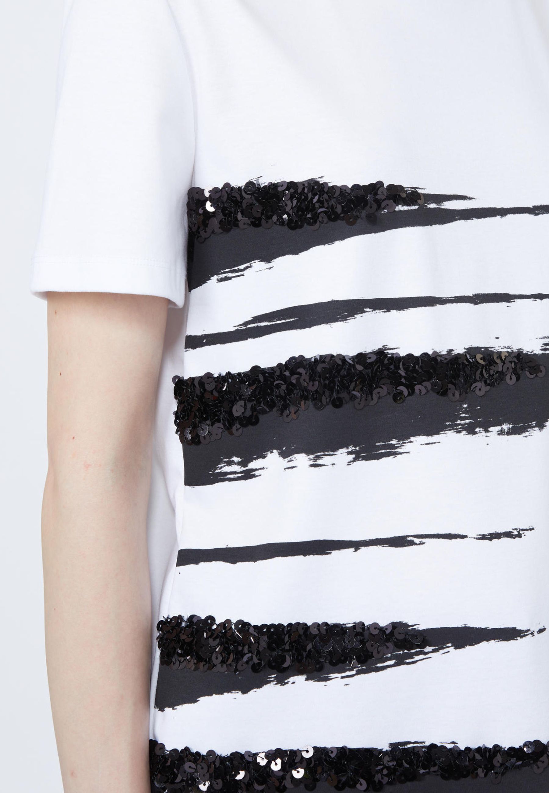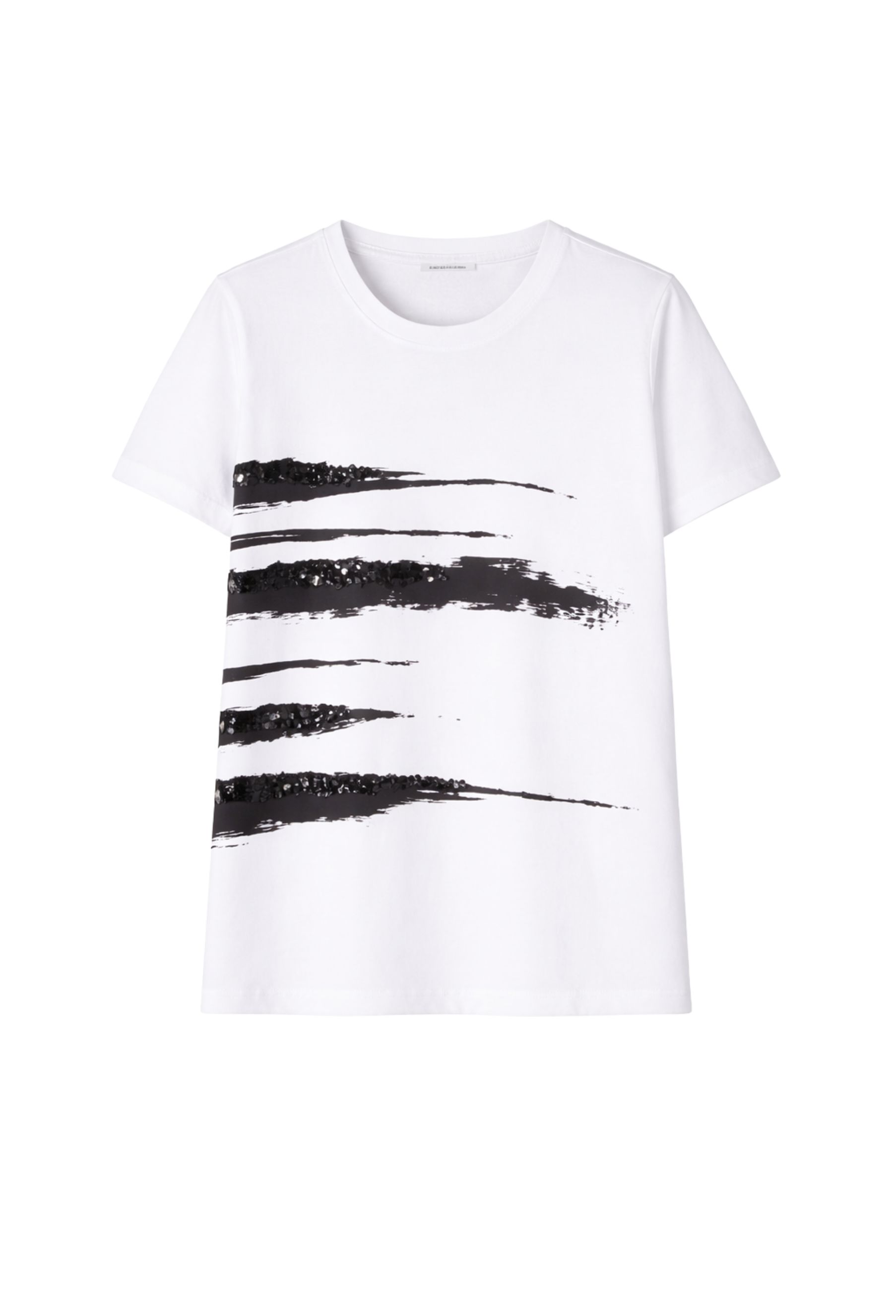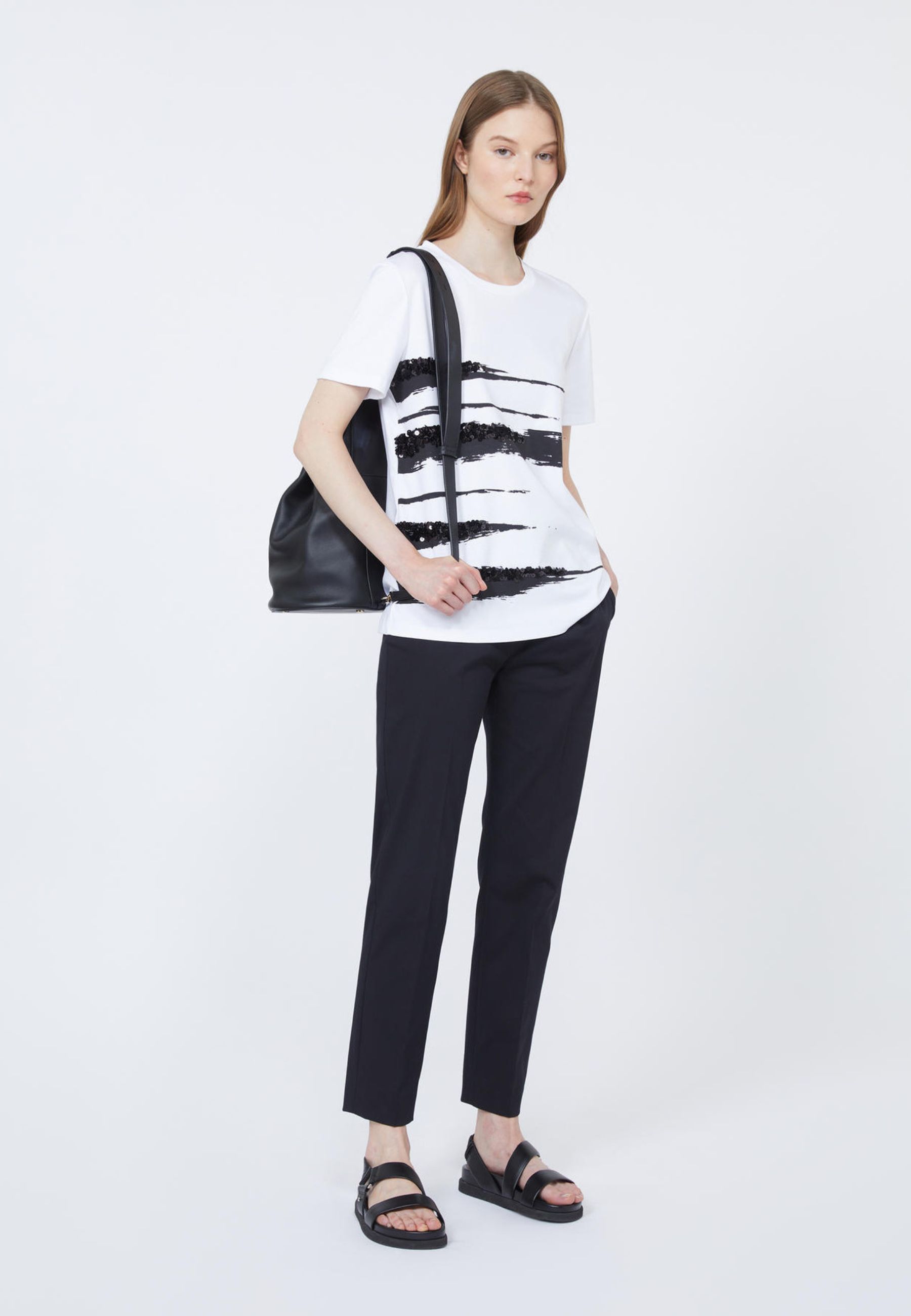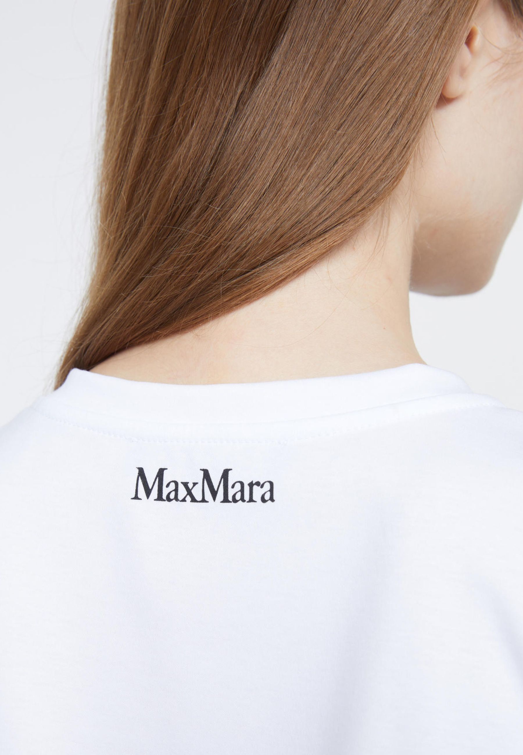 T-shirt Max Mara Studio dalla vestibilità regular, realizzata in jersey interlock di puro cotone, morbido e compatto al tatto. Il modello presenta linea dritta con girocollo e maniche corte, arricchito da motivo di collezione stampato sul davanti con dettagli ricamati, che donano un tocco grafico e contemporaneo al capo.