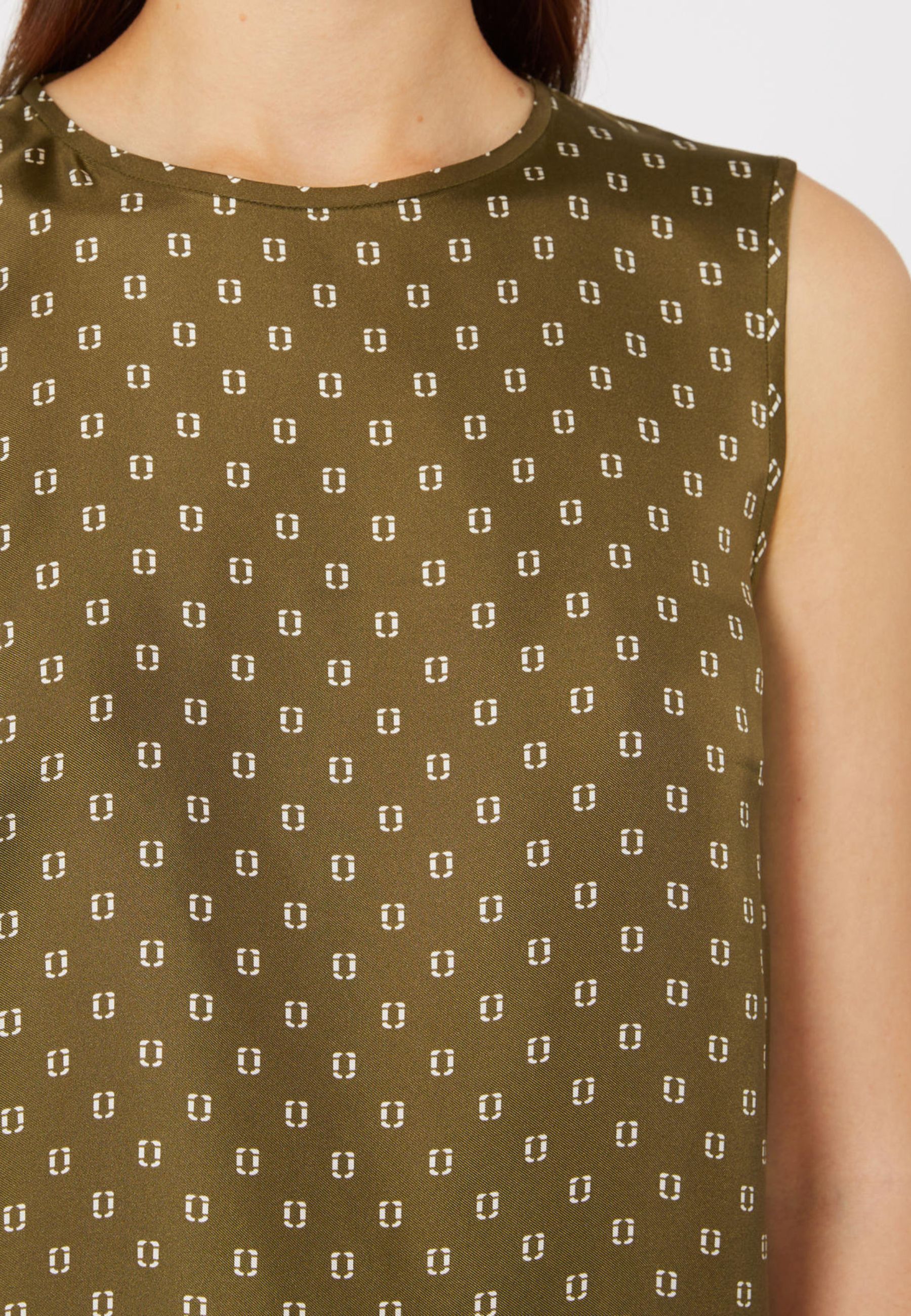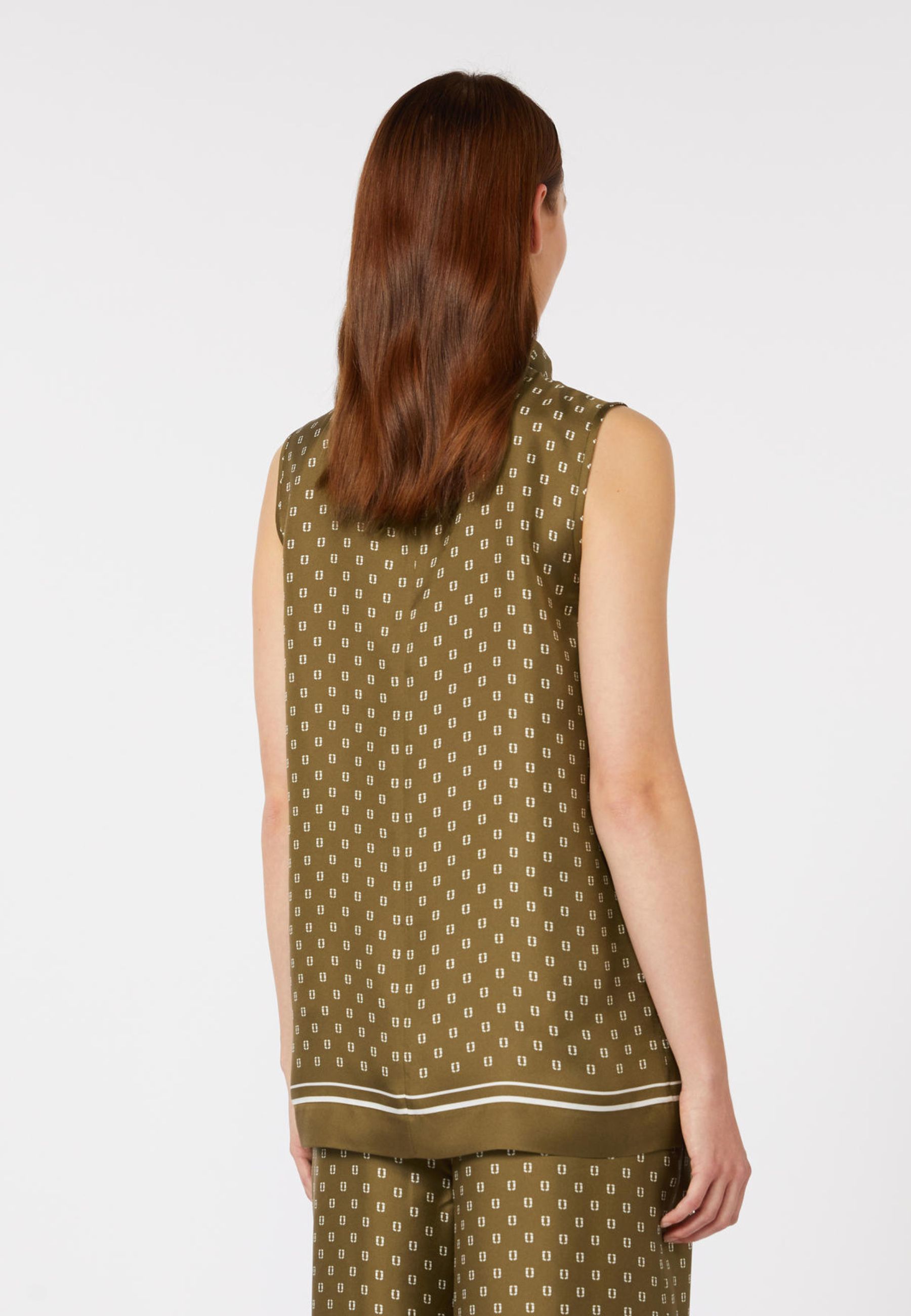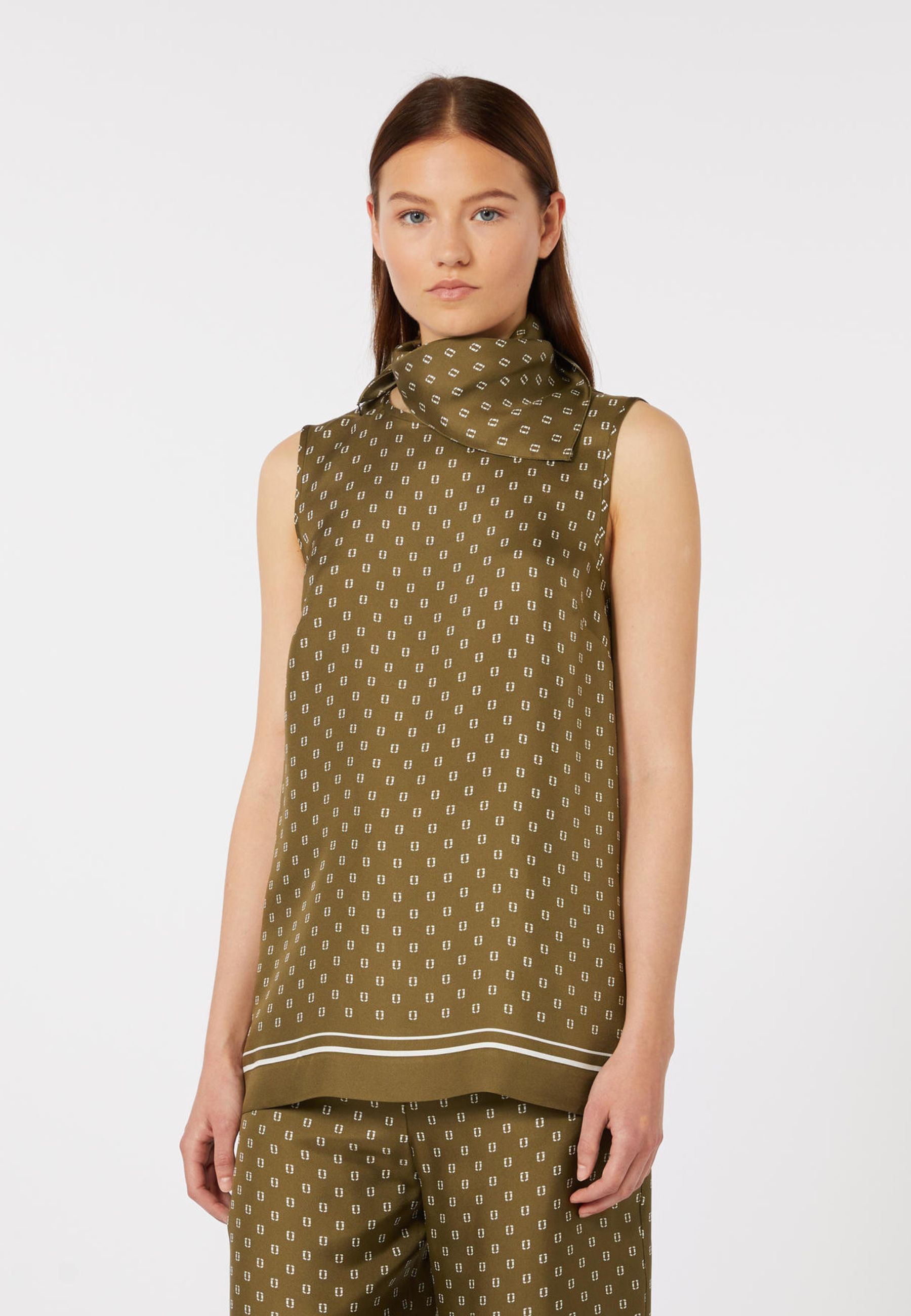 Top smanicato Max Mara Studio dal design elegante e contemporaneo, caratterizzato da un raffinato motivo foulard stampato all over. La linea dritta e fluida valorizza la leggerezza del tessuto, rendendo il capo ideale per look sofisticati ma versatili, perfetti sia per il giorno che per occasioni più ricercate.