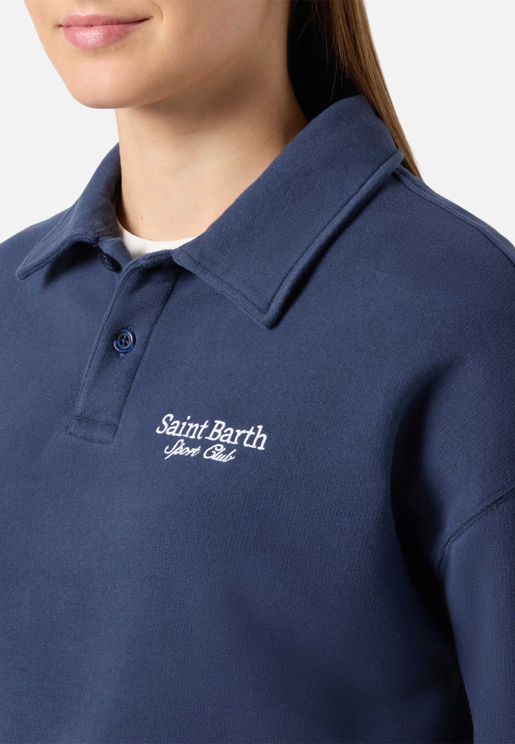 Il modello presenta colletto stile polo con abbottonatura frontale e maniche lunghe, per un tocco casual raffinato. Il design minimal è valorizzato dal ricamo Saint Barth Sport Club sul petto, dettaglio iconico che richiama lidentità del brand.