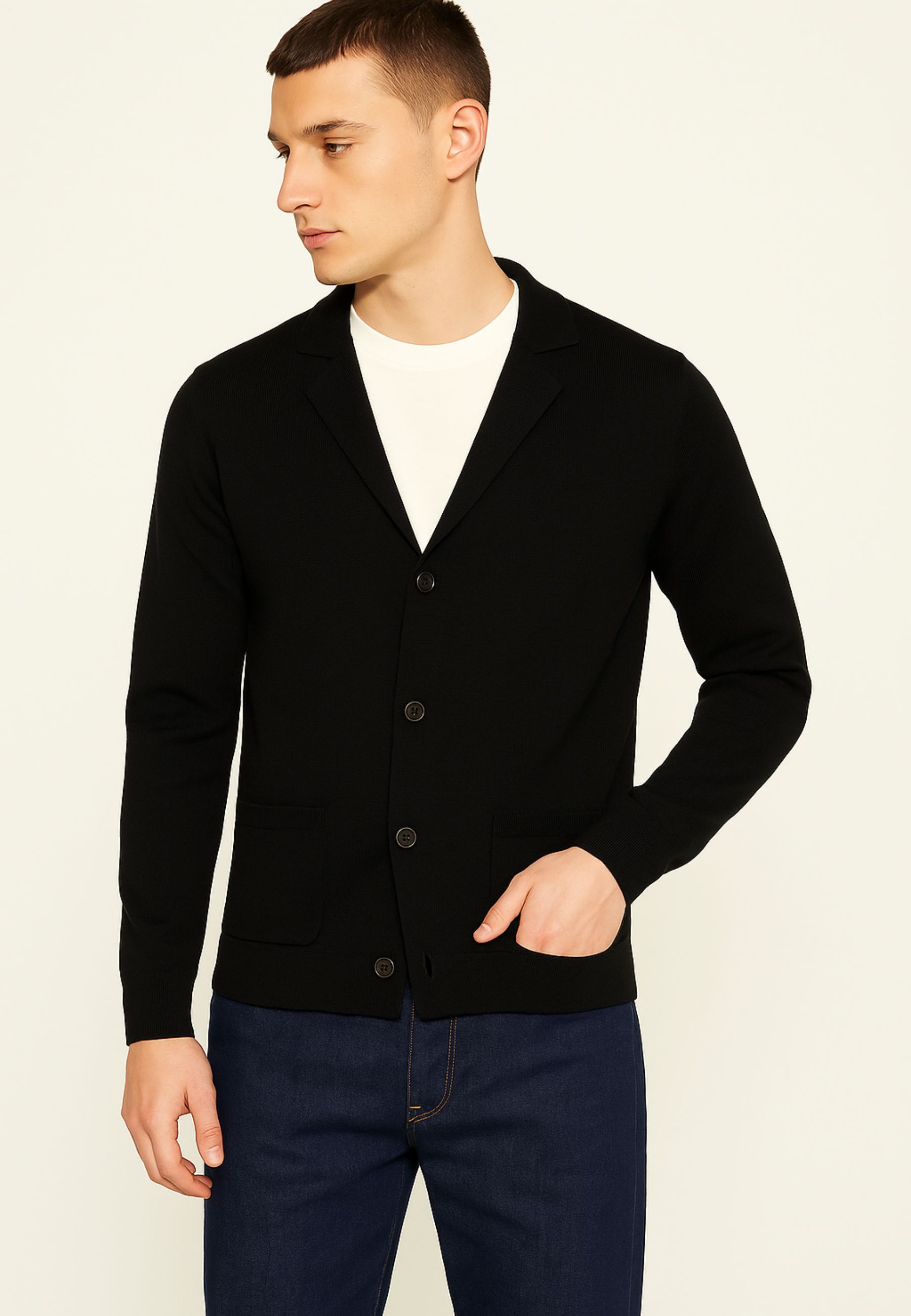 Il modello indossa la giacca sopra una semplice T-shirt bianca, mostrando la sua versatilità e la vestibilità regolare che segue la linea del corpo senza risultare aderente. Completano il capo la chiusura a bottoni, le tasche frontali applicate e i polsini a coste, che aggiungono struttura e definizione.