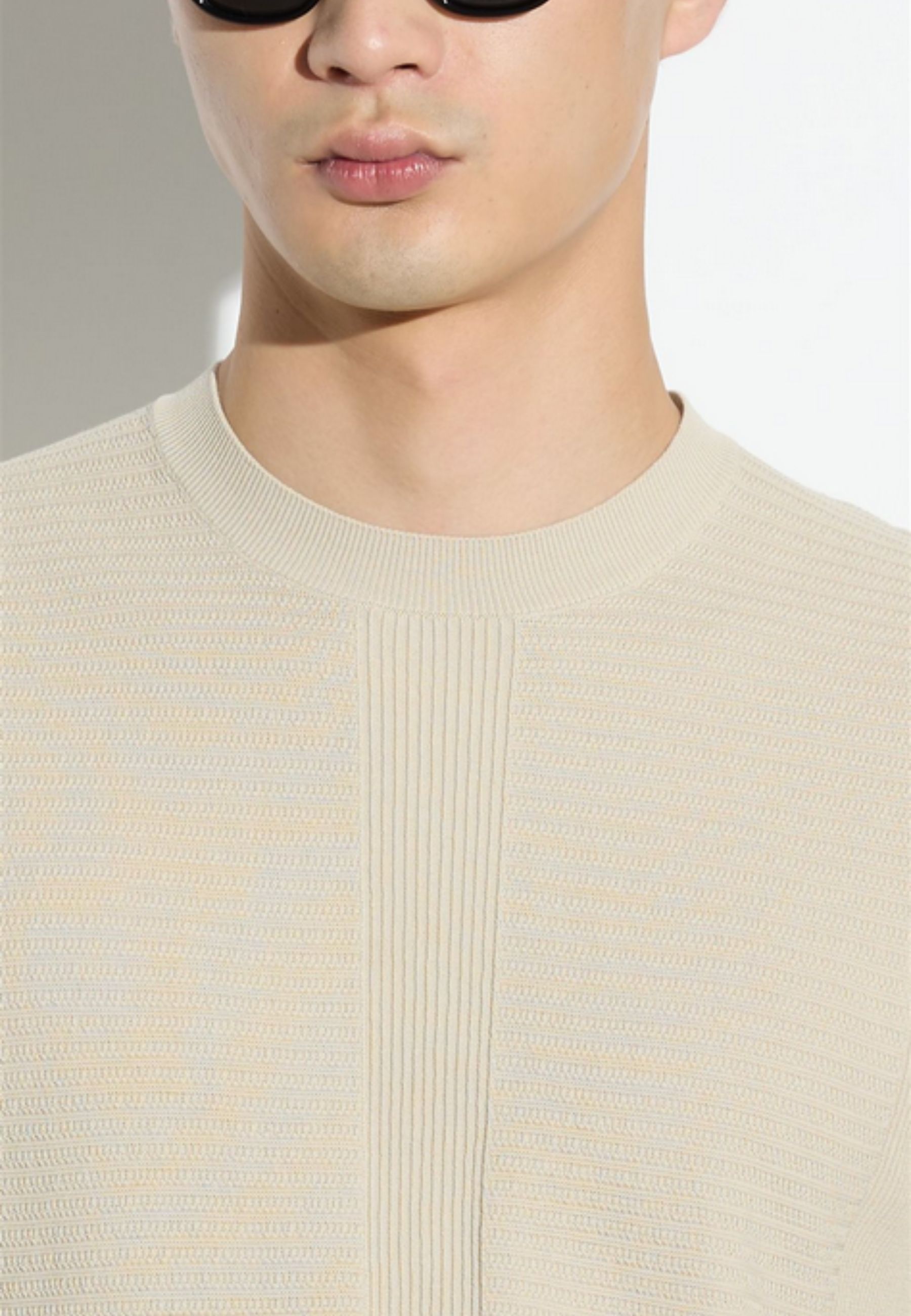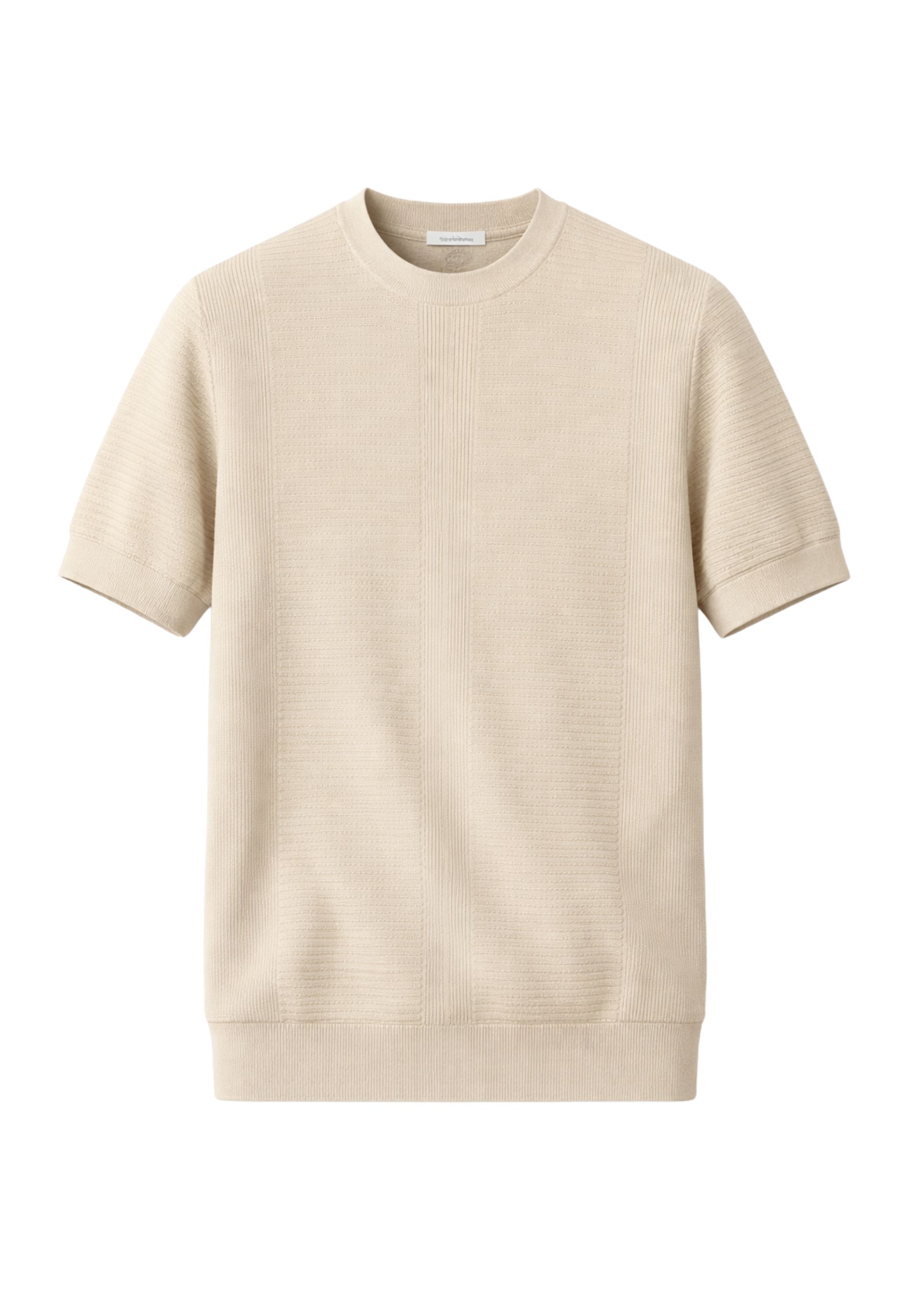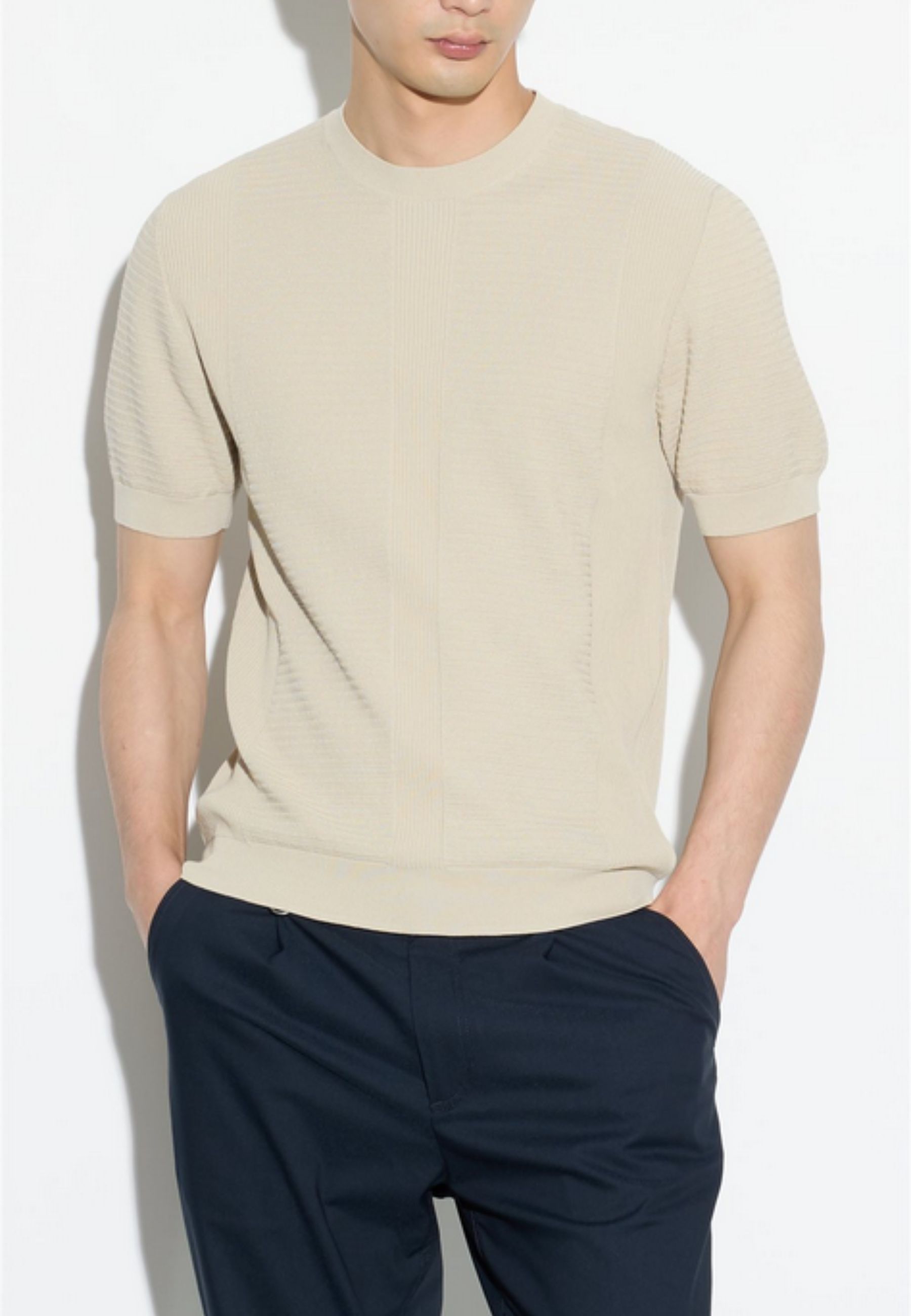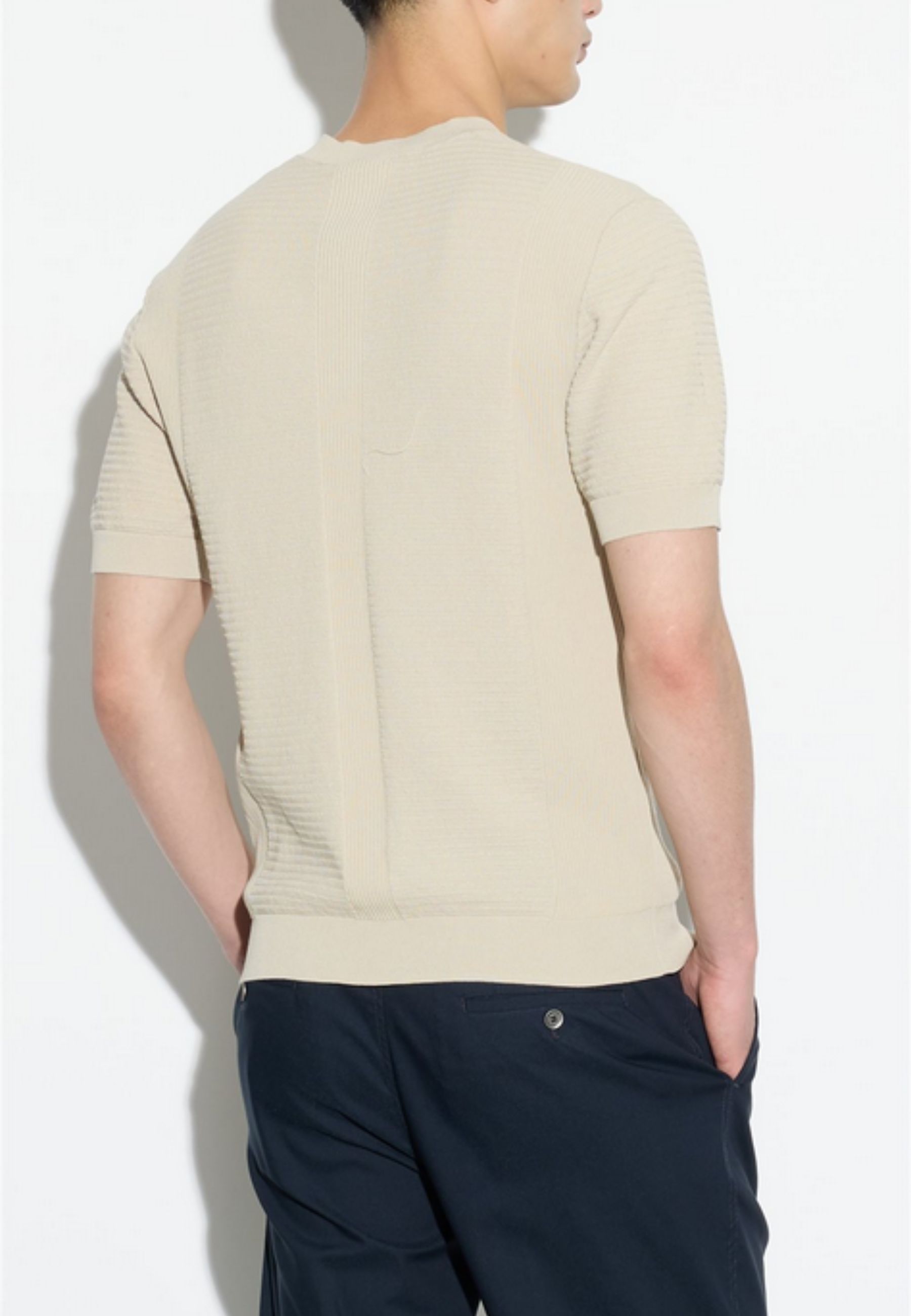 Maglia a maniche corte firmata Paolo Pecora, caratterizzata da un design essenziale e contemporaneo. Il modello presenta lavorazione testurizzata con pannelli verticali che valorizzano la struttura del capo, collo, fondo e polsini rifiniti a costina per una vestibilità ordinata e definita.