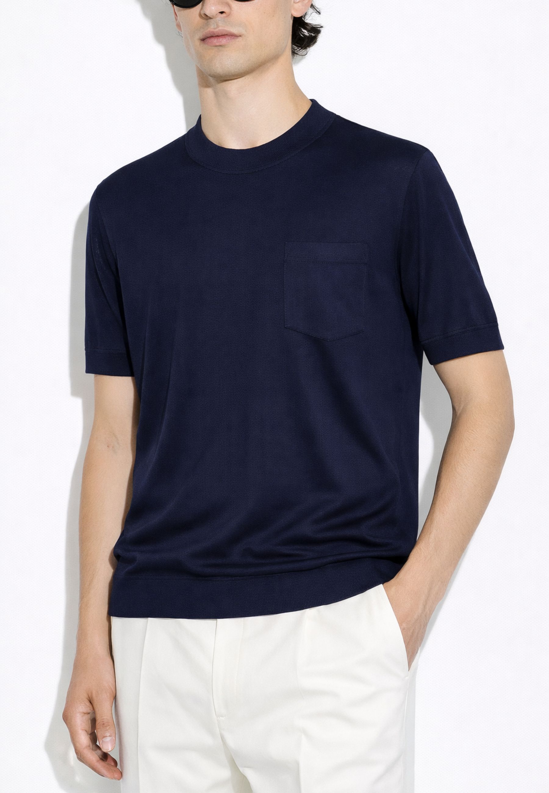 T-shirt uomo Paolo Pecora a manica corta, caratterizzata da una linea essenziale e da uneleganza contemporanea. Il design minimal è valorizzato dal girocollo rifinito a costina e dal taschino applicato sul petto, dettaglio discreto che arricchisce il capo senza appesantirne lo stile.