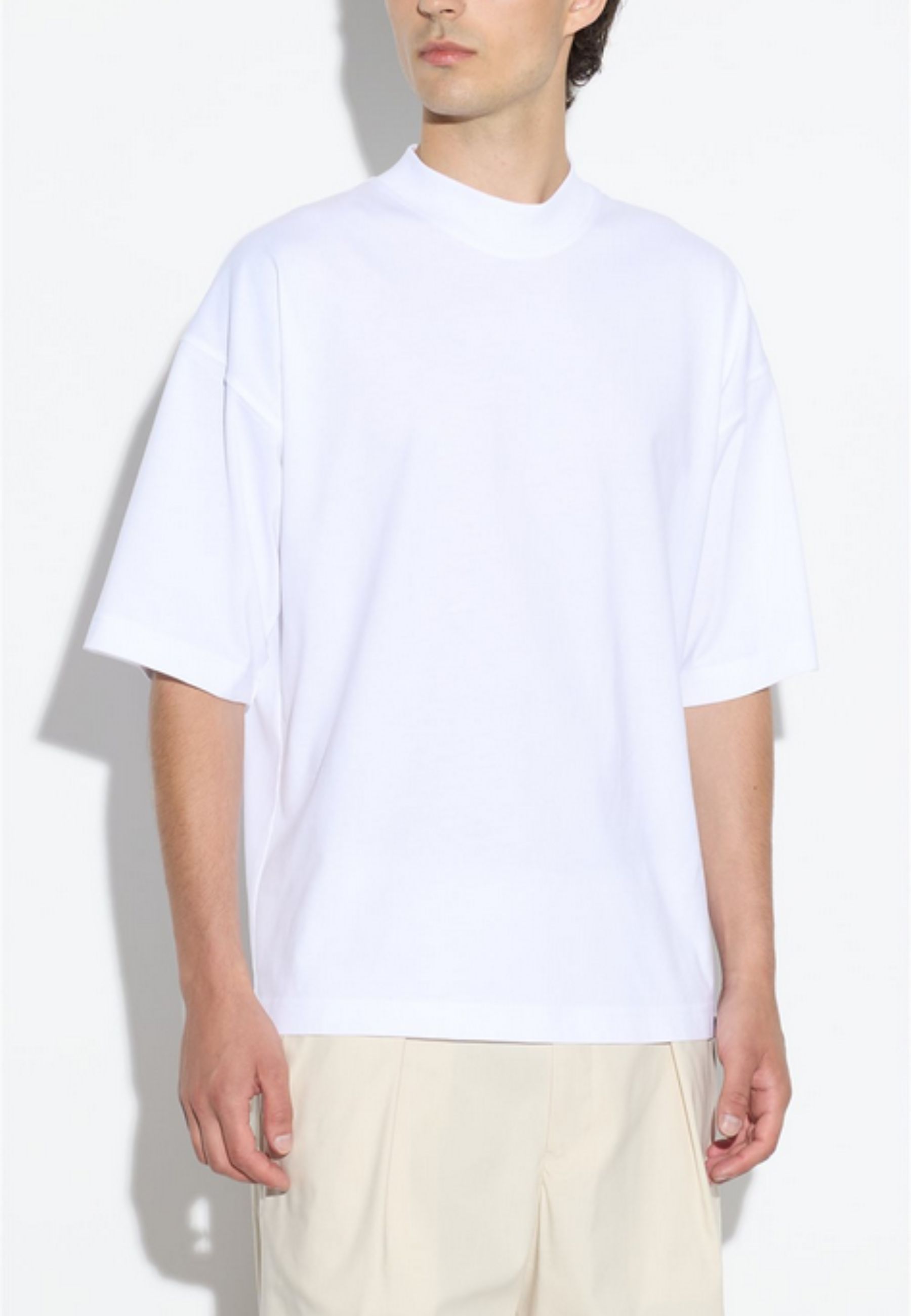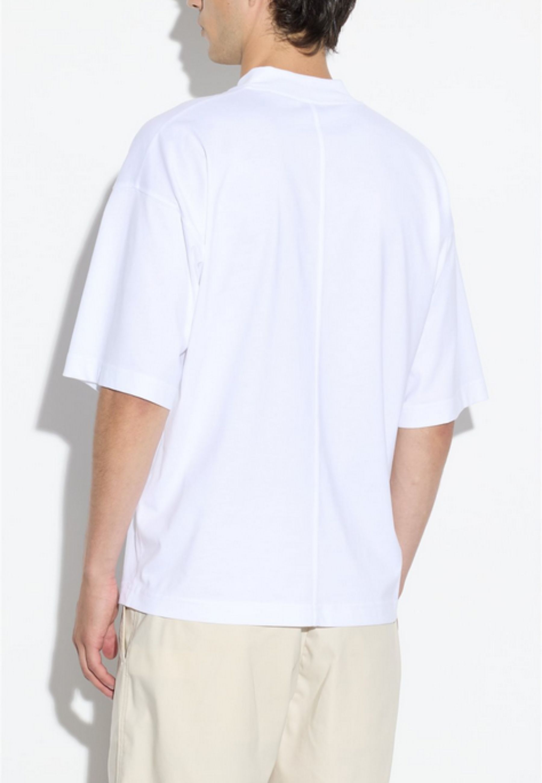 T-shirt a maniche corte firmata Paolo Pecora, caratterizzata da vestibilità oversize con spalla leggermente scesa e linea morbida, espressione di unestetica contemporanea e minimale. Il girocollo rifinito a costina e lorlo dritto definiscono un design pulito e bilanciato.
