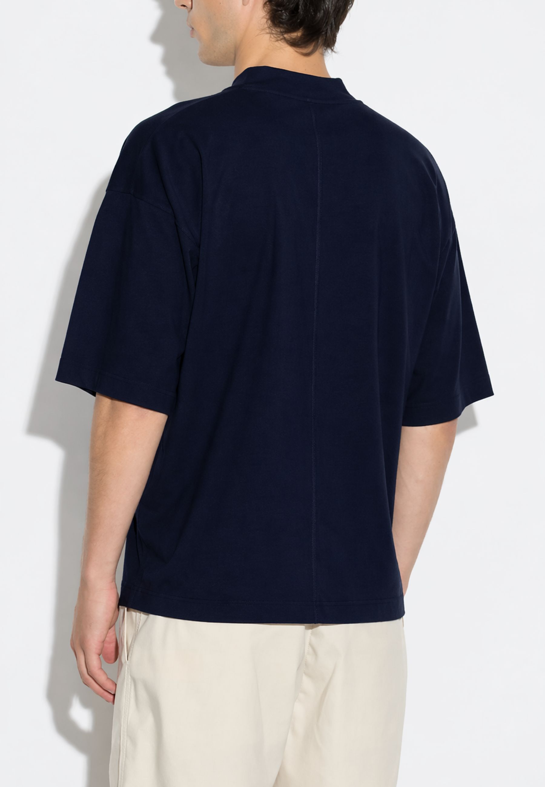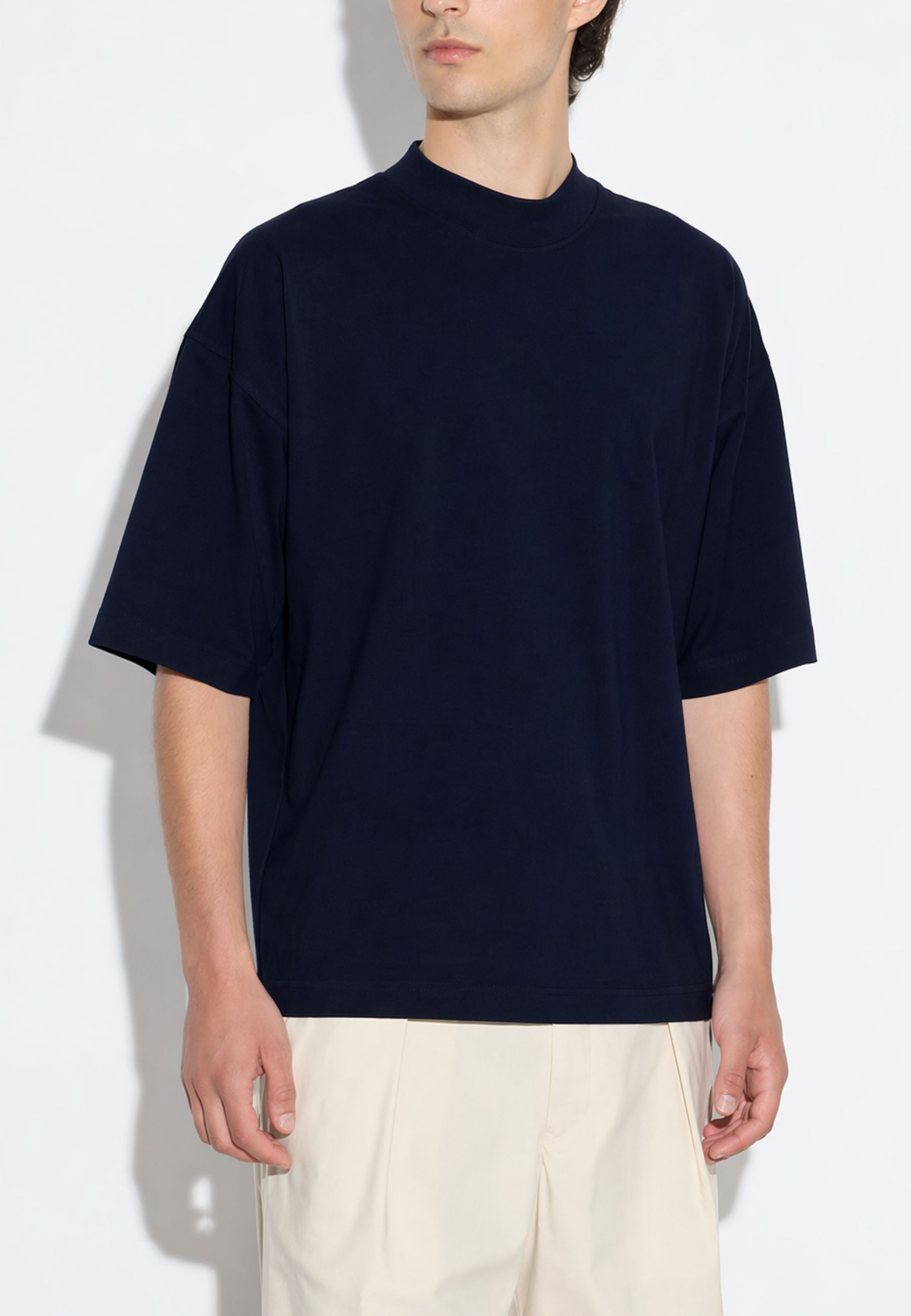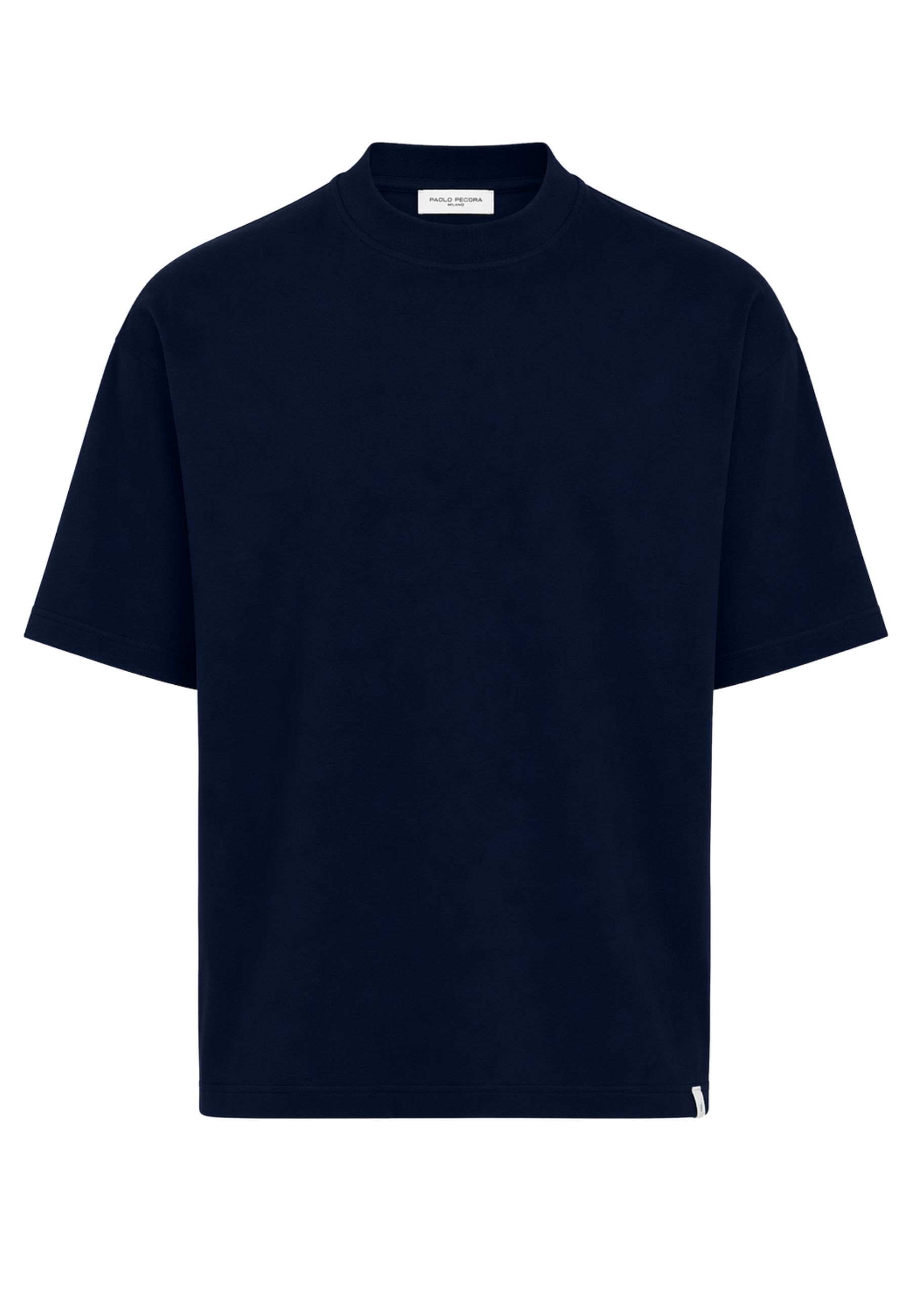 T-shirt a maniche corte firmata Paolo Pecora, caratterizzata da vestibilità oversize con spalla leggermente scesa e linea morbida, espressione di unestetica contemporanea e minimale. Il girocollo rifinito a costina e lorlo dritto definiscono un design pulito e bilanciato.