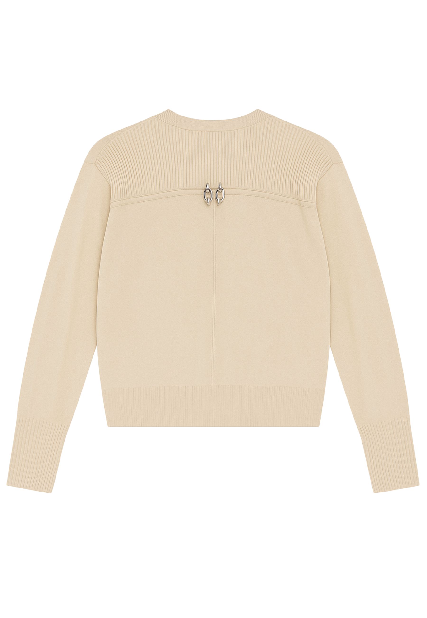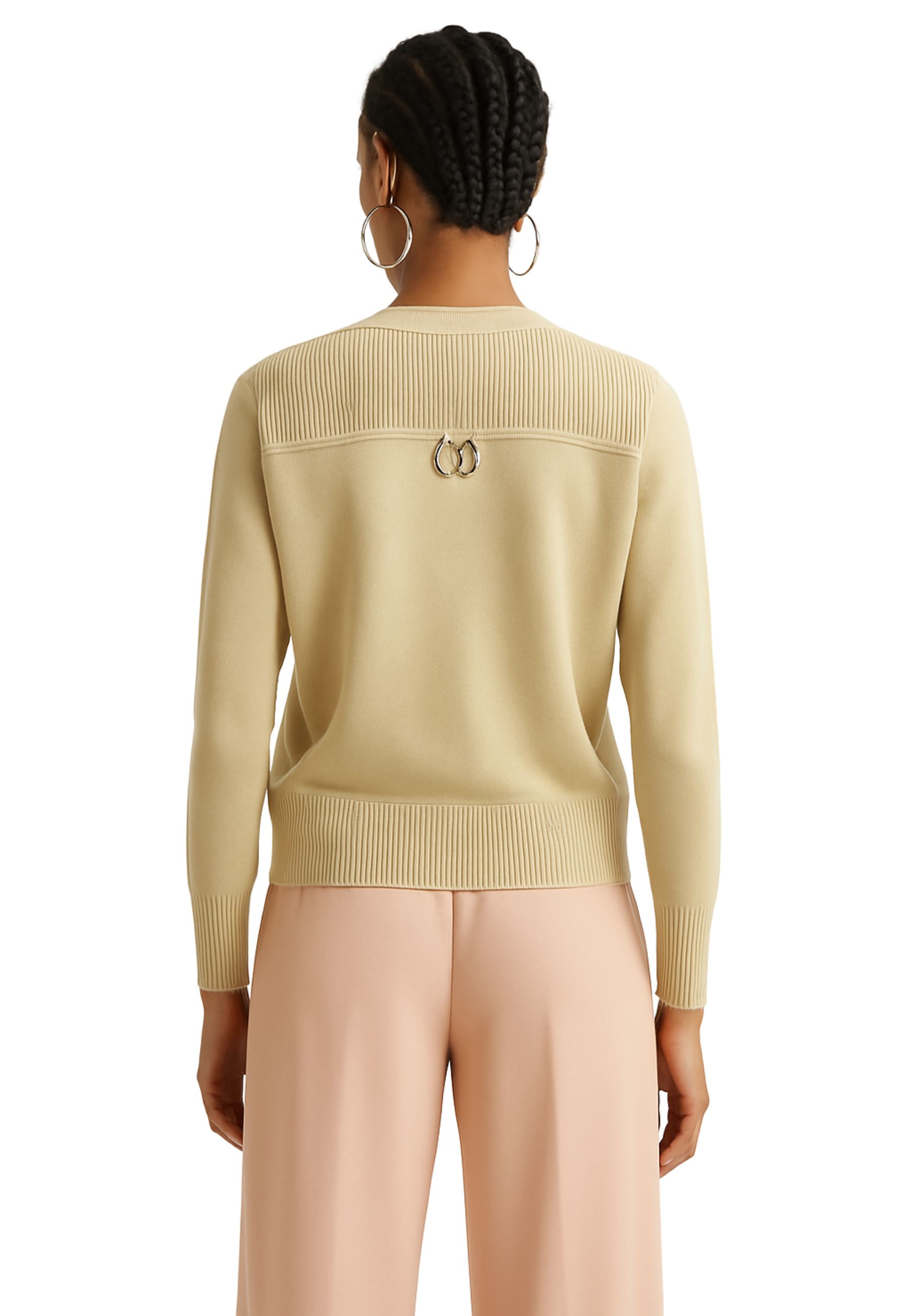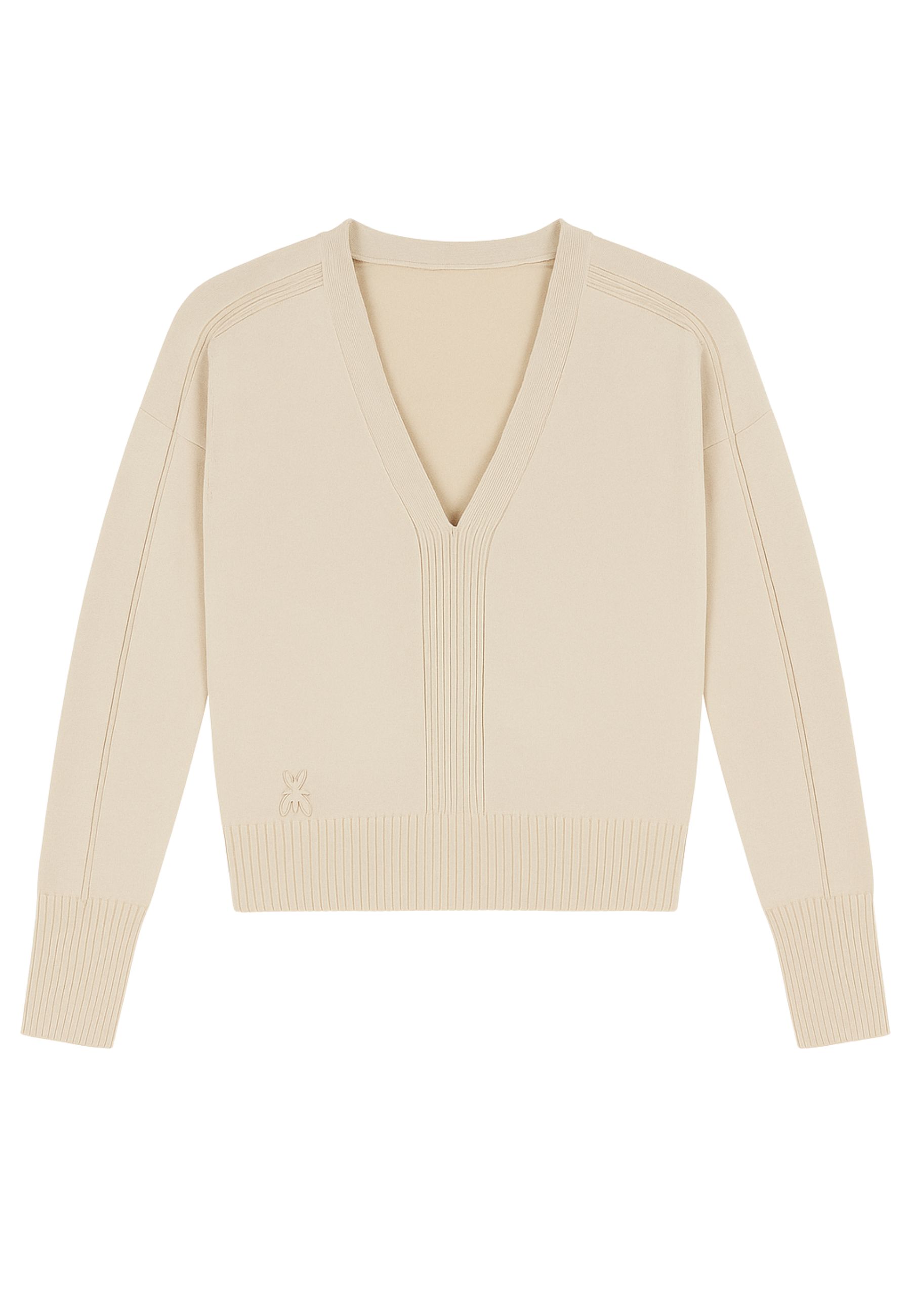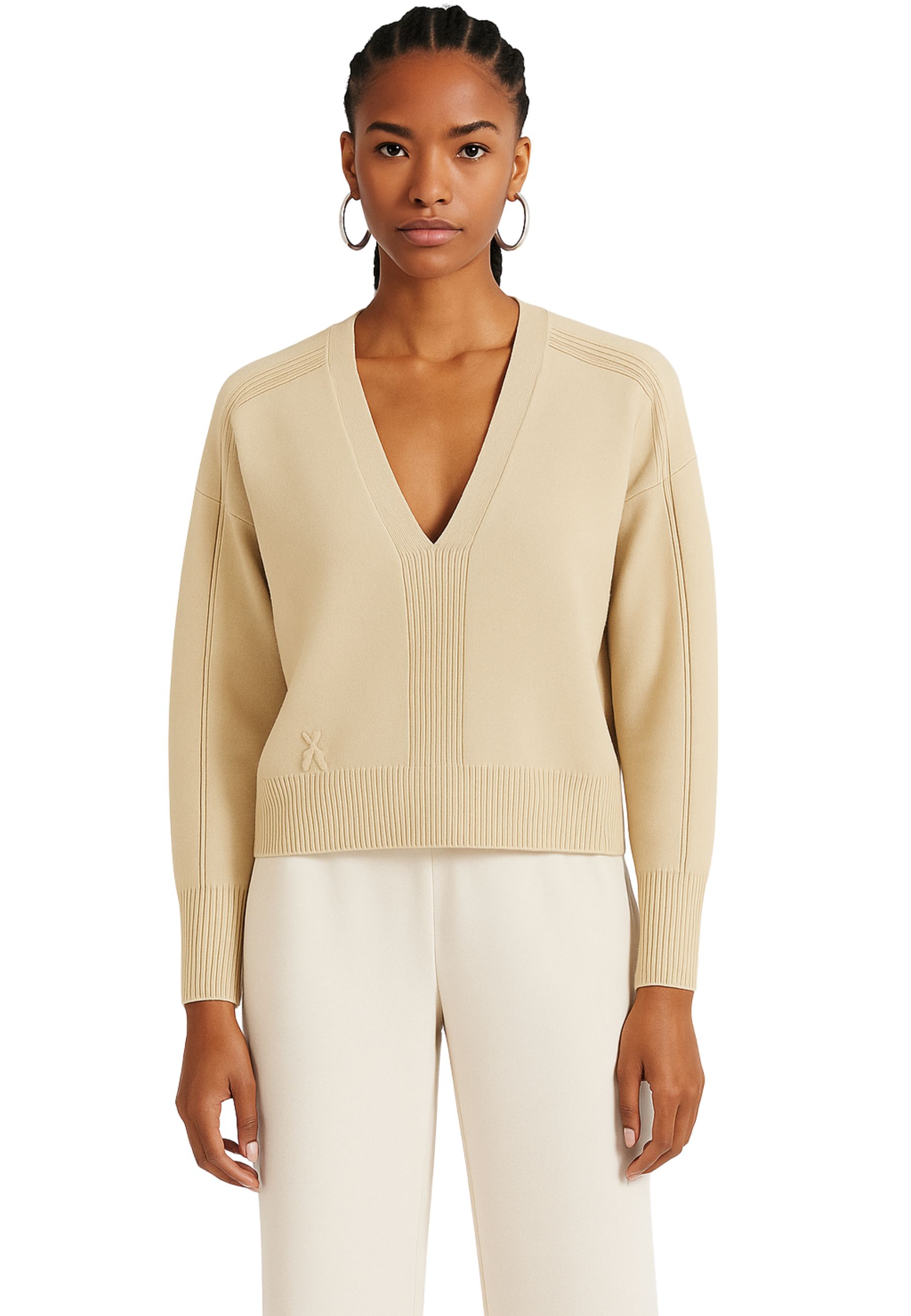 Maglia in filo di cotone firmata Patrizia Pepe, dallo stile essenziale e raffinato, perfetta per un look primaverile elegante e versatile. Realizzata in morbido cotone lavorato a maglia fine, presenta una profonda scollatura a V che valorizza la figura con discrezione. Il design è arricchito da dettagli a costine su scollo, polsini e fondo, oltre a una piccola applicazione logo tono su tono sul fianco. Vestibilità regolare e taglio leggermente corto, ideale da abbinare sia a pantaloni sartoriali che a gonne a vita alta.