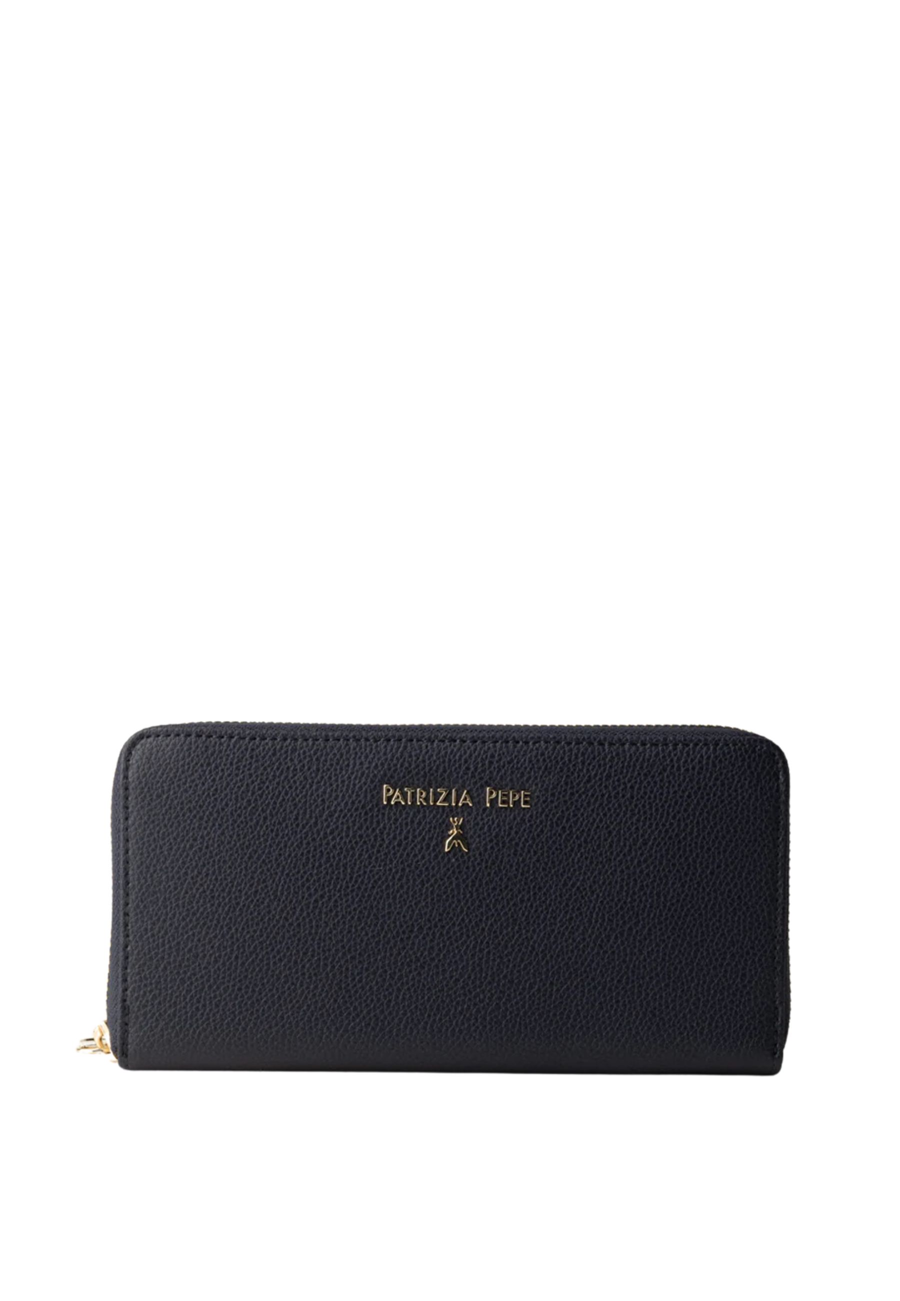 Eleganza essenziale e funzionalità quotidiana definiscono questo portafoglio lungo Patrizia Pepe, realizzato in pelle martellata di alta qualità. Il design pulito è valorizzato dal lettering Patrizia Pepe con iconico Fly in metallo dorato, elemento distintivo che dona un tocco luminoso e sofisticato.