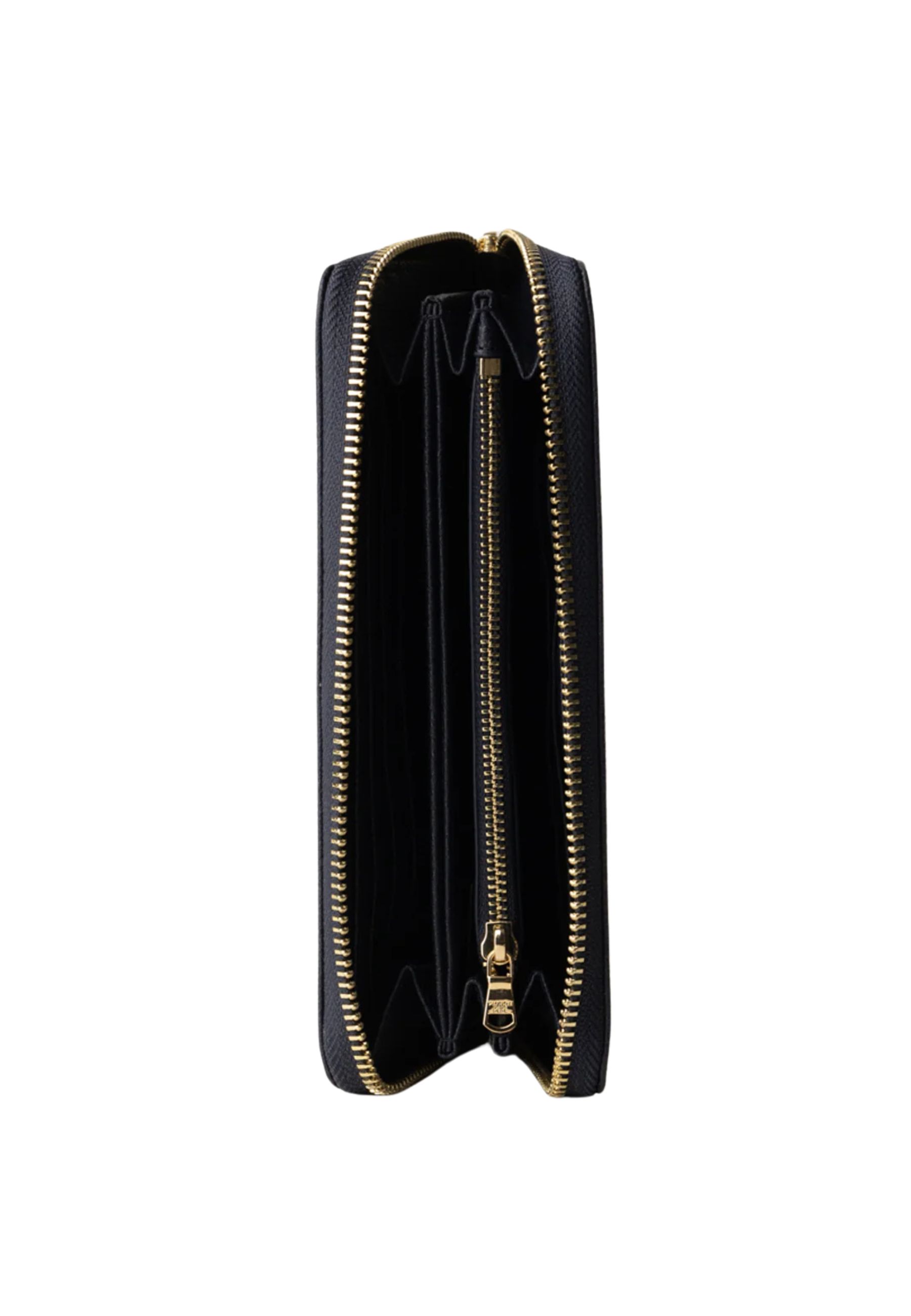 Interno con slot per carte, scomparti per banconote e tasca centrale con zip