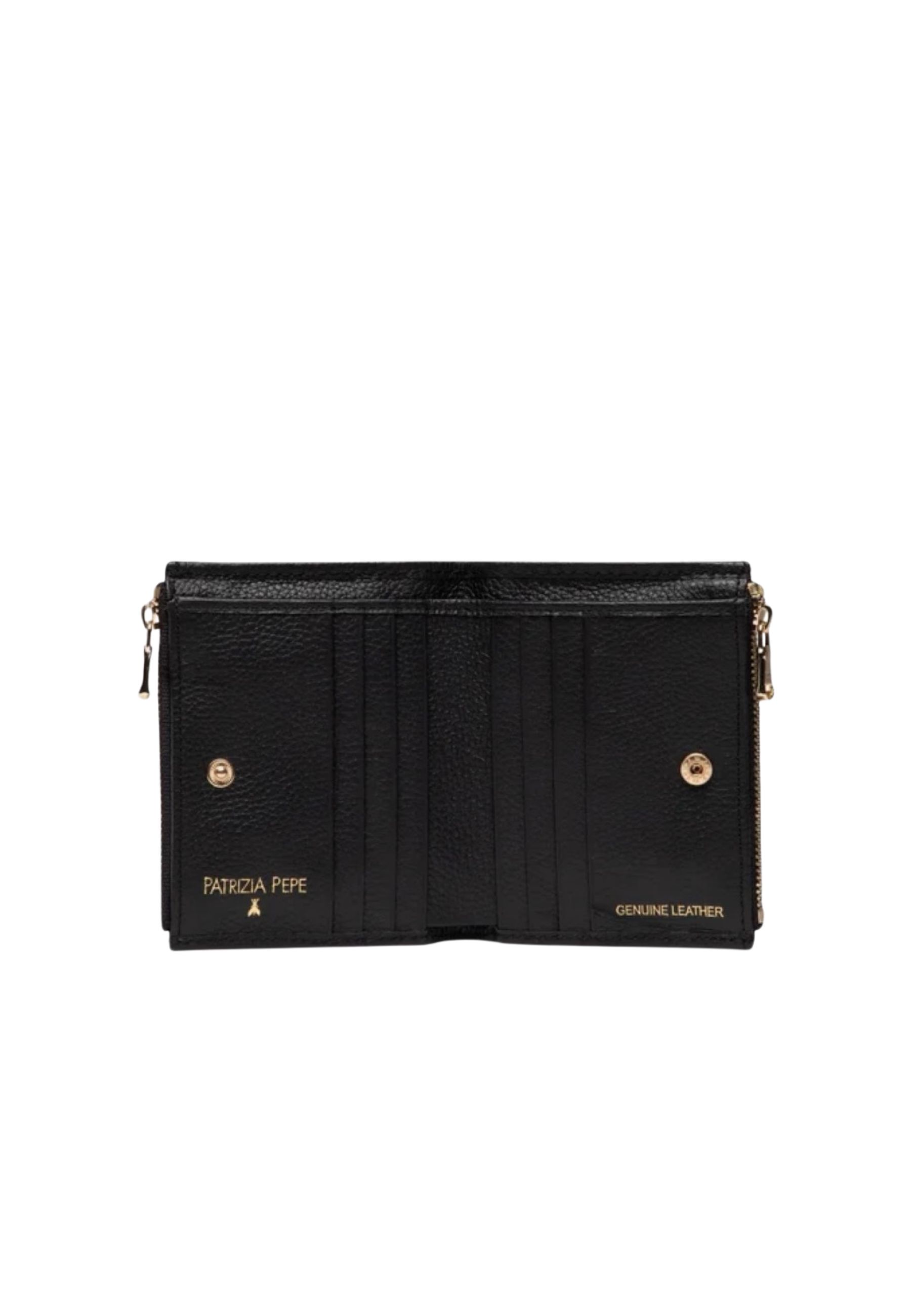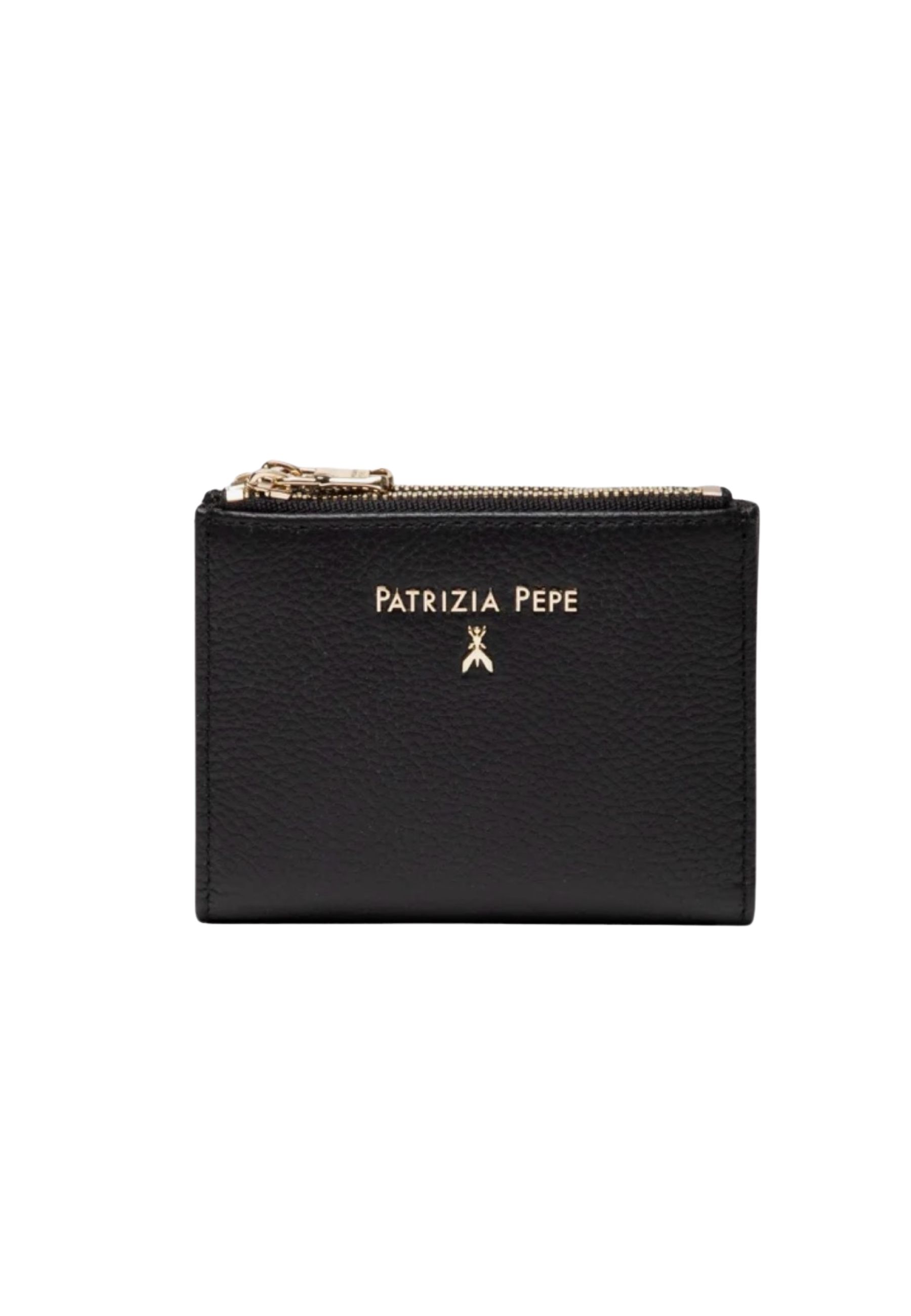 Il portafoglio piccolo Patrizia Pepe è un accessorio compatto ed elegante, pensato per chi desidera funzionalità e stile in un formato pratico da portare sempre con sé. Realizzato in pelle martellata, si distingue per la texture raffinata e resistente, valorizzata dal lettering Patrizia Pepe e dalliconico simbolo Fly in metallo dorato sul fronte.