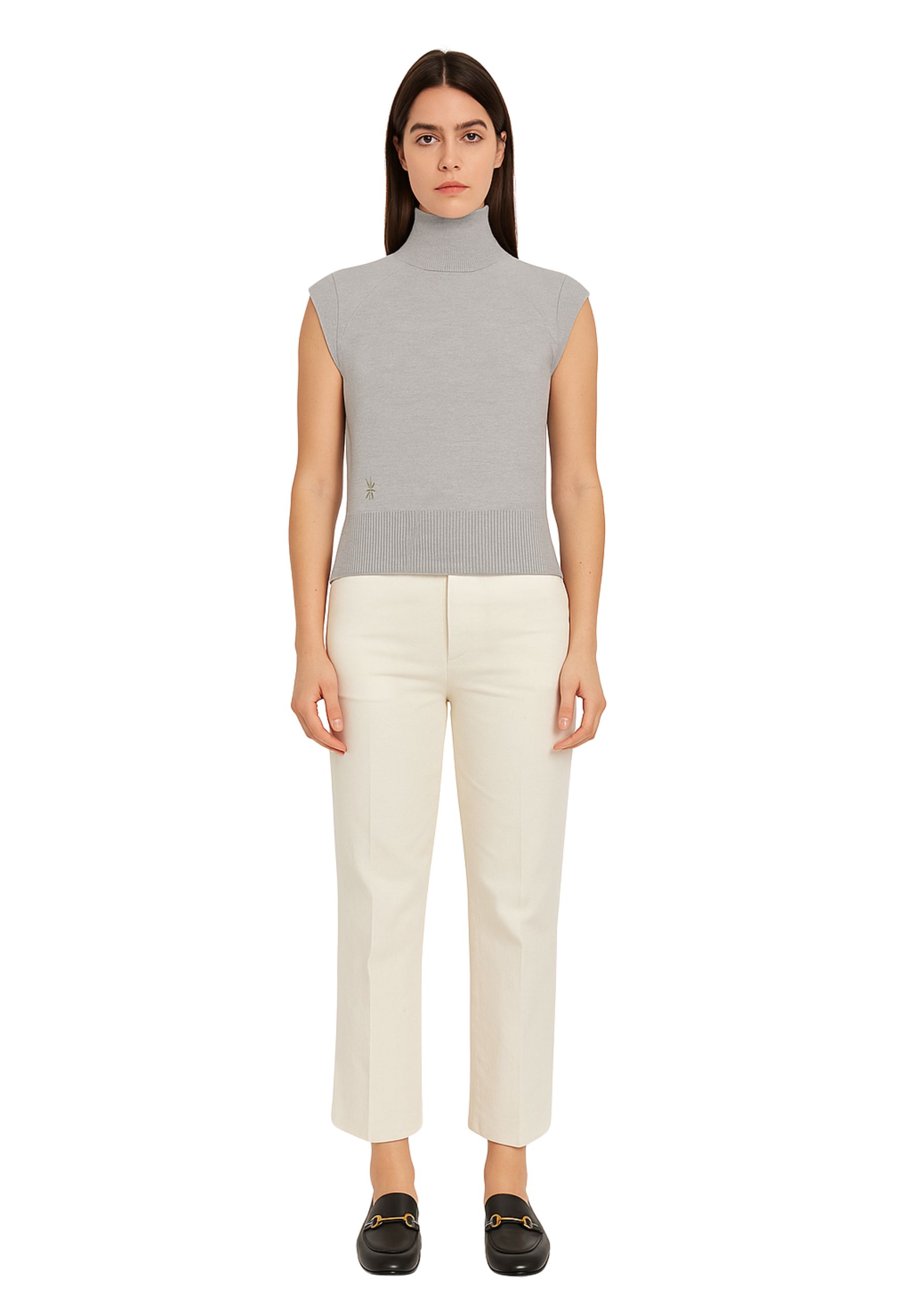 Top smanicato firmato Patrizia Pepe, realizzato in maglia fine dal design essenziale e contemporaneo. Il modello presenta collo alto a lupetto e spalle leggermente strutturate, per una linea pulita e sofisticata che valorizza la figura con discrezione.