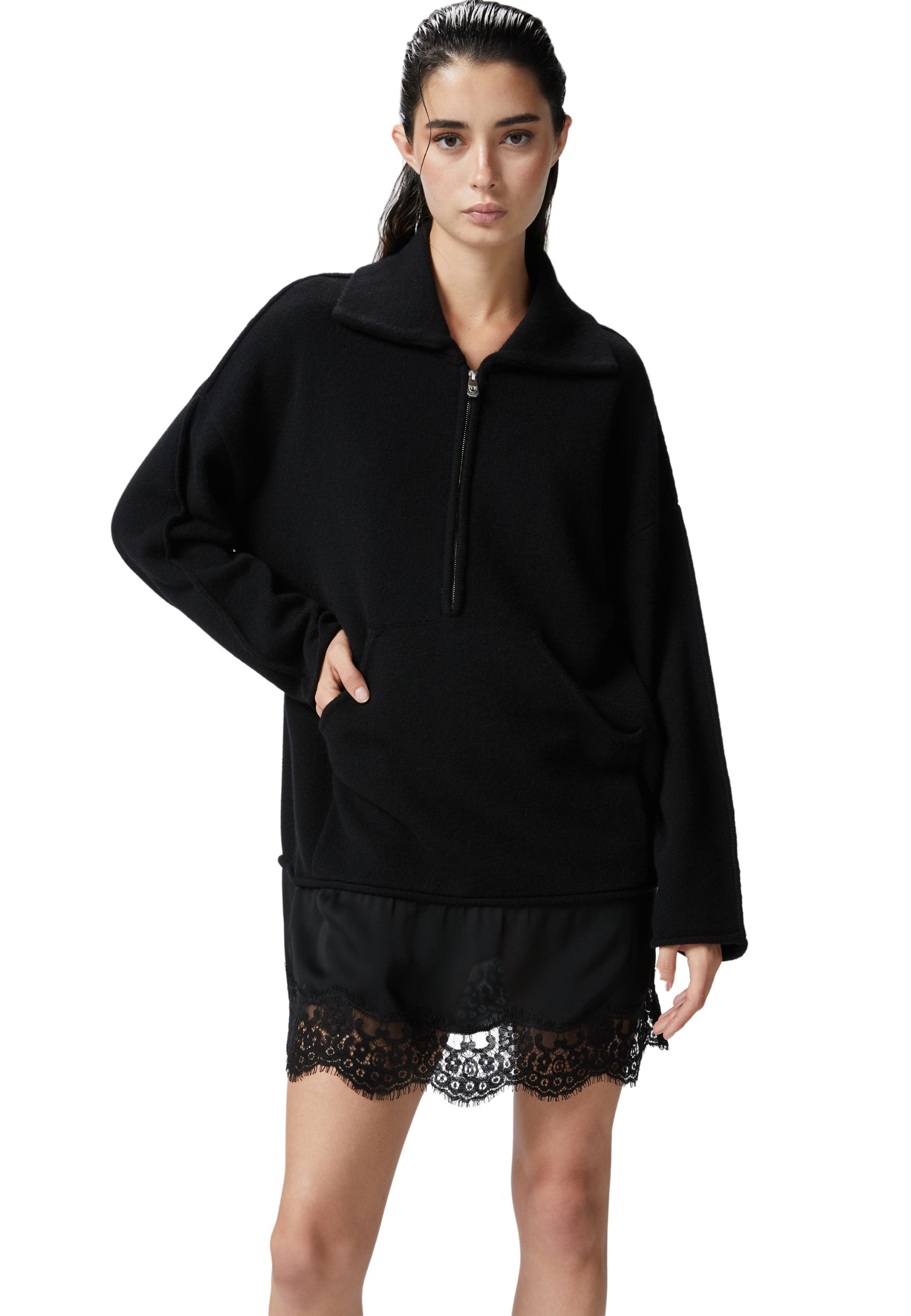 Abito corto da donna caratterizzato da effetto trompe l'oeil: l'abito è infatti realizzato in modo da ricreare l'effetto di una maglia in misto lana e cachemire con collo a camicia zippato indossata su una minigonna in satin di viscosa con pizzo al fondo. Il volume morbido della maglia è completata da maniche lunghe e tasca a marsupio davanti, e crea un contrasto di stile con la parte inferiore, femminile e intrigante.