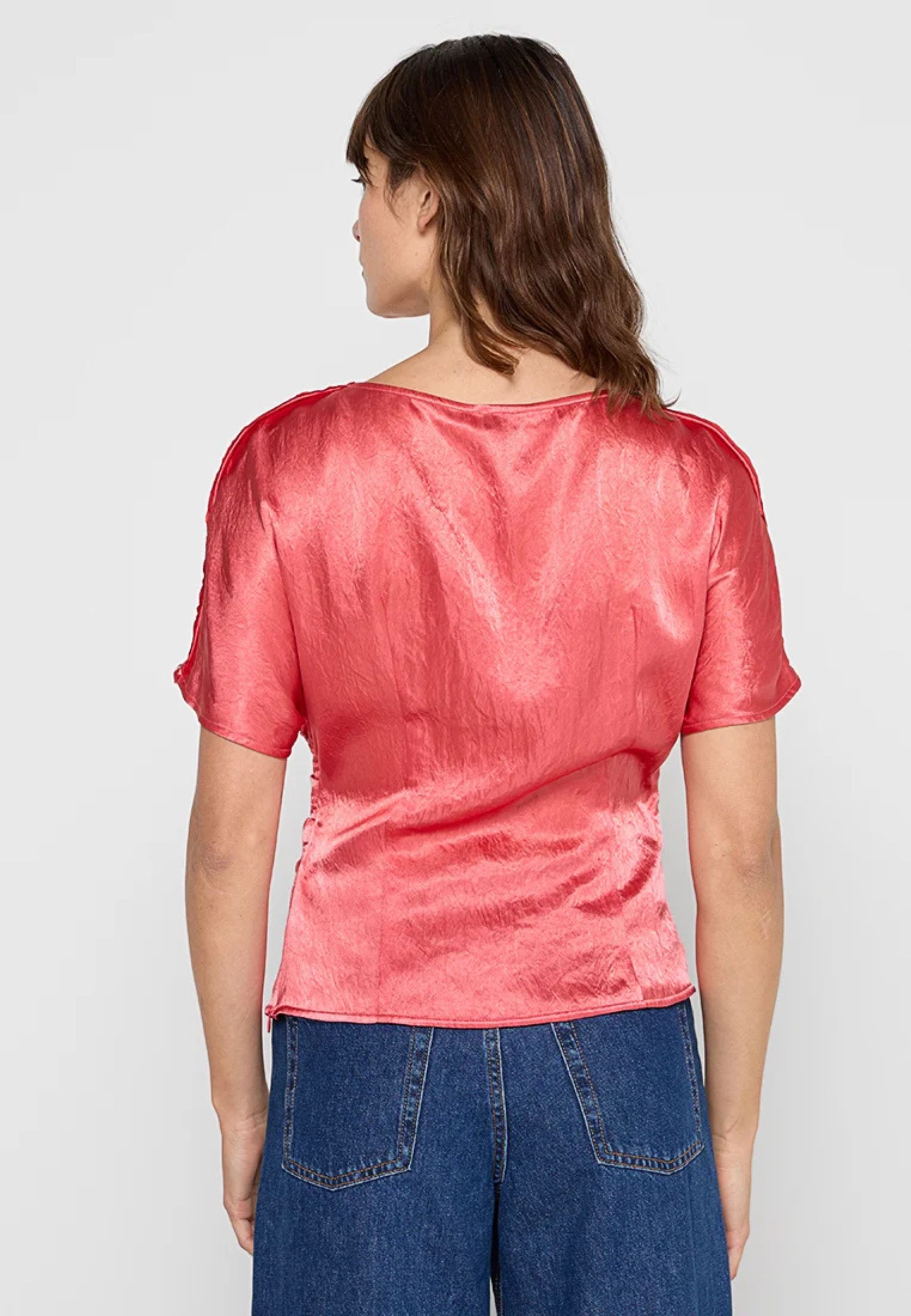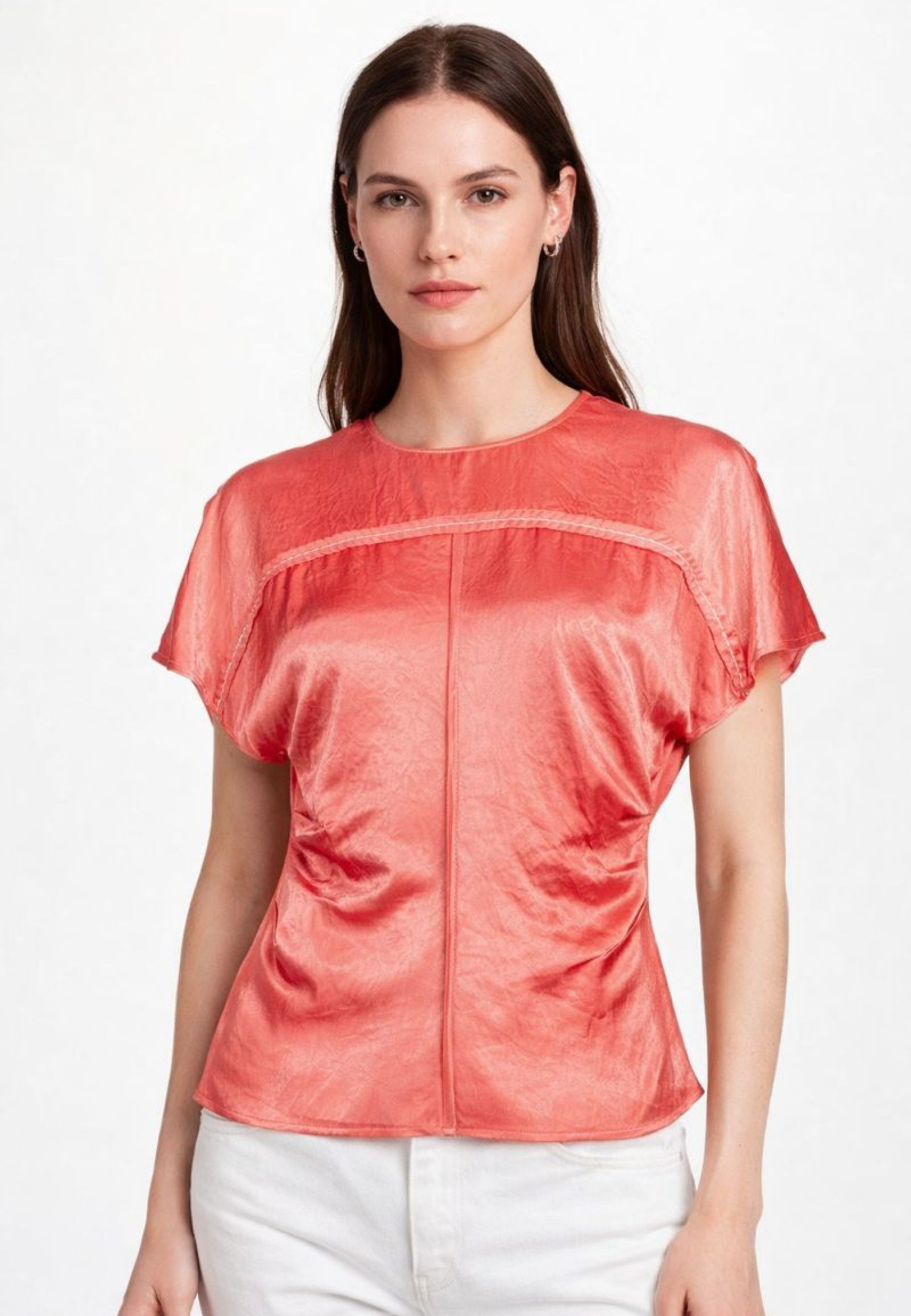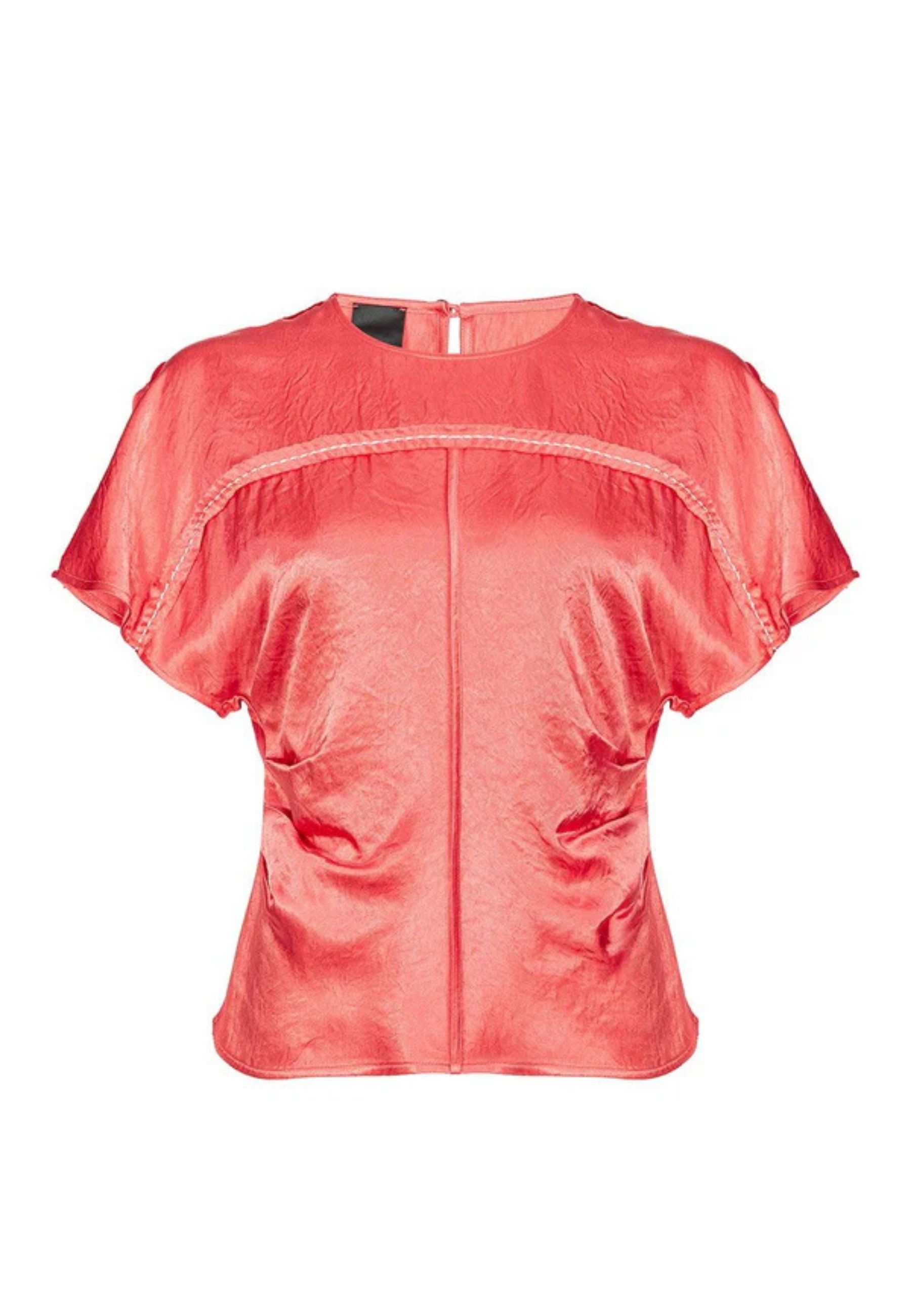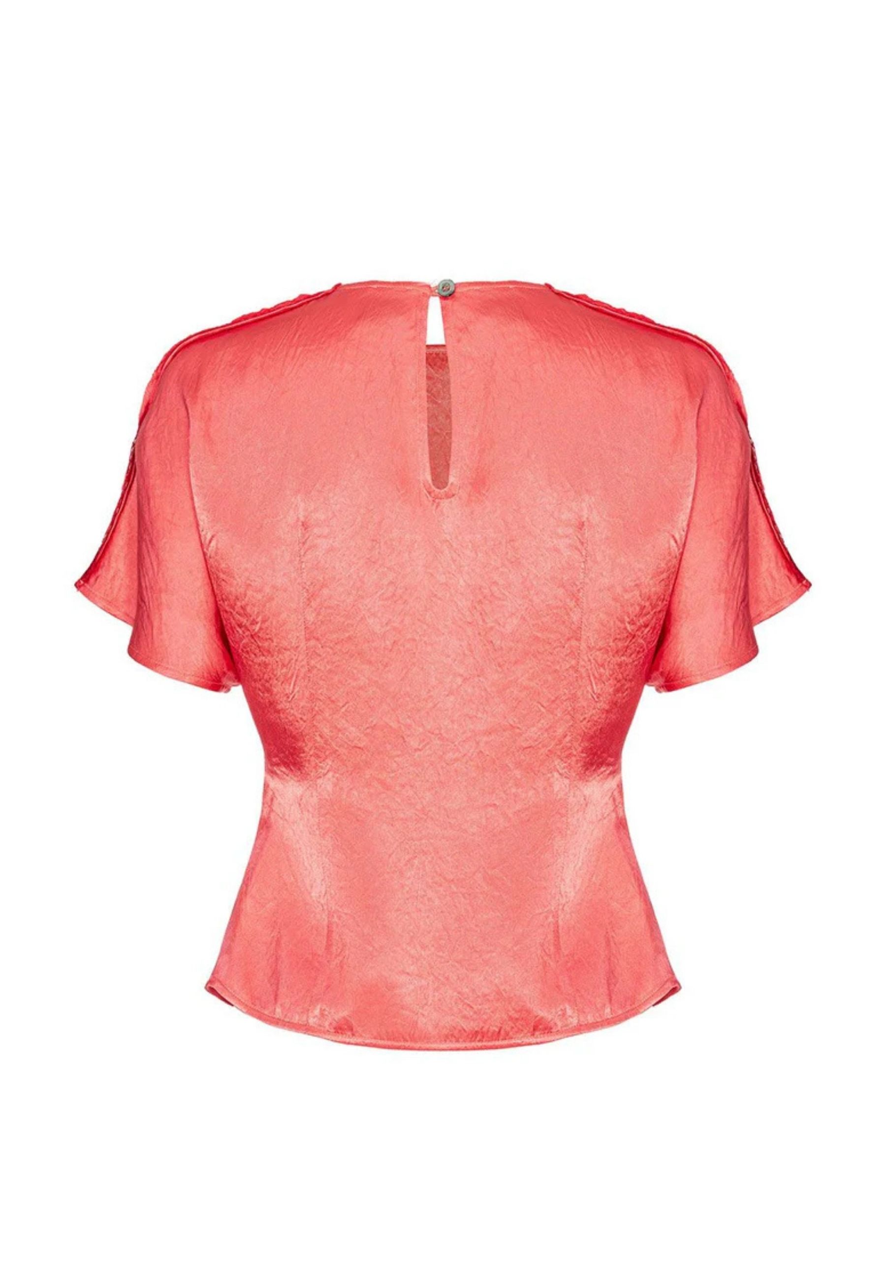 Blusa PINKO, modello Blasco, realizzata in tessuto leggero e fluido dallaspetto leggermente mosso, che dona al capo uneleganza naturale e raffinata. Il design presenta girocollo pulito, maniche corte ampie e una linea femminile che valorizza la silhouette con discrezione. Sul davanti spicca un raffinato inserto orizzontale decorativo che definisce il busto e aggiunge un dettaglio distintivo al capo. Il retro è completato da una piccola apertura con chiusura a bottone, che facilita la vestizione e aggiunge un tocco delicato.