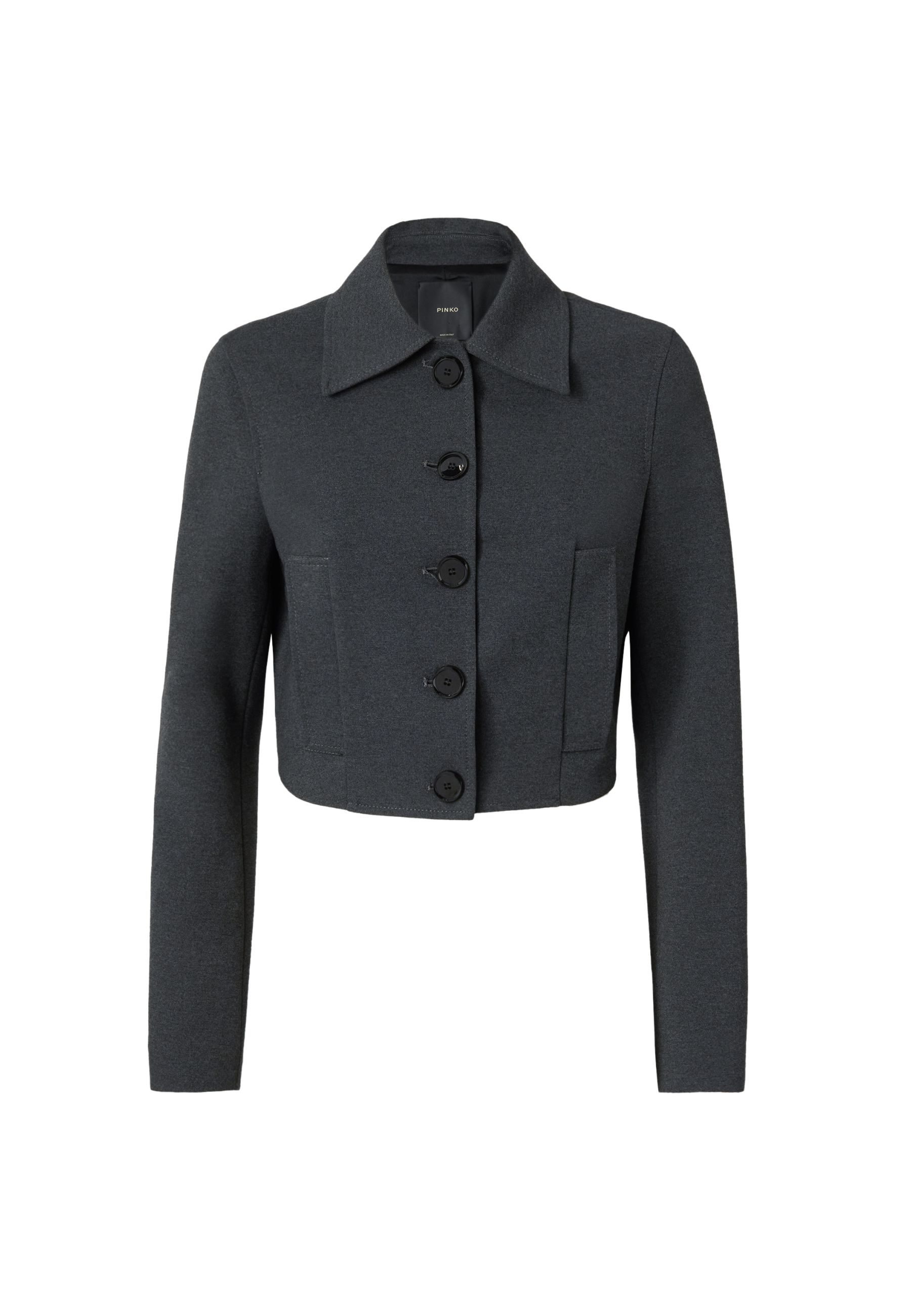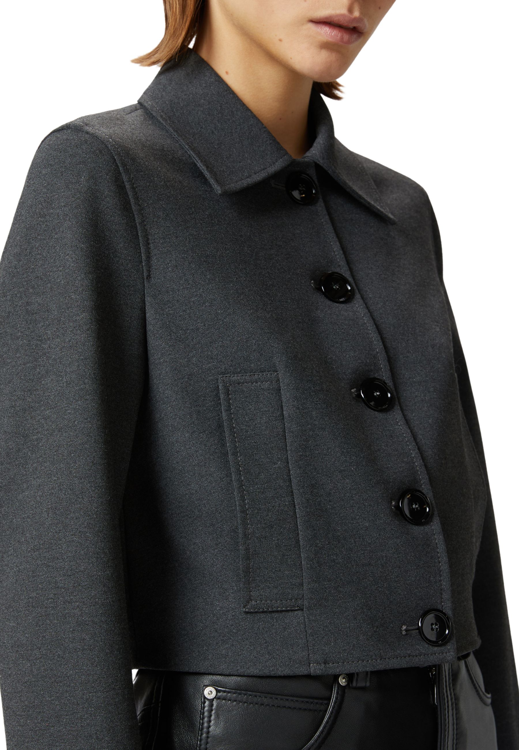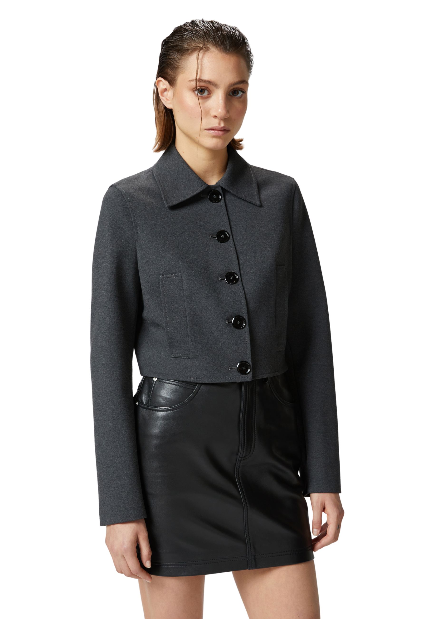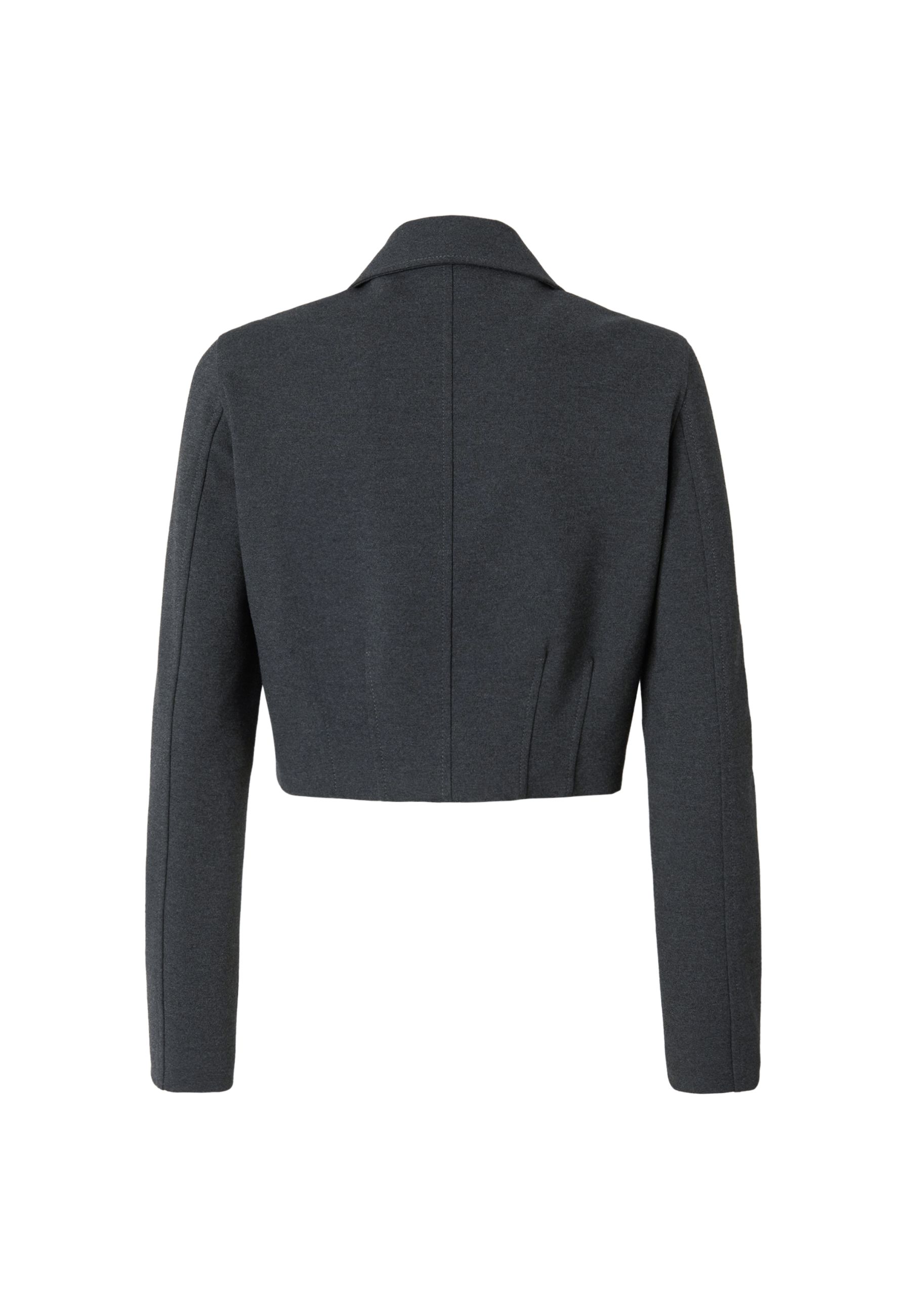 Giacca monopetto dal taglio corto in tessuto tecnico di viscosa stretch lavorato a punto stoffa. La silhouette pulita è completata da colletto a camicia, maniche a giro e tasche a filetto verticale sui fianchi. La giacca è foderata. Chiusura con bottoni davanti. Il tessuto principale è realizzato con il 67% di viscosa da foreste gestite responsabilmente.