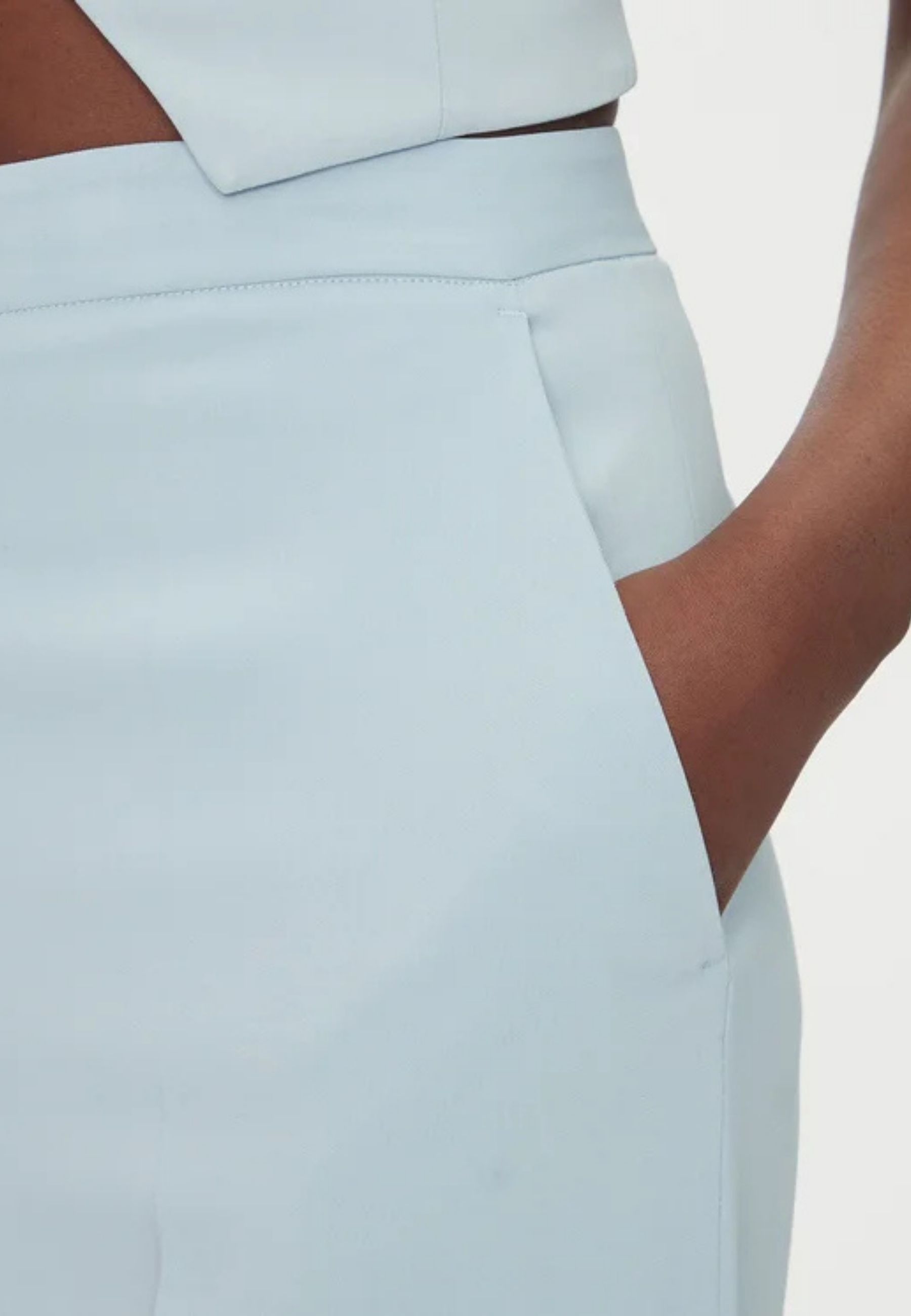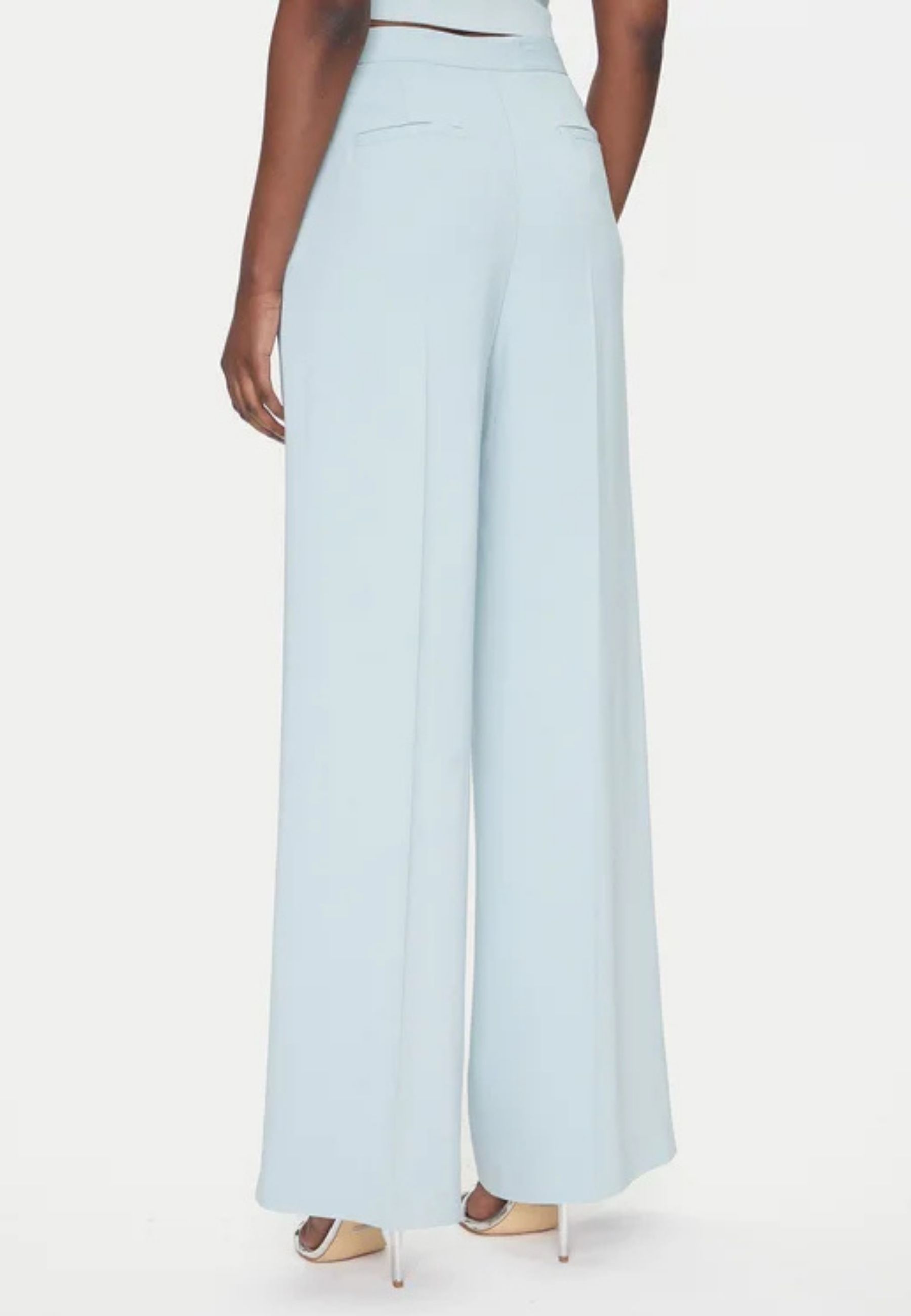 Il modello presenta vita alta e linea palazzo, con gamba ampia valorizzata dalla piega stirata centrale sia sul fronte che sul retro, dettaglio sartoriale che slancia la silhouette. Completano il design le due tasche America anteriori, le tasche posteriori a filetto, e la chiusura con zip e gancio, per una finitura pulita ed essenziale.