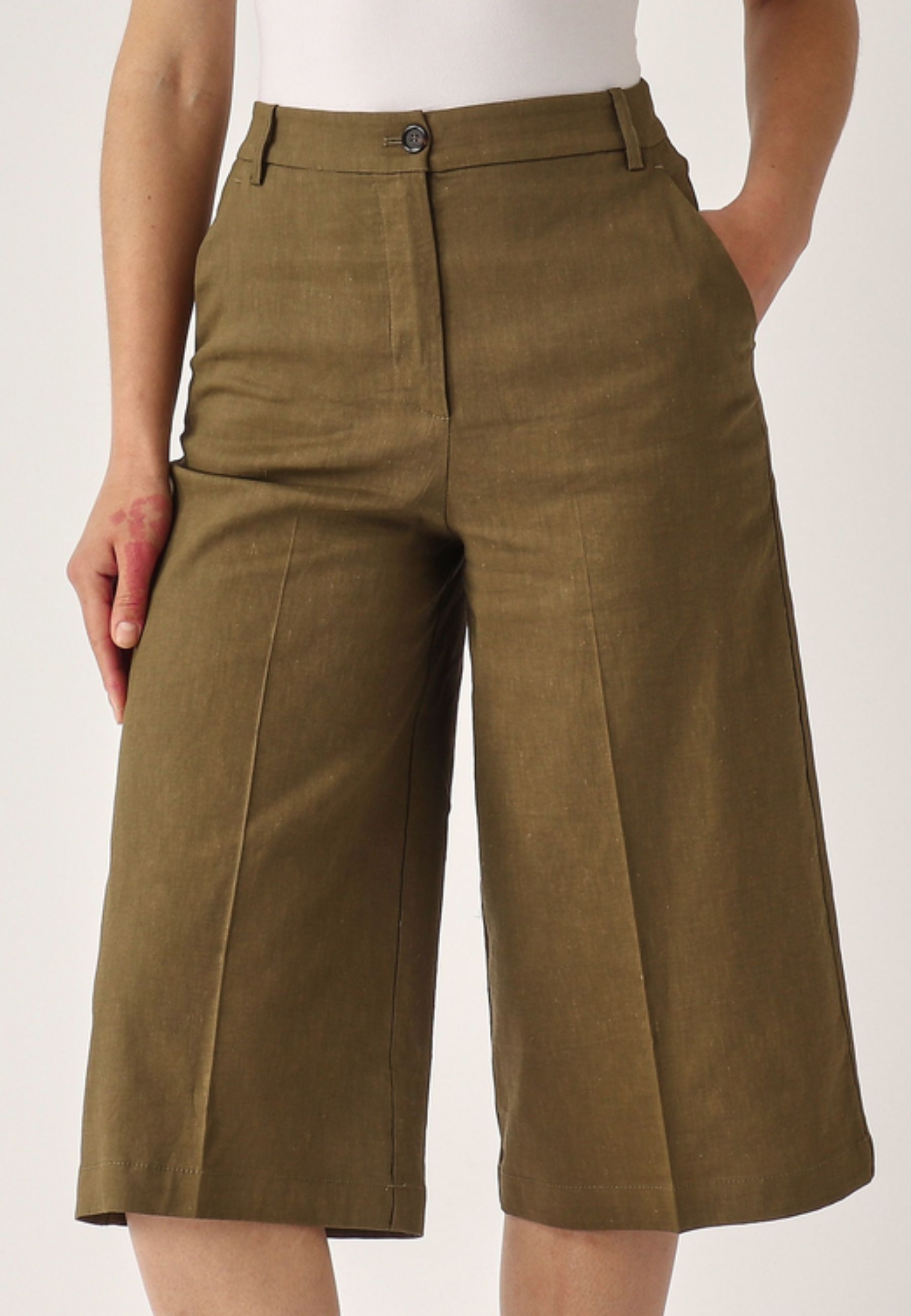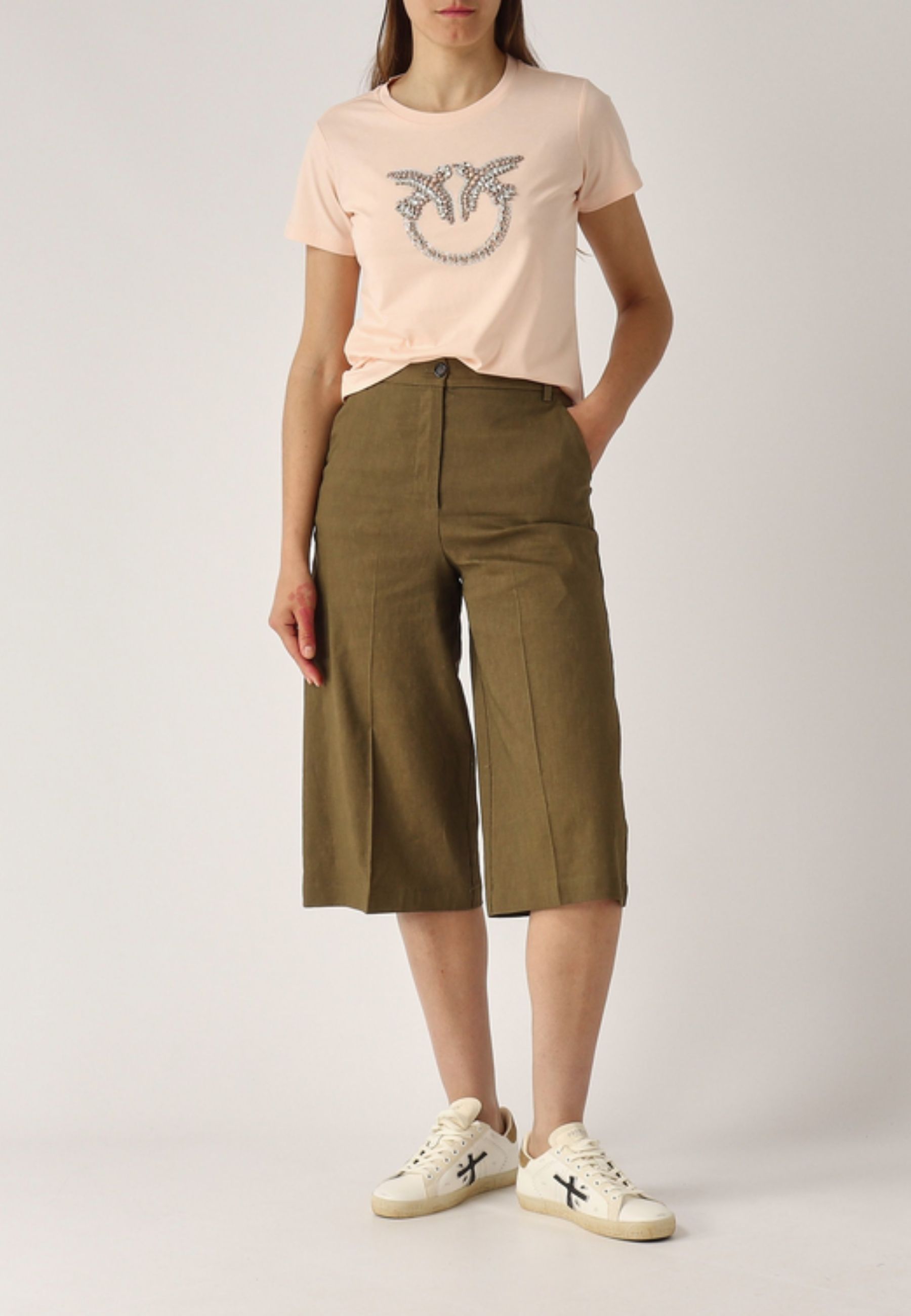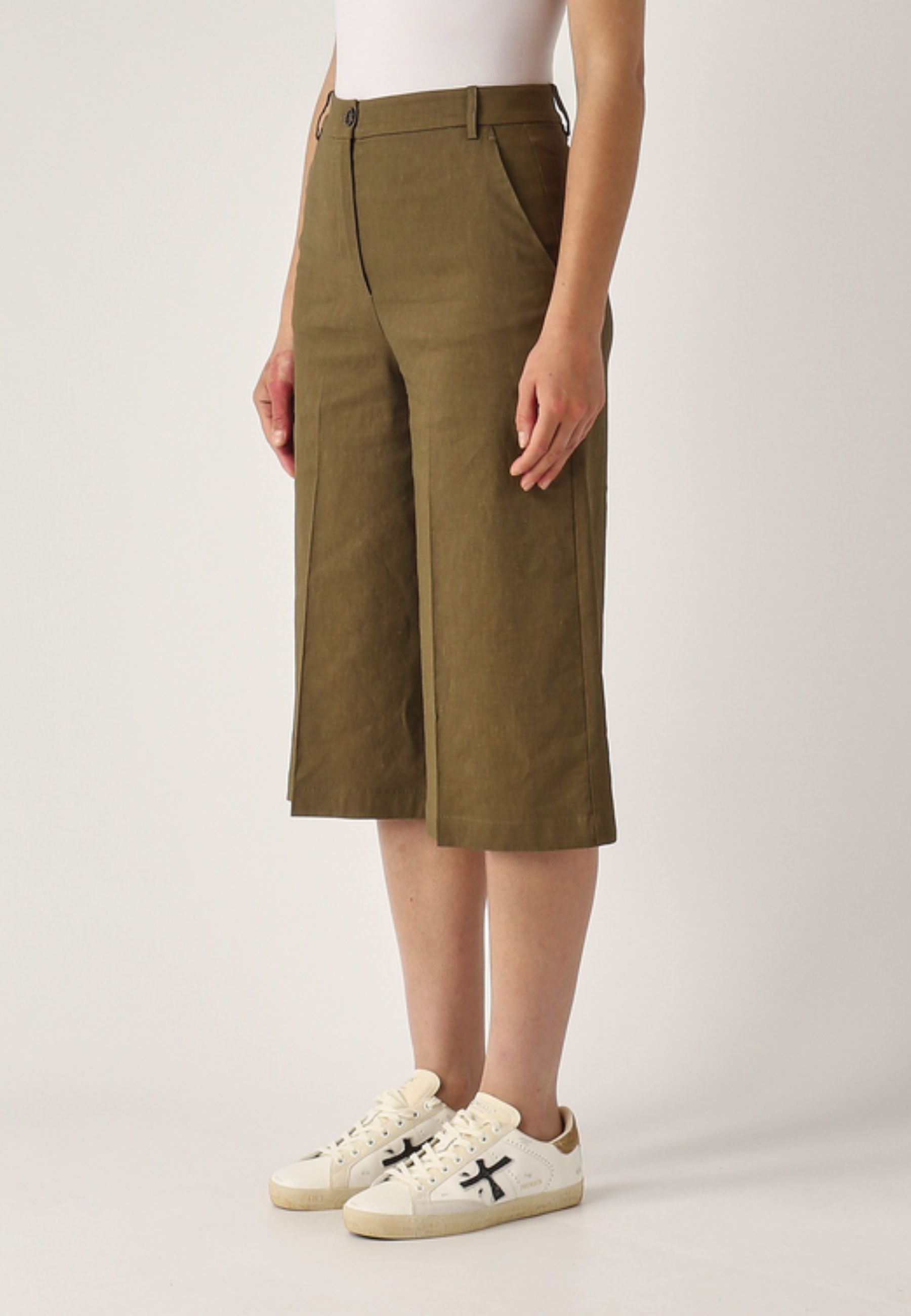 Il design cropped, con lunghezza fino a metà polpaccio, è caratterizzato da un volume ampio sul fondo che crea una raffinata shape a trapezio. La vita alta e aderente valorizza la silhouette, mentre la piega stirata centrale sia sul fronte che sul retro aggiunge un tocco sartoriale ed elegante.