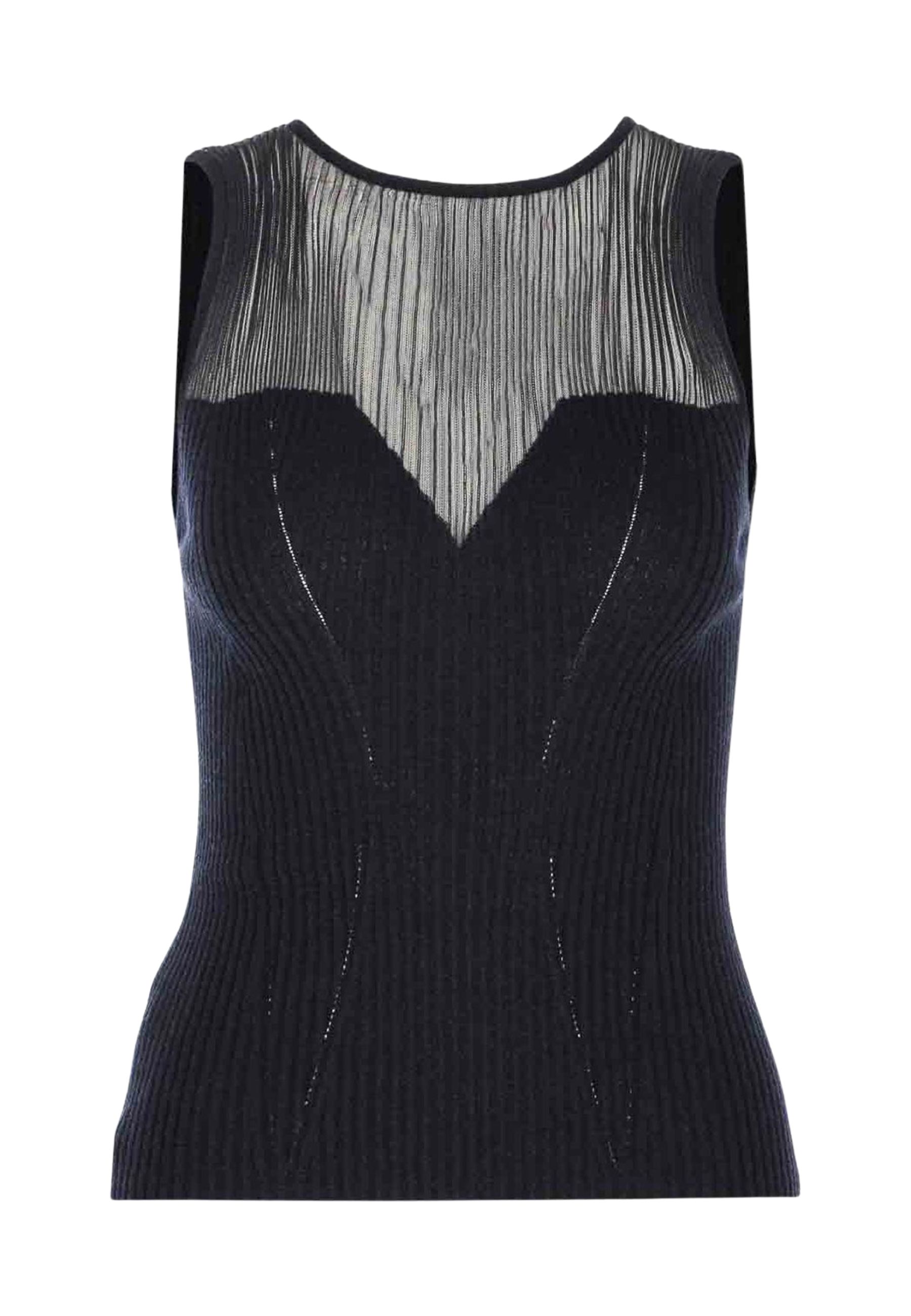 Top donna SHISPARE realizzato in un pregiato blend di lana con seta e cashmere, pensato per offrire comfort, qualità e una vestibilità elegante. Il modello presenta una linea slim fit che segue armoniosamente la silhouette, valorizzata da una lavorazione a coste e da inserti trasparenti sul décolleté che creano un raffinato effetto vedo-non-vedo.