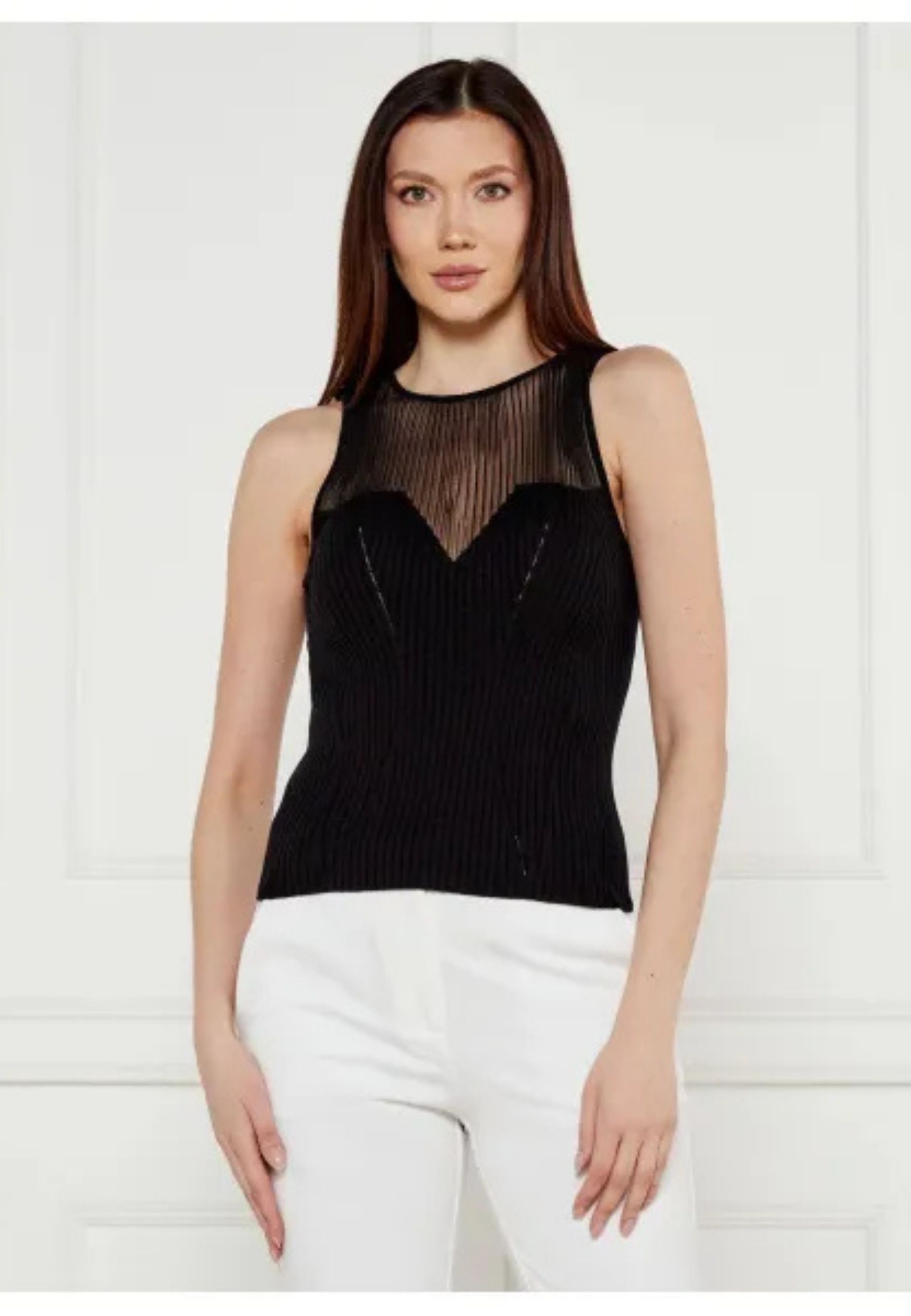 Il design smanicato e il gioco di materiali conferiscono al capo unestetica sofisticata e contemporanea, rendendolo ideale sia come top protagonista sia abbinato a blazer o capispalla per look più strutturati. Un capo versatile, adatto a contesti eleganti e a styling moderni.