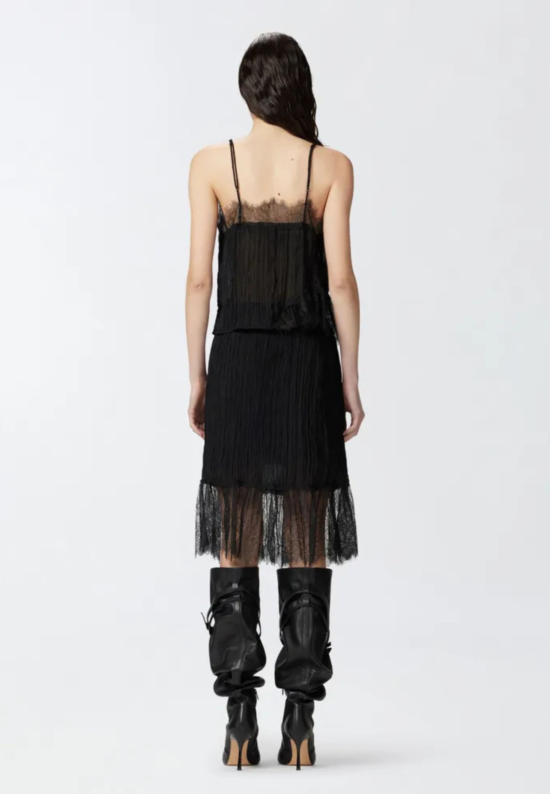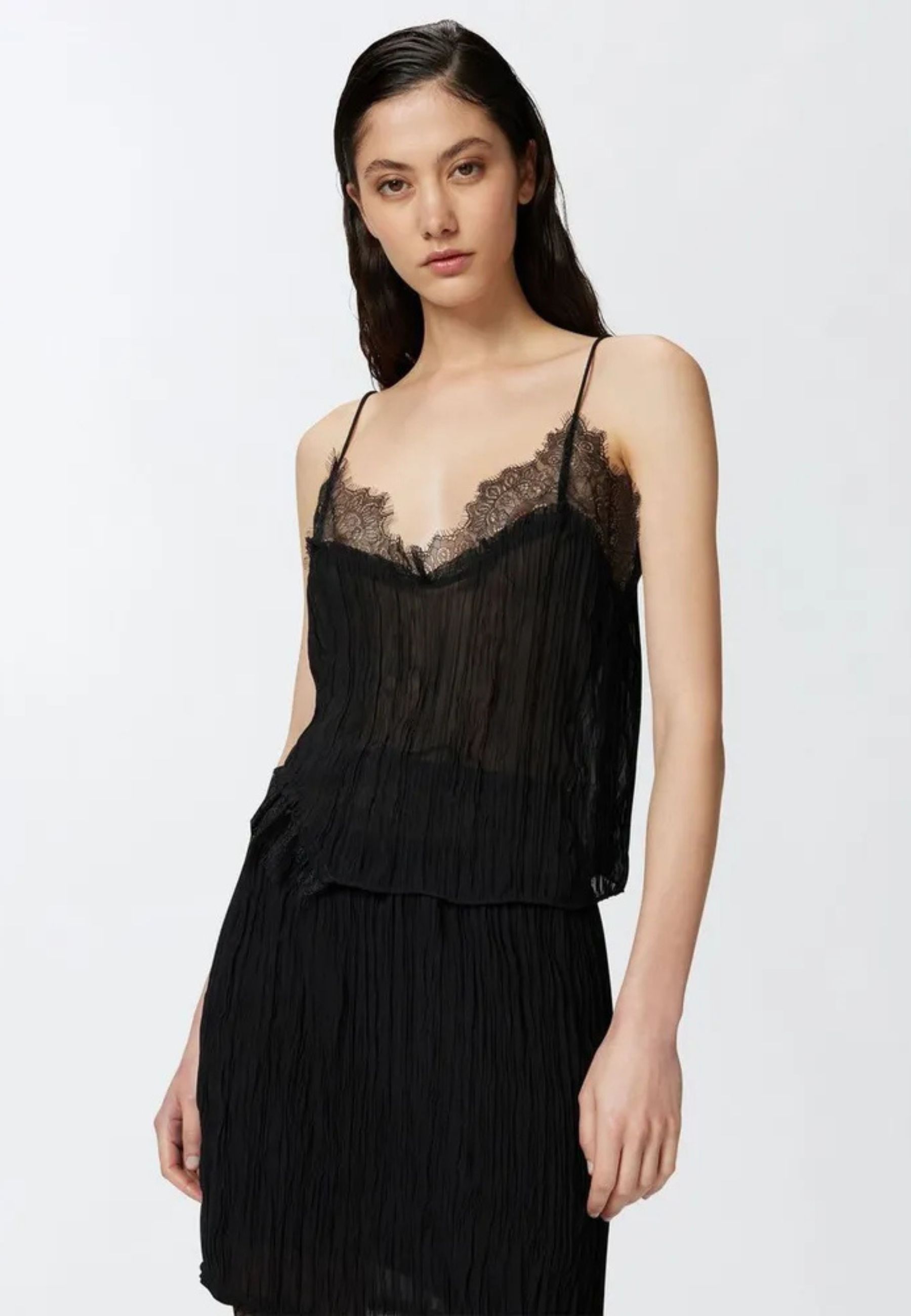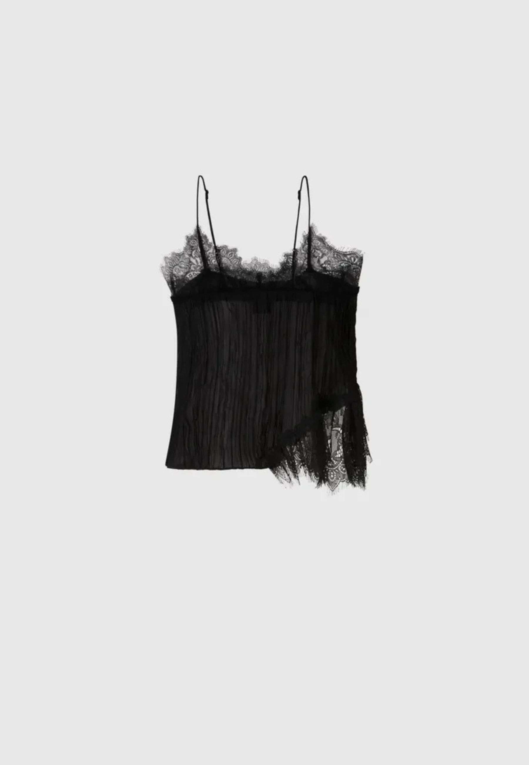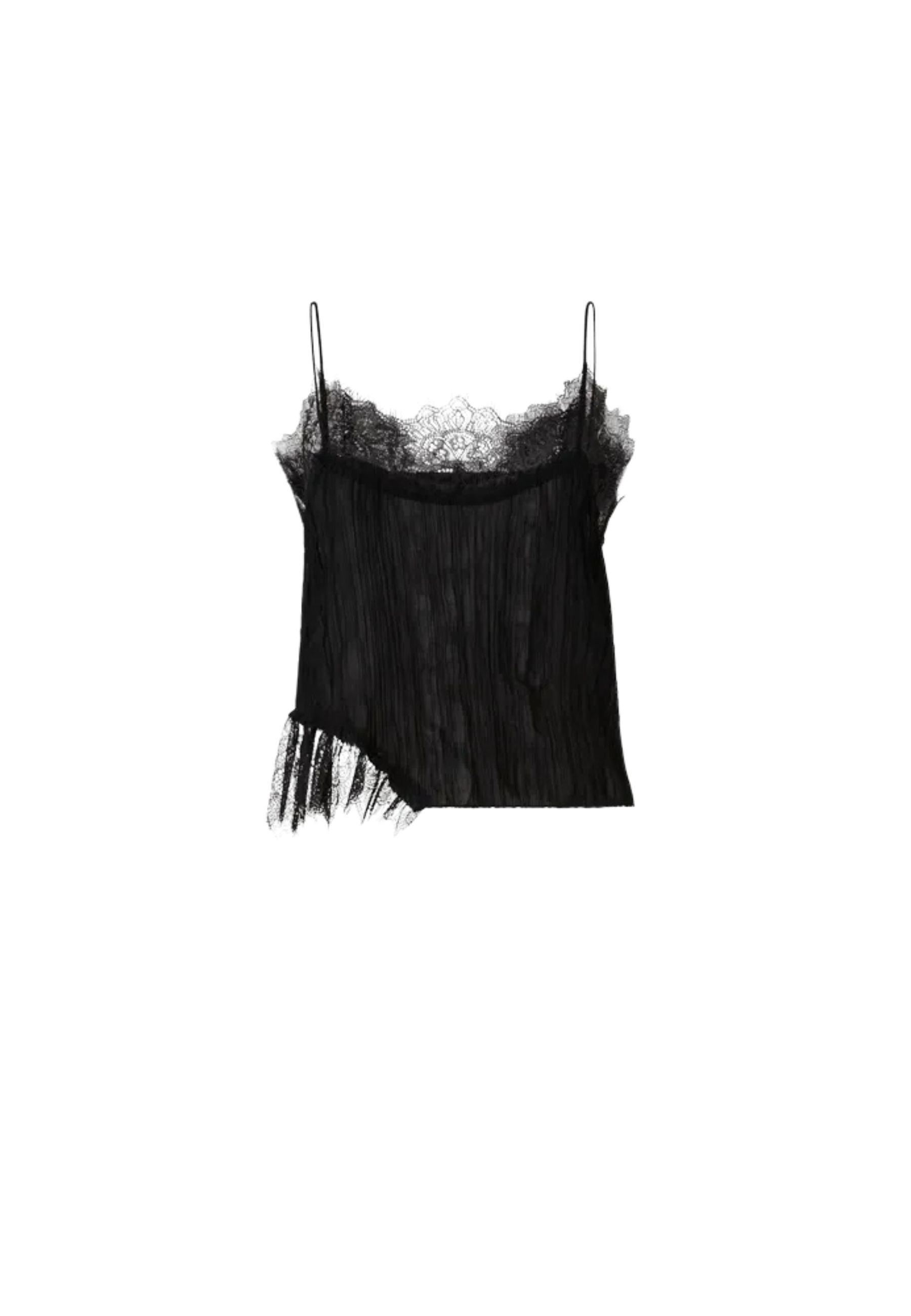 Il modello presenta spalline sottili, scollo impreziosito da inserti in pizzo e una lavorazione plissé che dona movimento e leggerezza alla silhouette. Il fondo asimmetrico con dettaglio in pizzo aggiunge un tocco sofisticato, rendendo il capo ideale sia per outfit serali che per abbinamenti più ricercati da giorno.