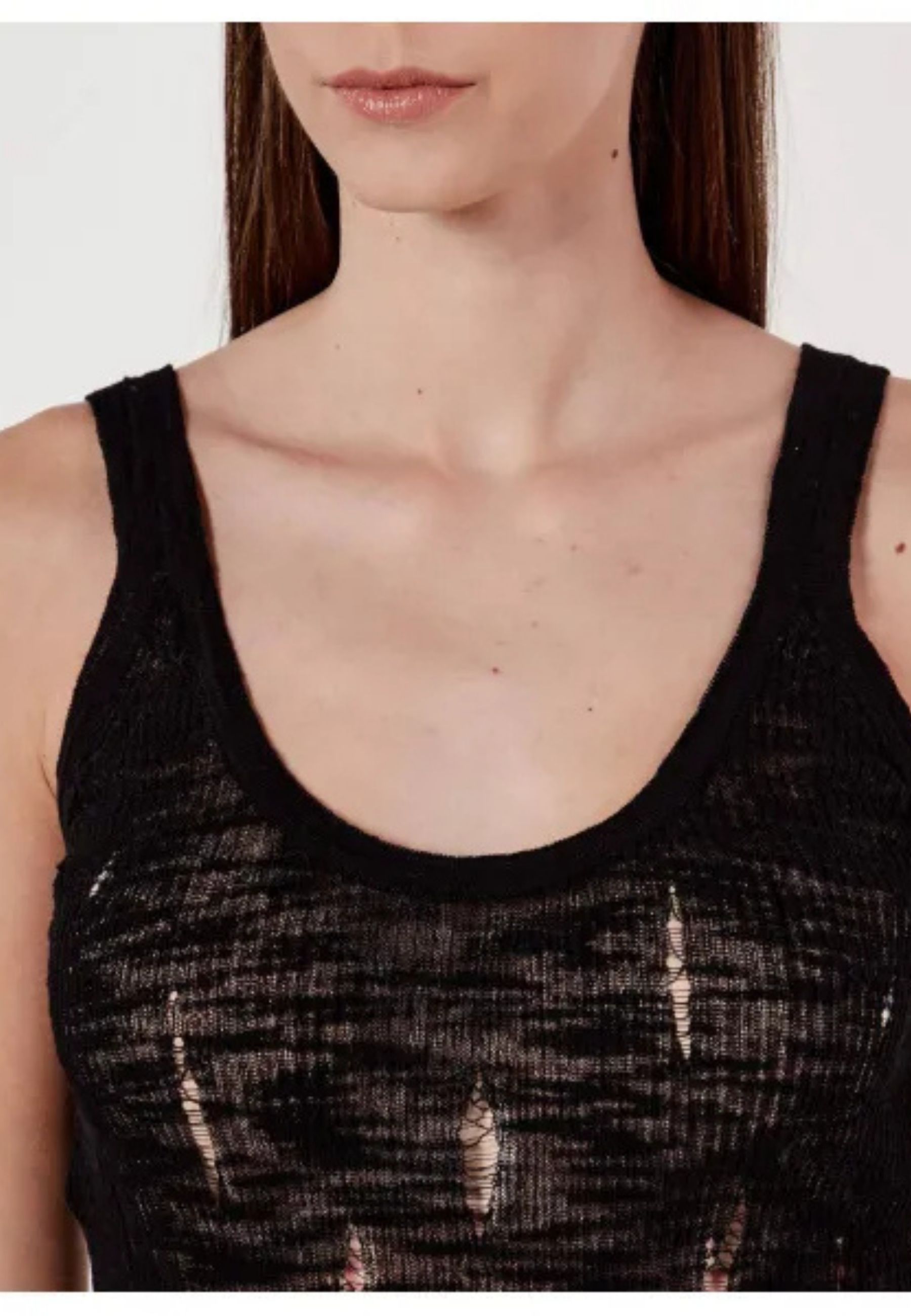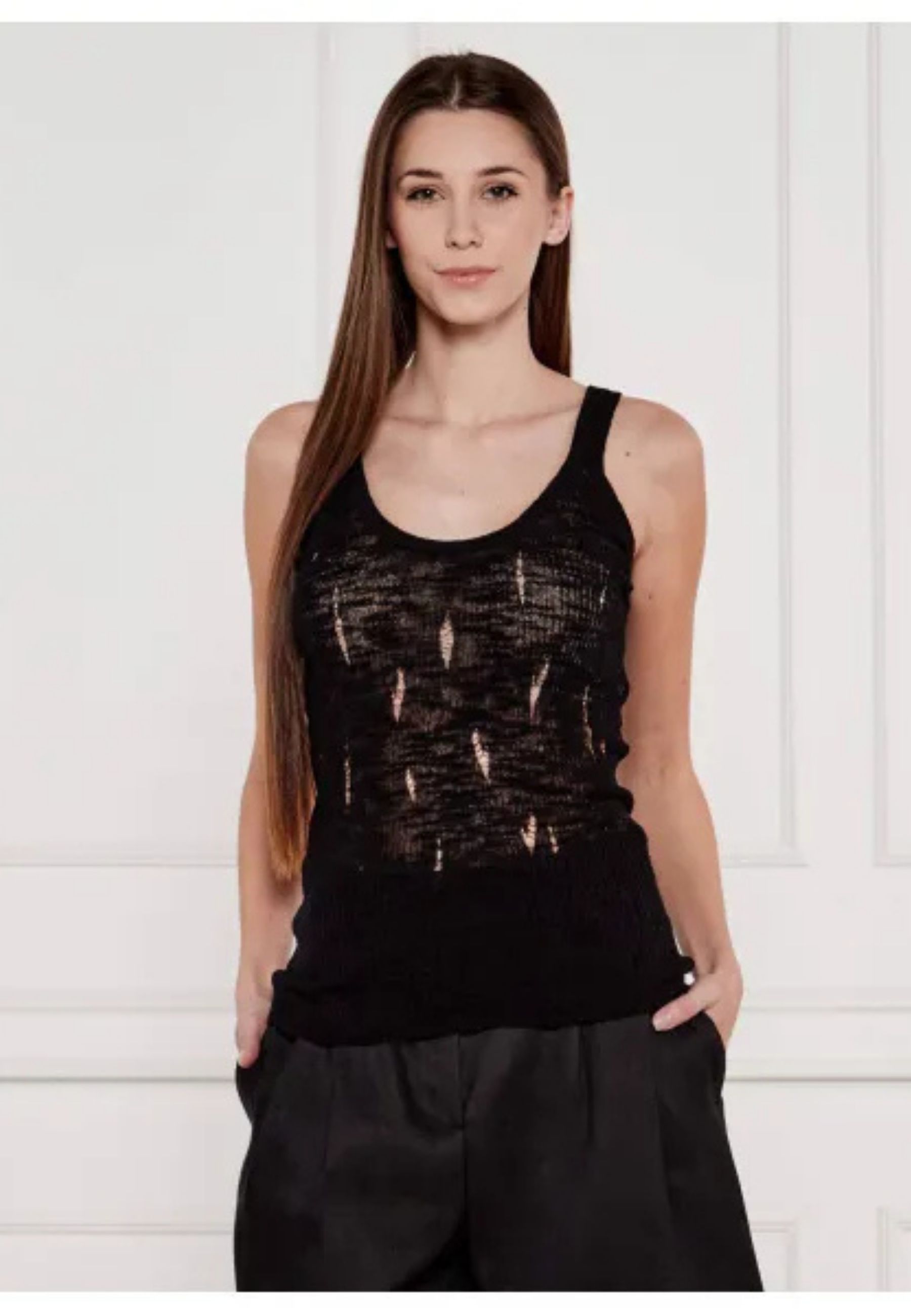 Il modello presenta scollo ampio e spalline larghe, ideali per garantire comfort e vestibilità, rendendolo perfetto sia come capo protagonista sia come elemento da stratificare sotto giacche o blazer. Un top versatile, adatto a look casual-chic o più ricercati.
