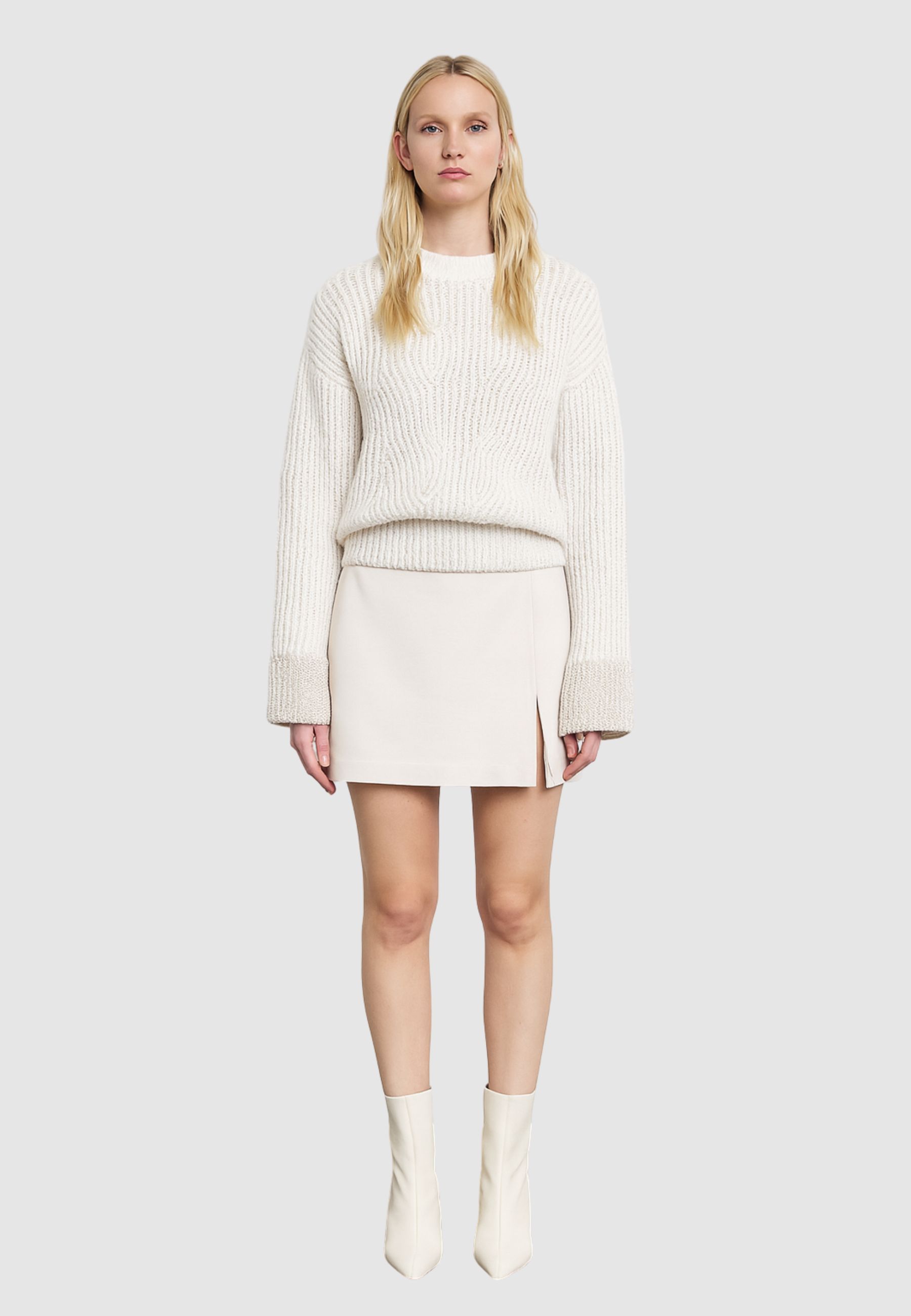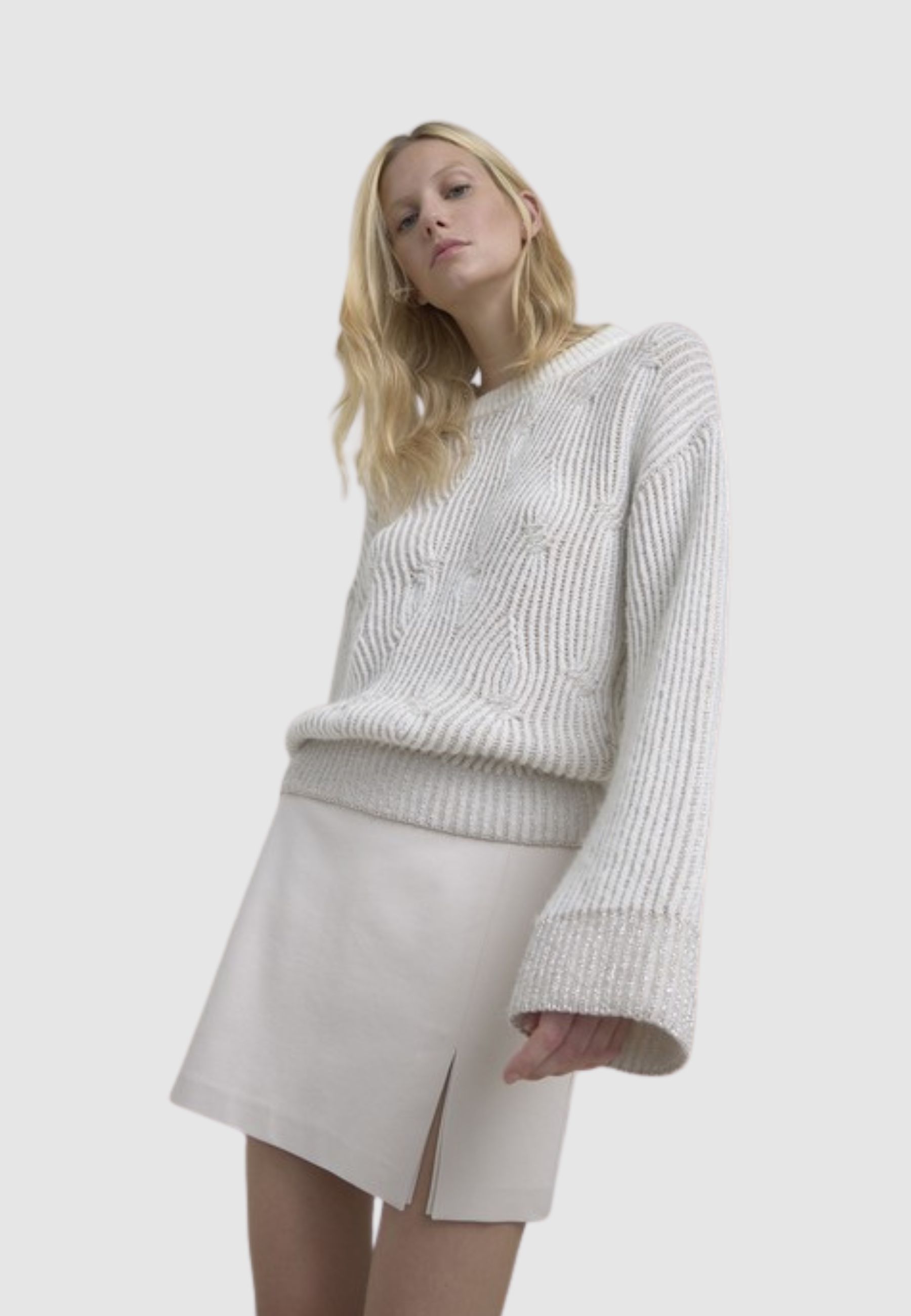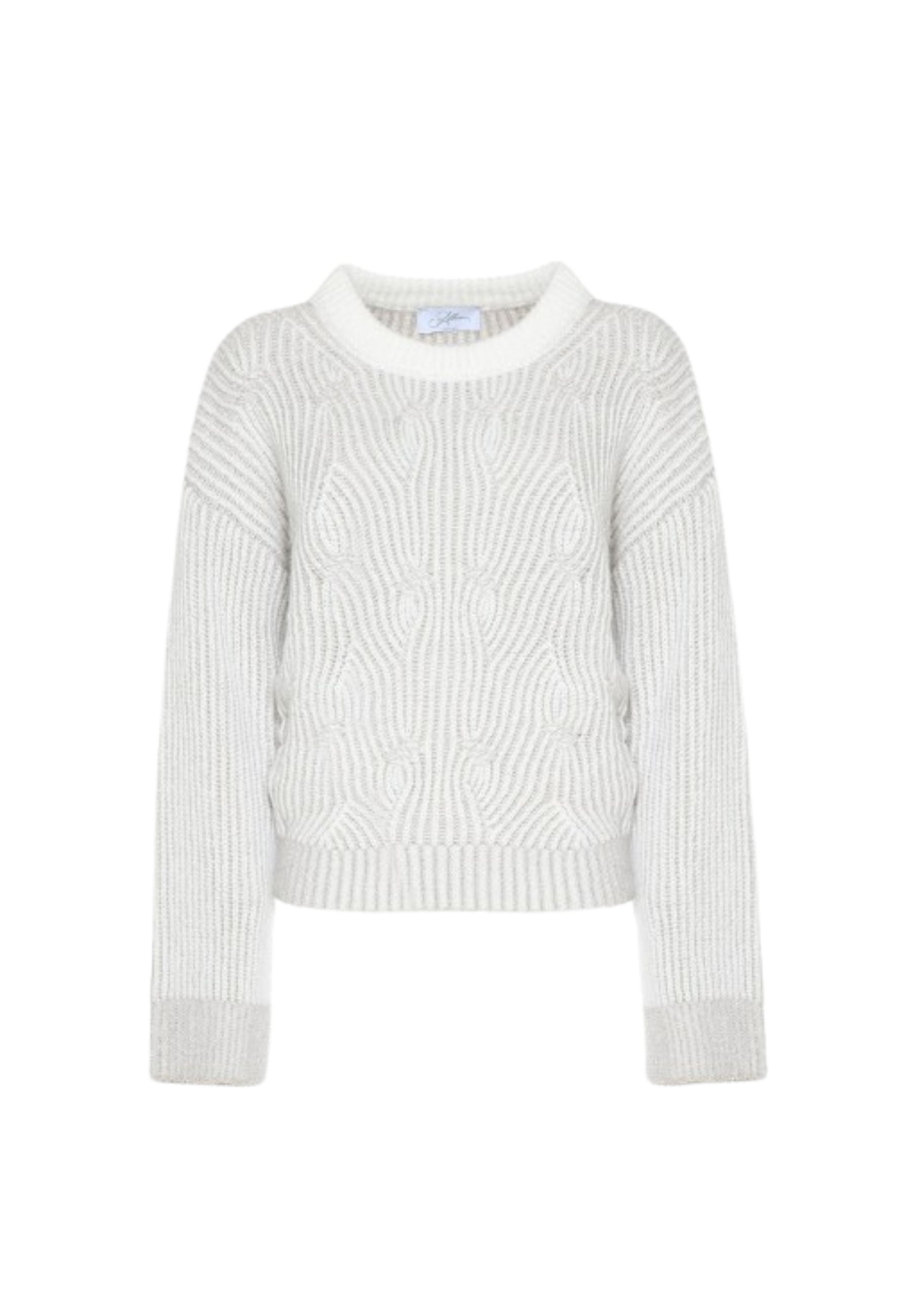 Maglia raffinata realizzata in filato misto con lavorazione a treccia arricchita da fili lurex che donano luminosità discreta e sofisticata. Il collo a cratere ampio valorizza la linea morbida del capo, mentre la vestibilità confortevole la rende perfetta sia per look casual chic che per outfit eleganti.