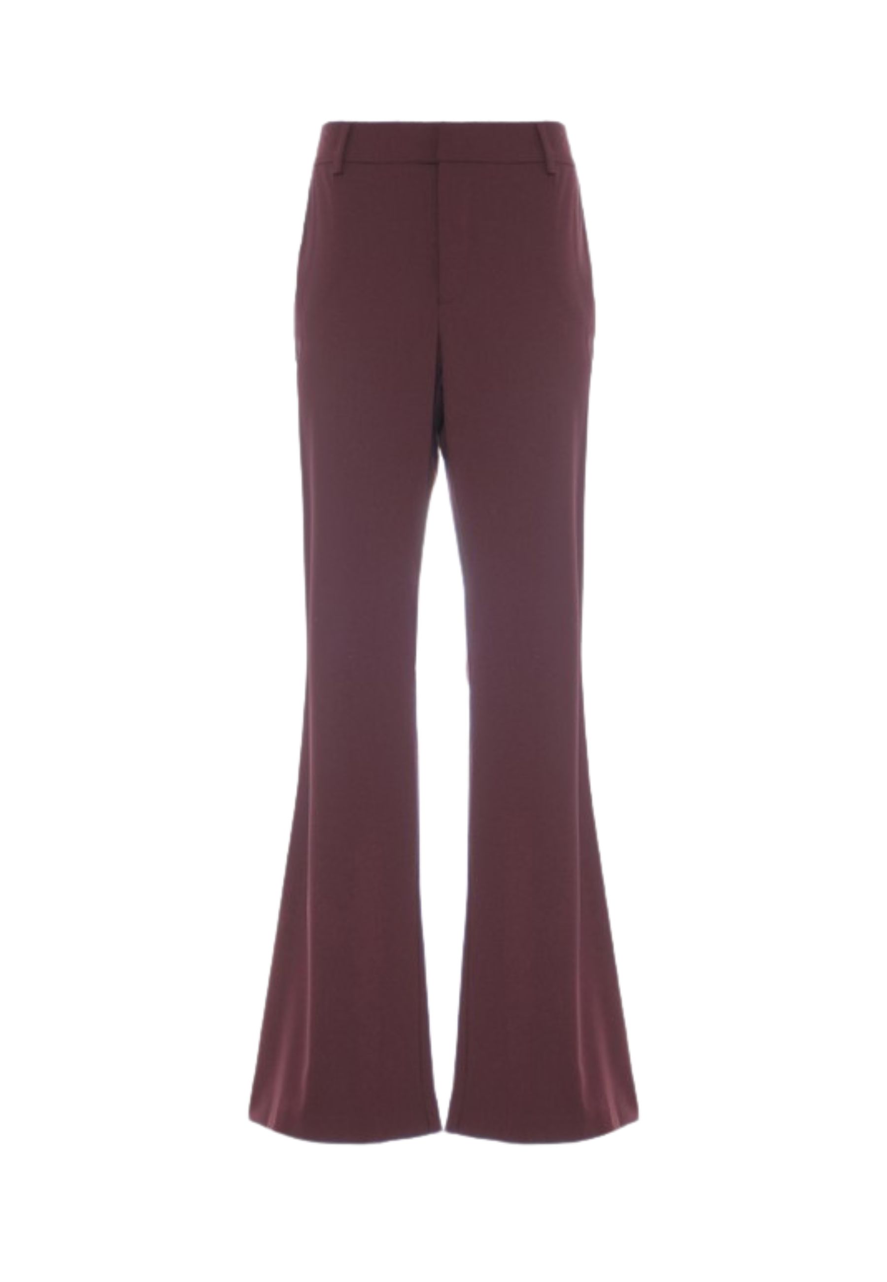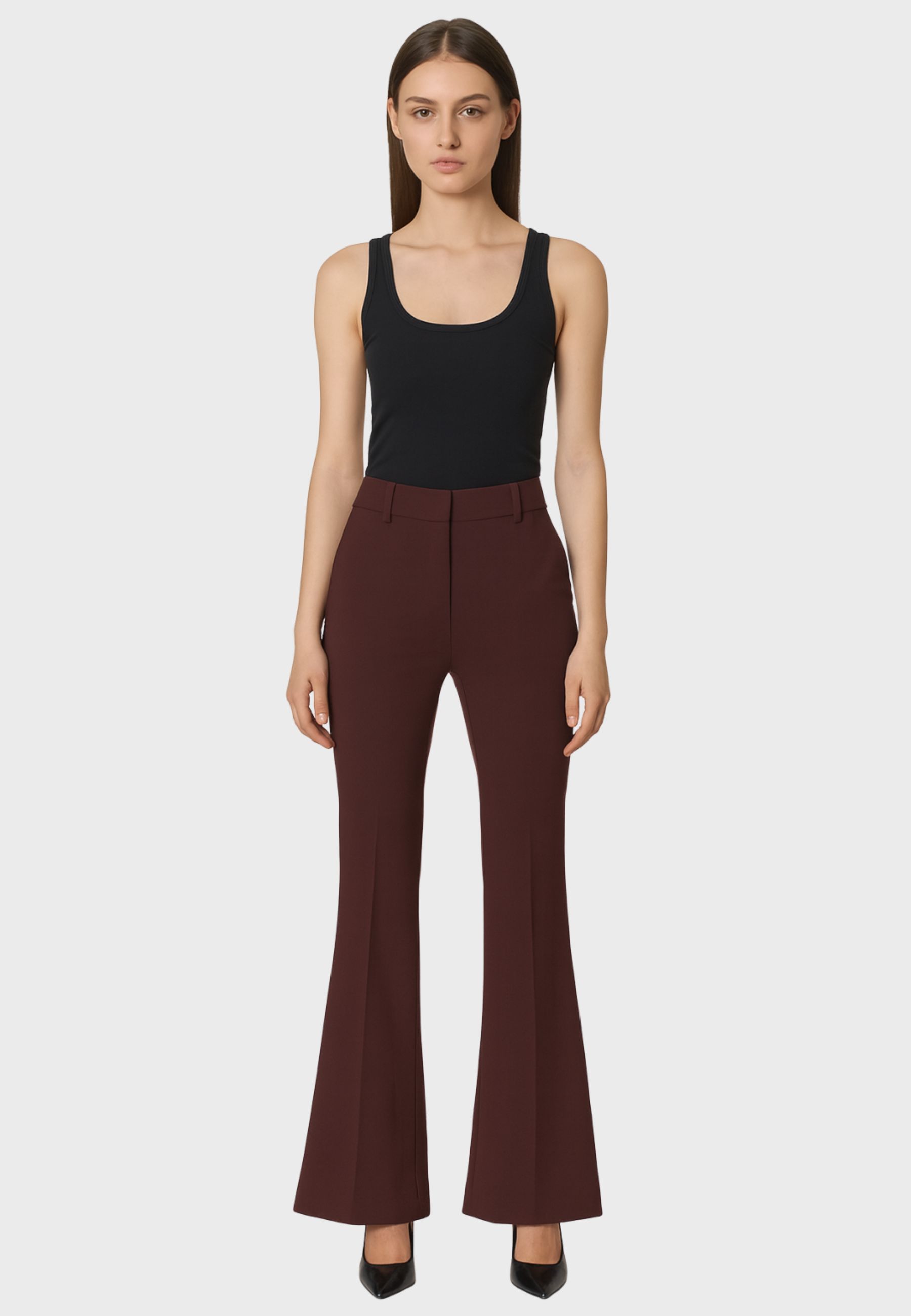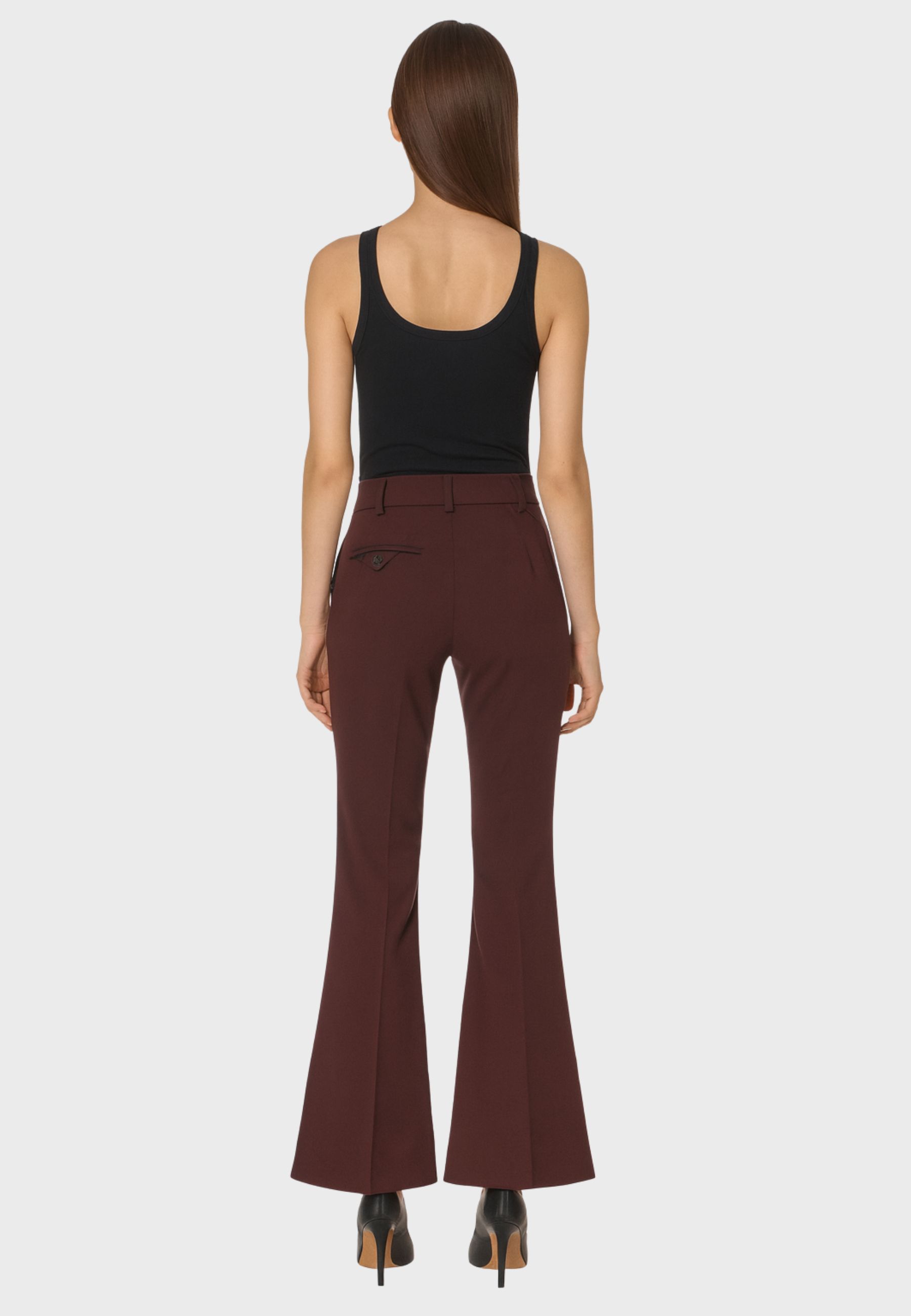 Pantalone elegante a gamba svasata, realizzato in tessuto compatto e leggero che garantisce comfort e caduta perfetta. Il design presenta vita regolare con passanti per cintura, chiusura frontale con zip e gancio, tasche laterali alla francese e taschino posteriore con pattina e bottone. La linea è slim sulla coscia e si apre leggermente al fondo, slanciando la figura e conferendo un tocco sofisticato al look.