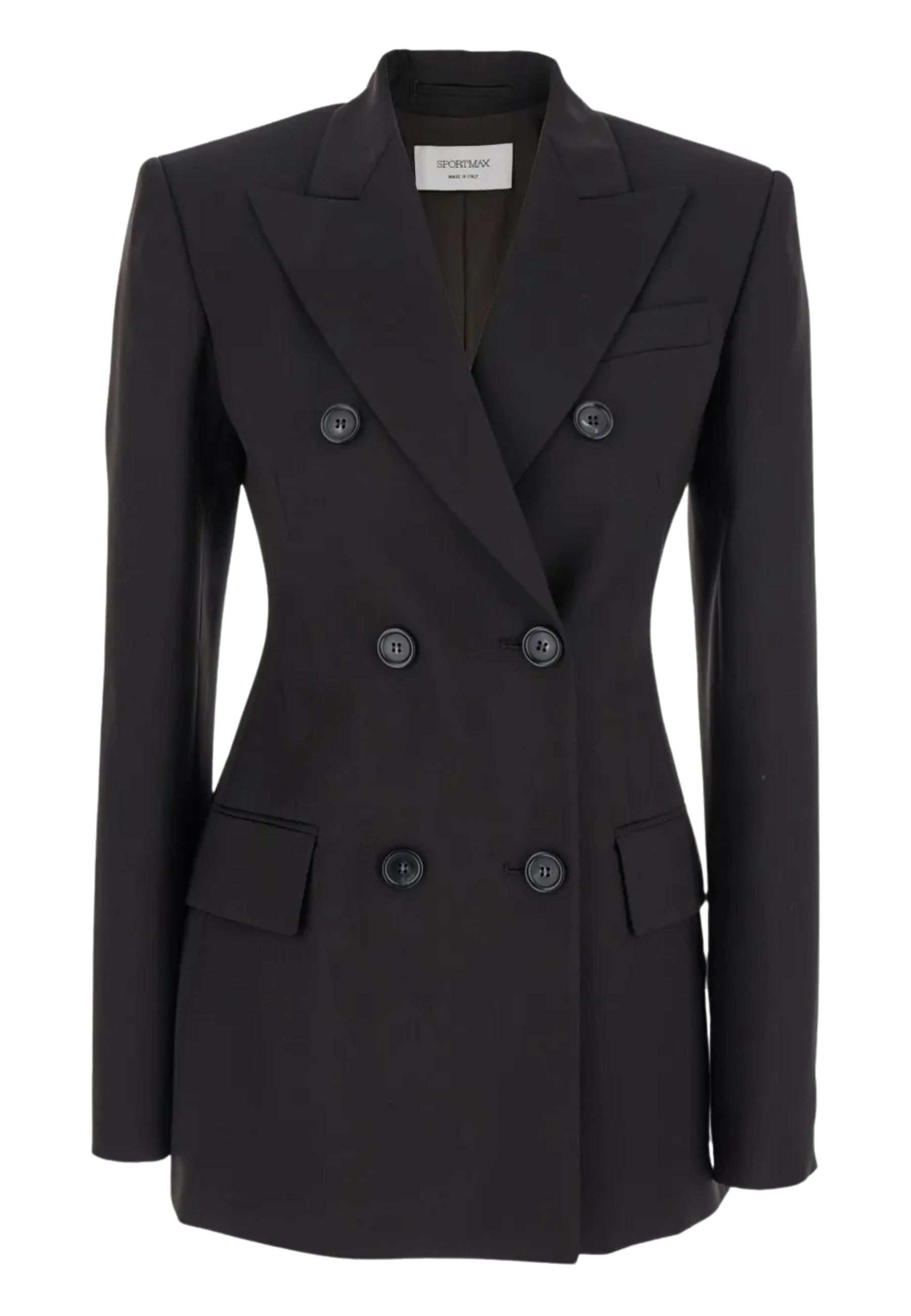Blazer Sportmax modello Adamo realizzato in tela di pura lana natural stretch, caratterizzato da una silhouette sartoriale elegante e contemporanea. Il design doppiopetto valorizza la figura con una linea strutturata e femminile, tipica dello stile sofisticato della maison.