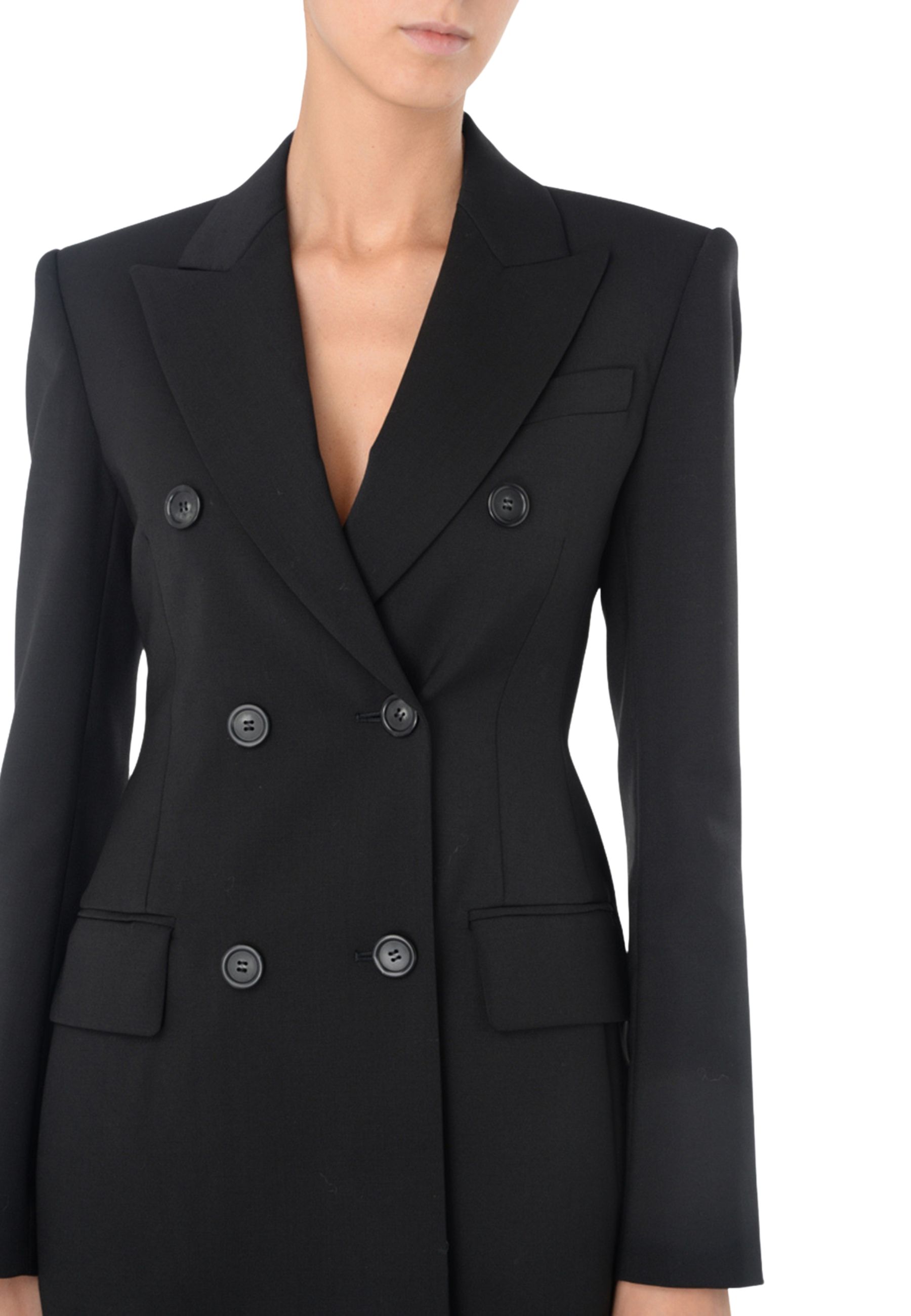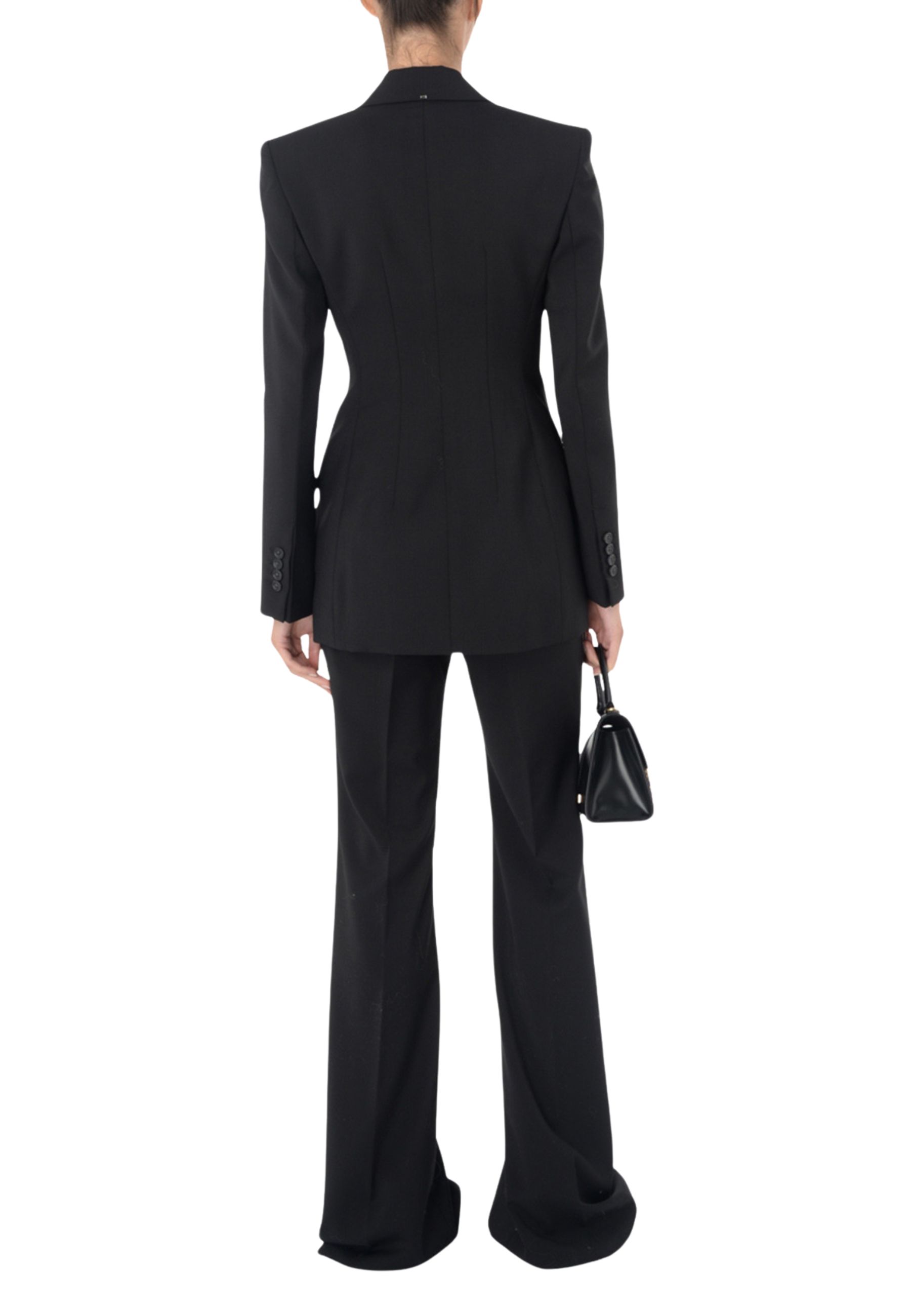 Il capo presenta scollo con rever classico, taschino diagonale sul petto e tasche con patta sui fianchi, dettagli che richiamano leleganza della tradizione tailoring. Le doppie pince modellano la linea del blazer enfatizzando il punto vita, mentre i polsi con bottoni completano la costruzione raffinata del capo.