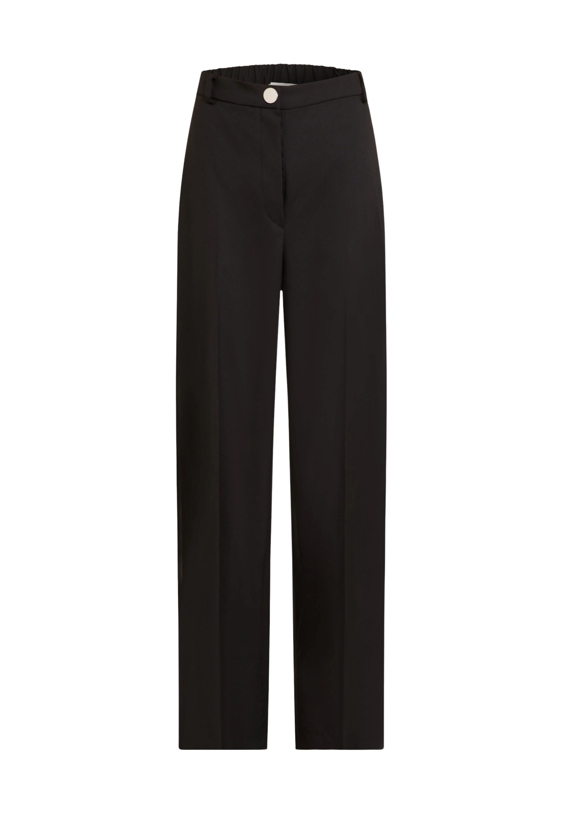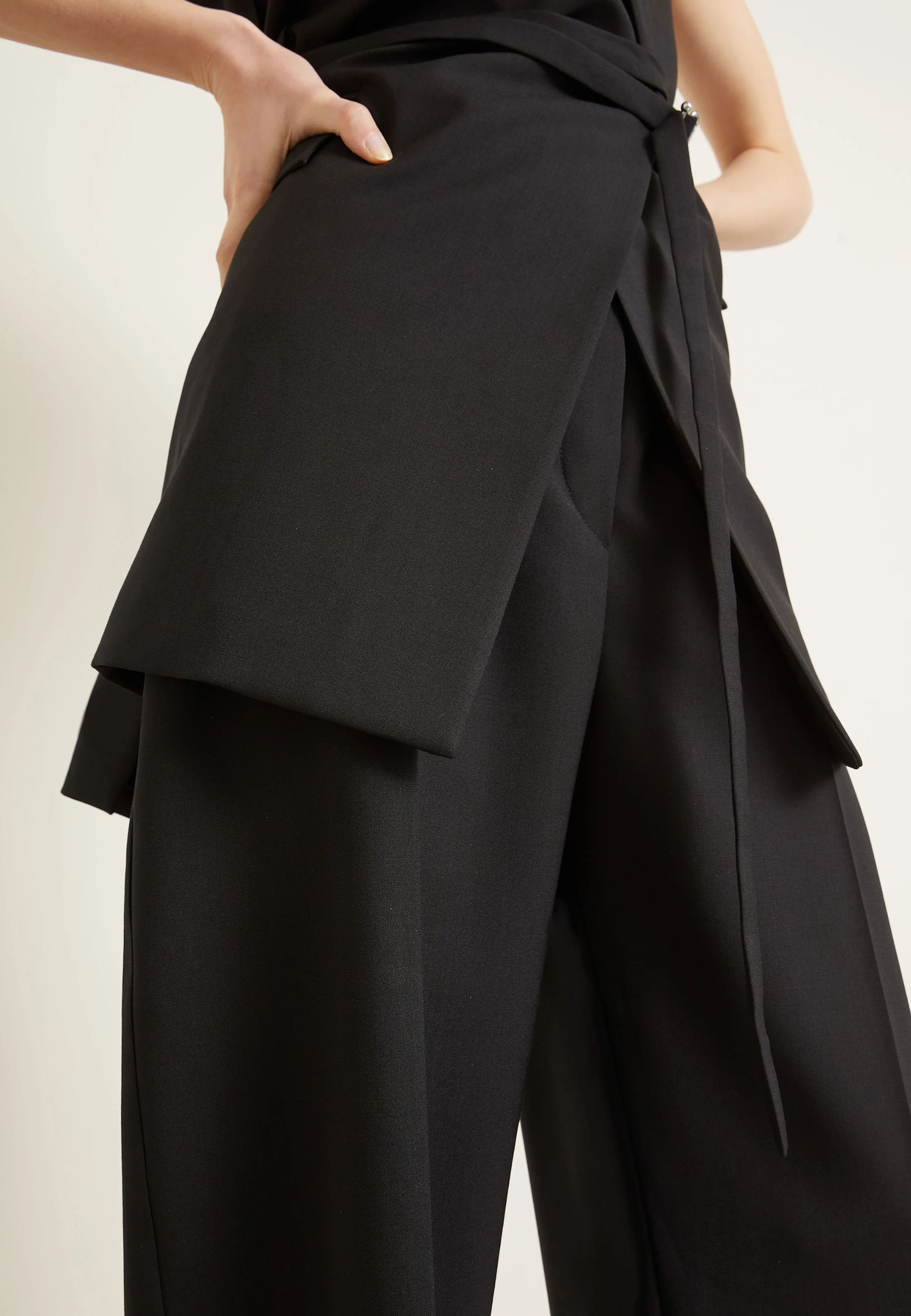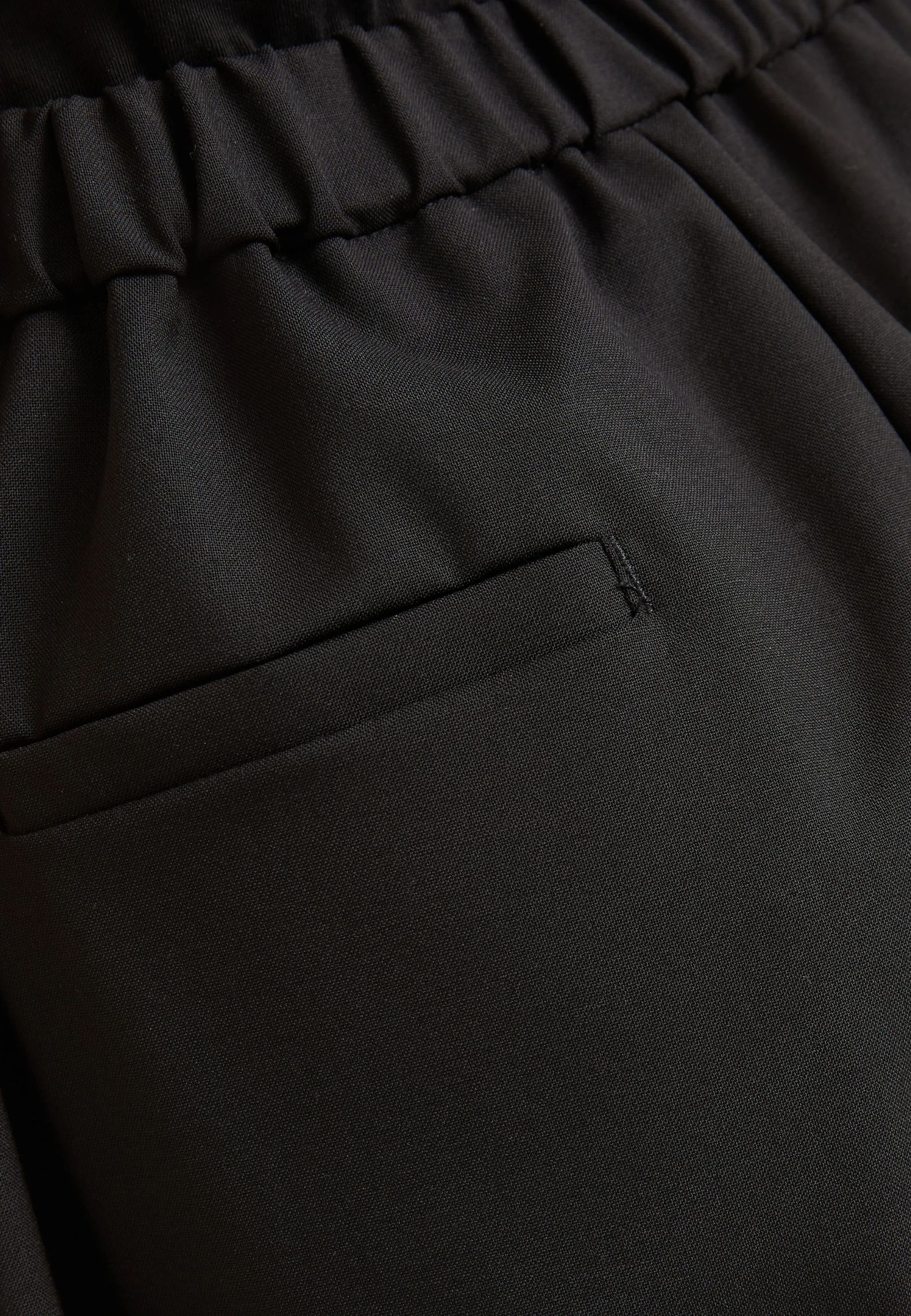 Il modello è caratterizzato da chiusura frontale con bottone e zip, cintura con inserti elasticizzati sul retro per una maggiore vestibilità e tasche laterali funzionali. Sul retro sono presenti tasche a filetto, mentre un piccolo dettaglio gioiello decorativo sulla tasca aggiunge un accento discreto e sofisticato.
