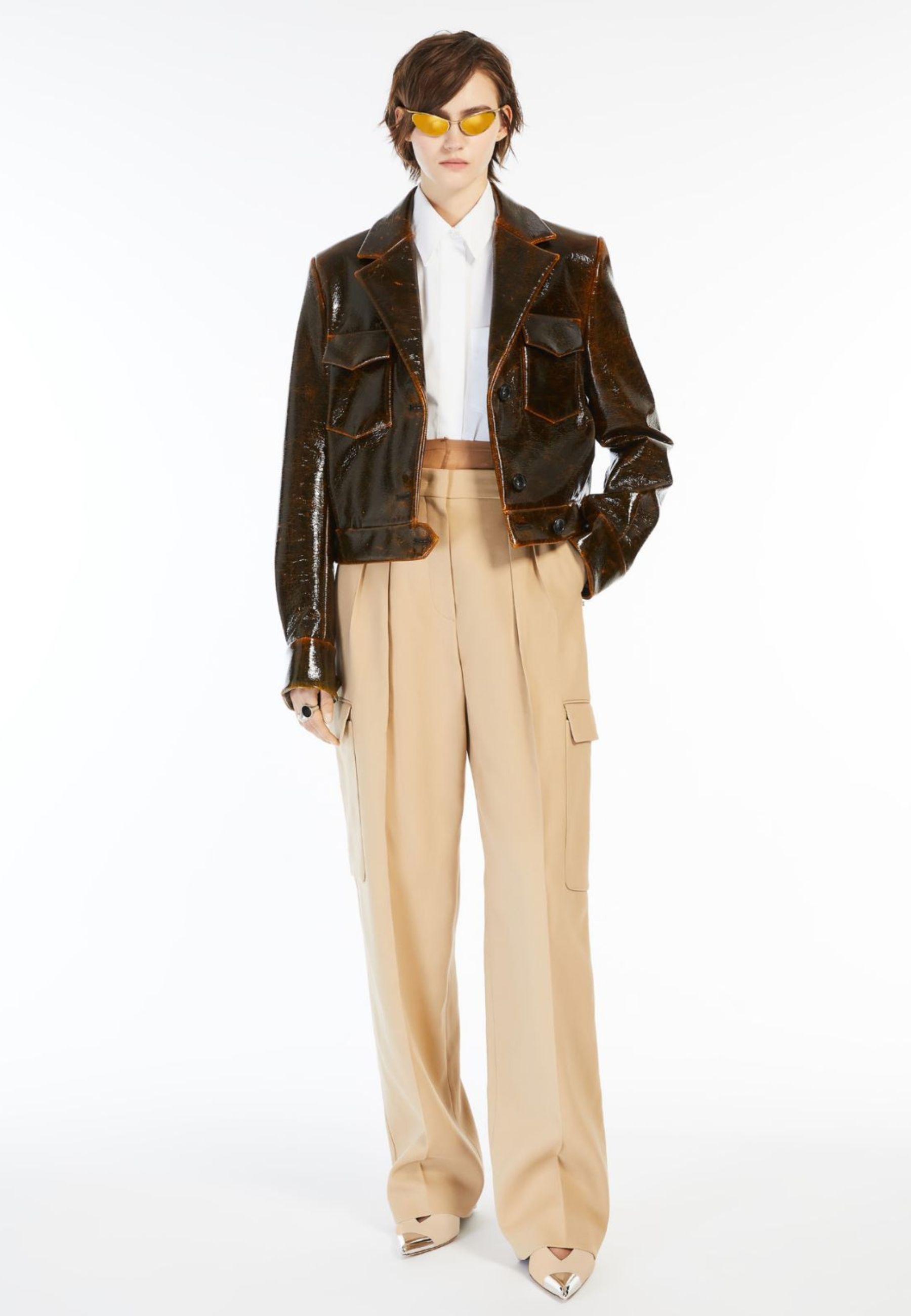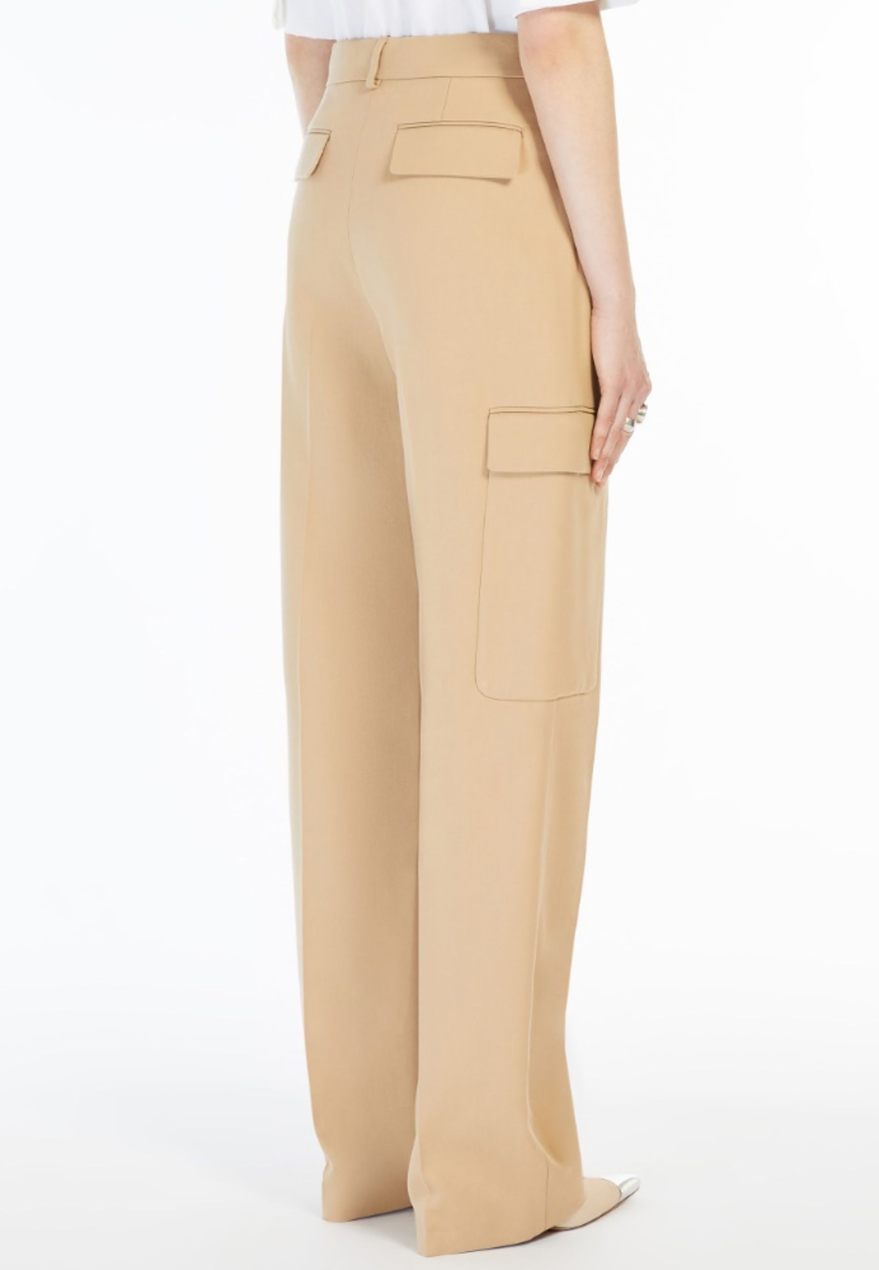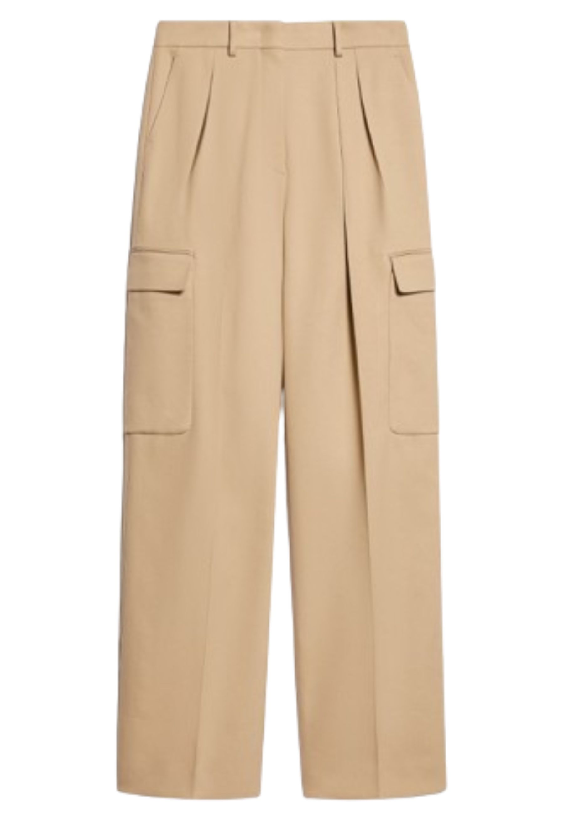 Pantalone cargo in tessuto doppio di cotone e viscosa. Il modello presenta vita bassa con cintura interna personalizzata, con pieghe che amplificano il volume sulle gambe. Le tasche alla francese sui lati sono abbinate ai maxi tasconi applicati lungo i fianchi e ai taschini con patta sul retro. Piega stirata per una nota più formale.