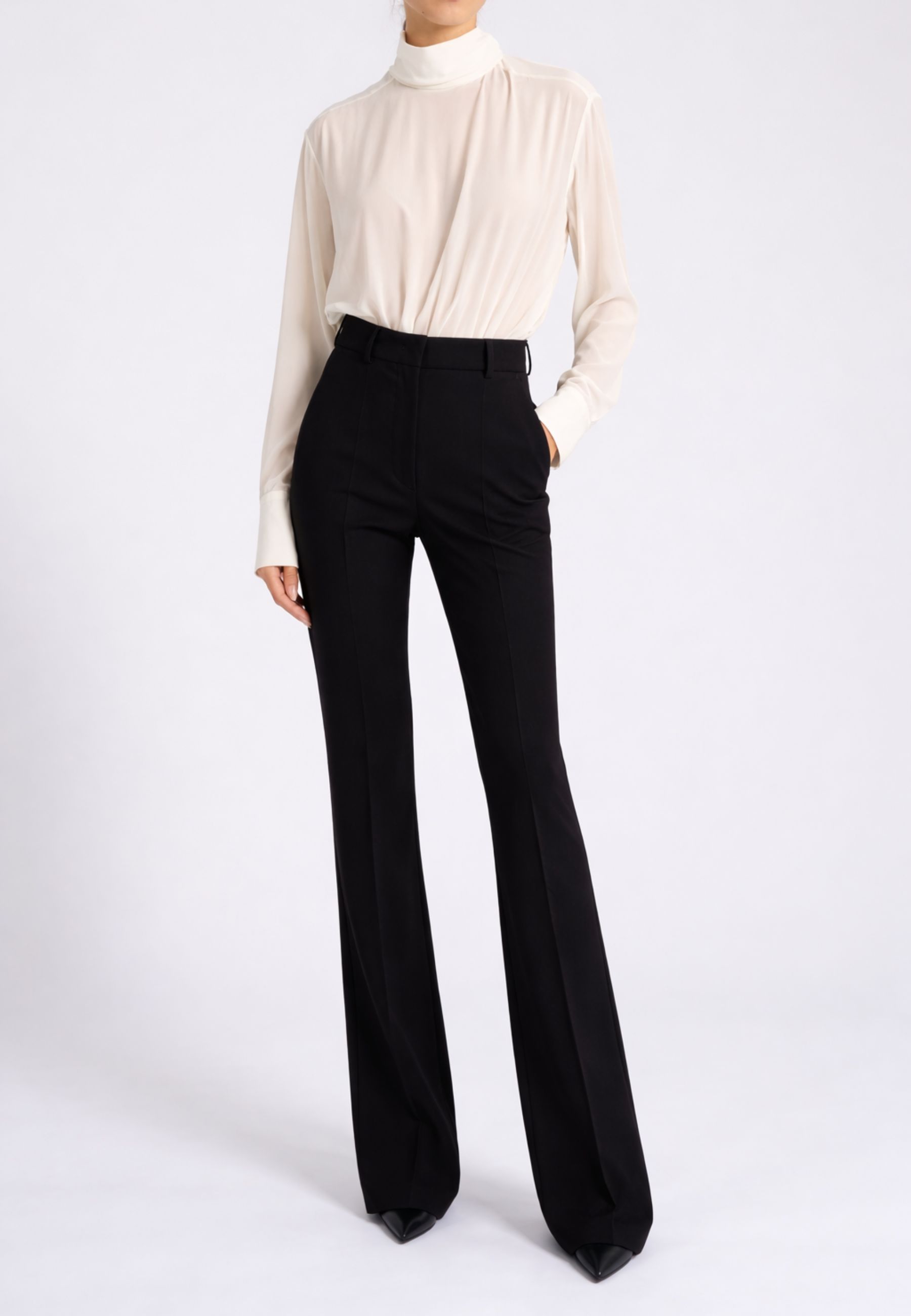 Le tasche laterali alla francese e le tasche posteriori a filetto completano il design con funzionalità ed eleganza, rendendo questo pantalone perfetto per look formali, da ufficio o per outfit sofisticati da sera.
