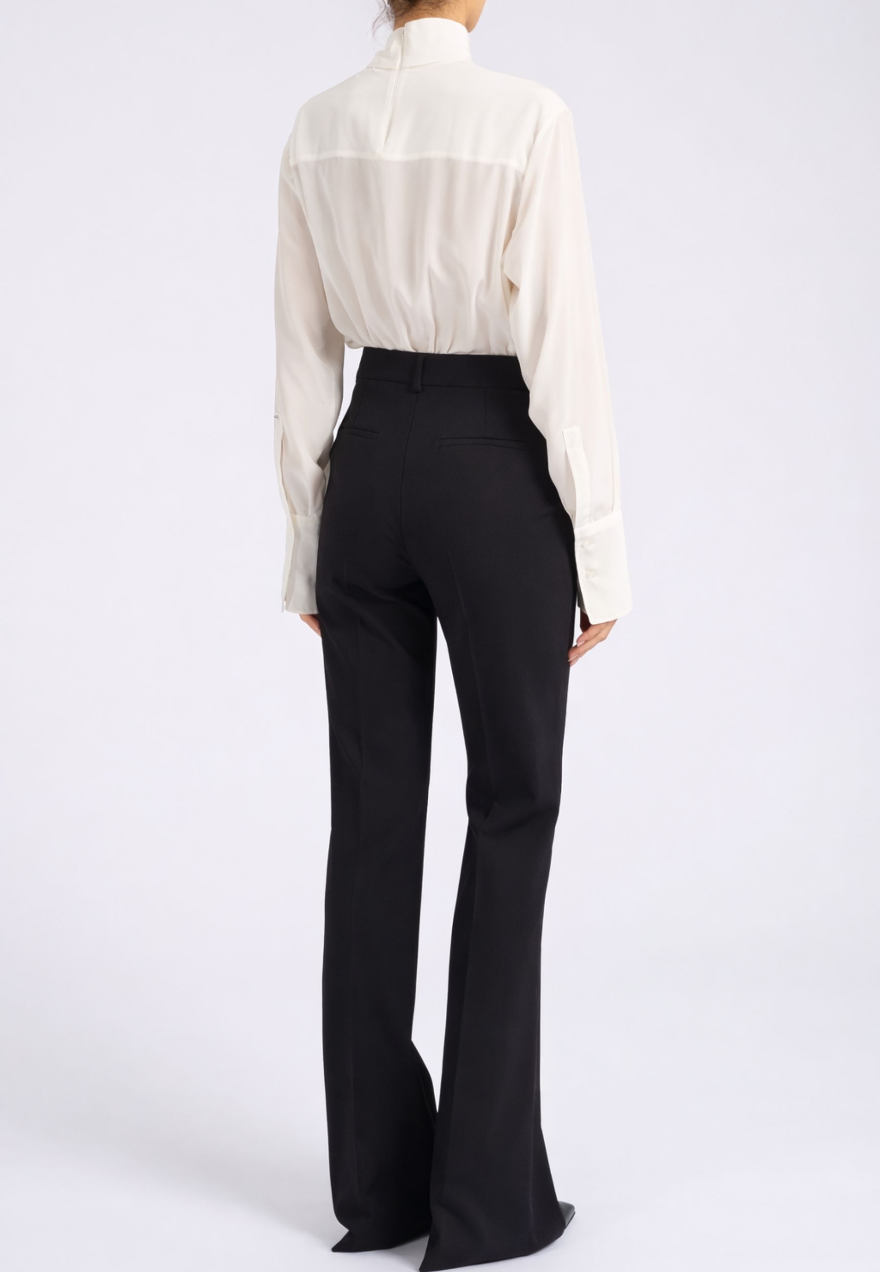 Il modello è caratterizzato da vita bassa e da una costruzione pulita con piega stirata fronte e retro, dettaglio tipico dei pantaloni sartoriali che dona ordine e verticalità alla linea. La chiusura con gancio nascosto e la cintura interna personalizzata assicurano una finitura curata e minimal.