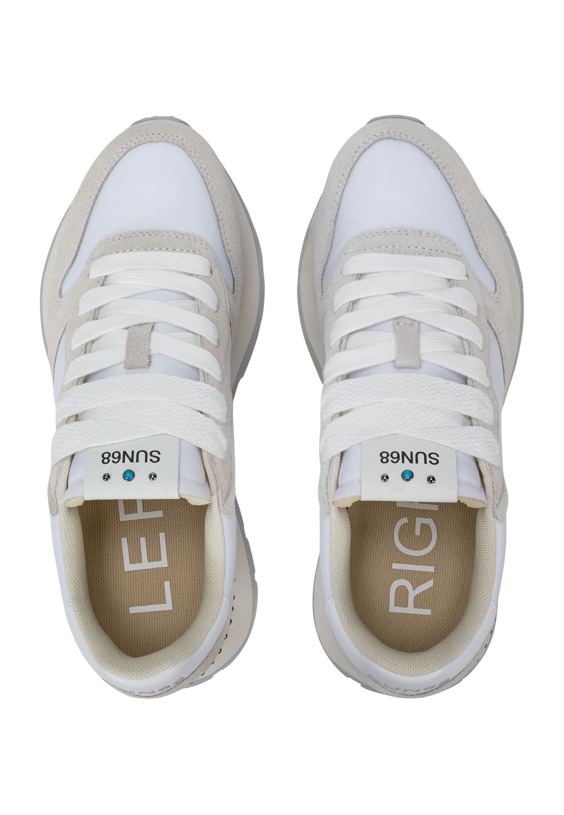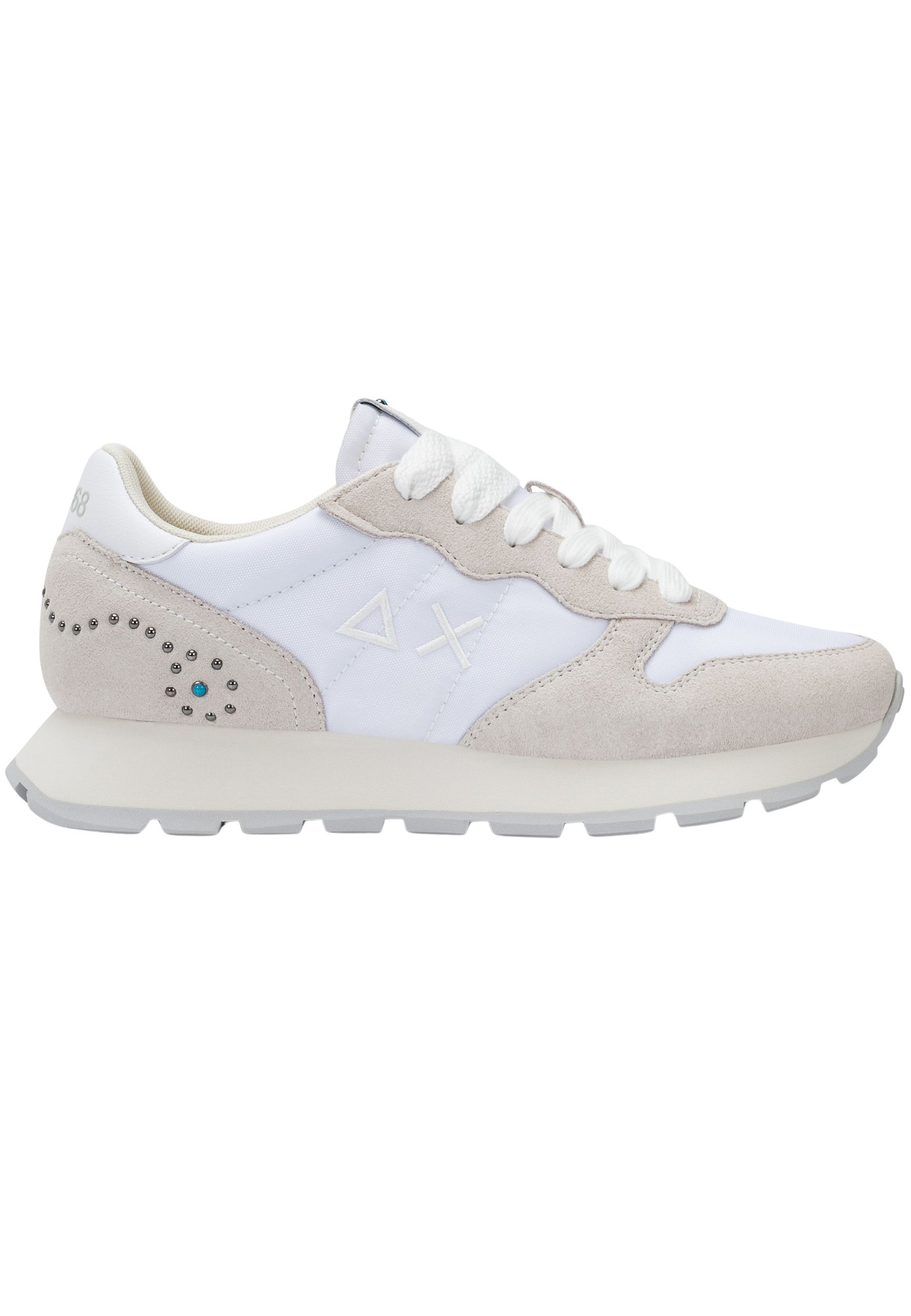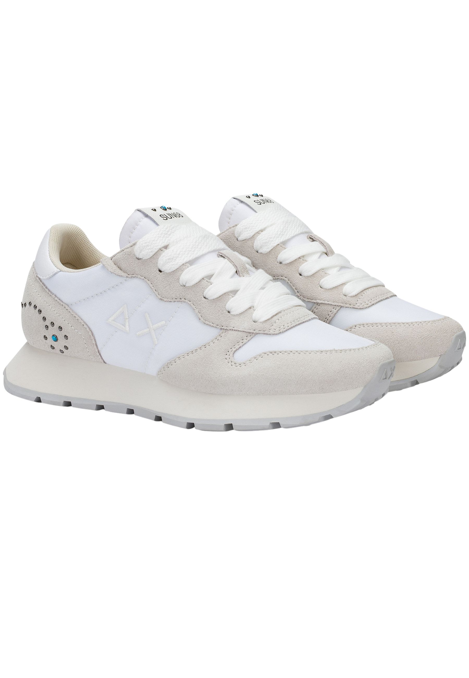 Sneakers SUN68 dal design contemporaneo, realizzate con combinazione di tessuto tecnico bianco e inserti in suede color beige naturale. Il profilo è essenziale ma valorizzato da dettagli distintivi: logo ricamato laterale tono su tono e applicazioni metalliche con micro borchie e punto luce turchese sul tallone.