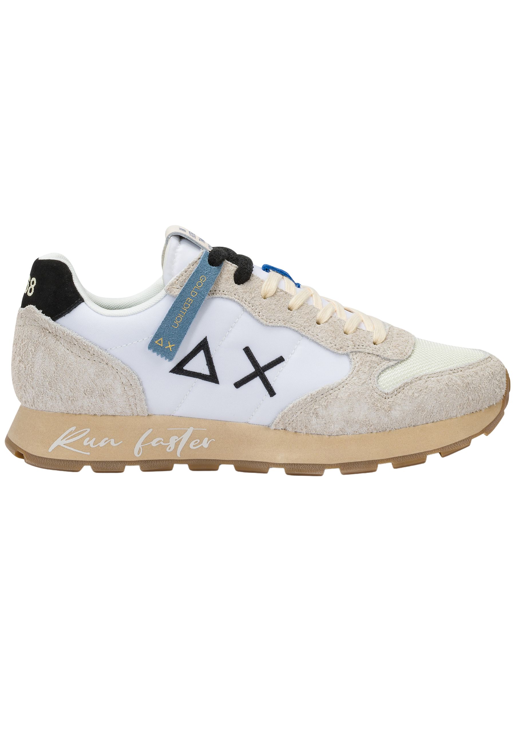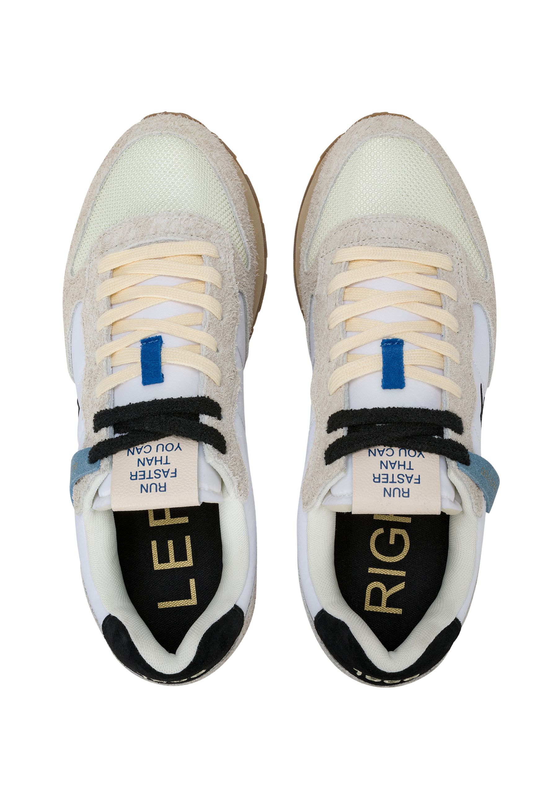 Sneakers uomo SUN68 modello Rua Faster, caratterizzata da un design sportivo e contemporaneo. La tomaia combina inserti in suede e pannelli in tessuto tecnico e materiale sintetico, creando un raffinato gioco di contrasti tra tonalità neutre e dettagli a contrasto.