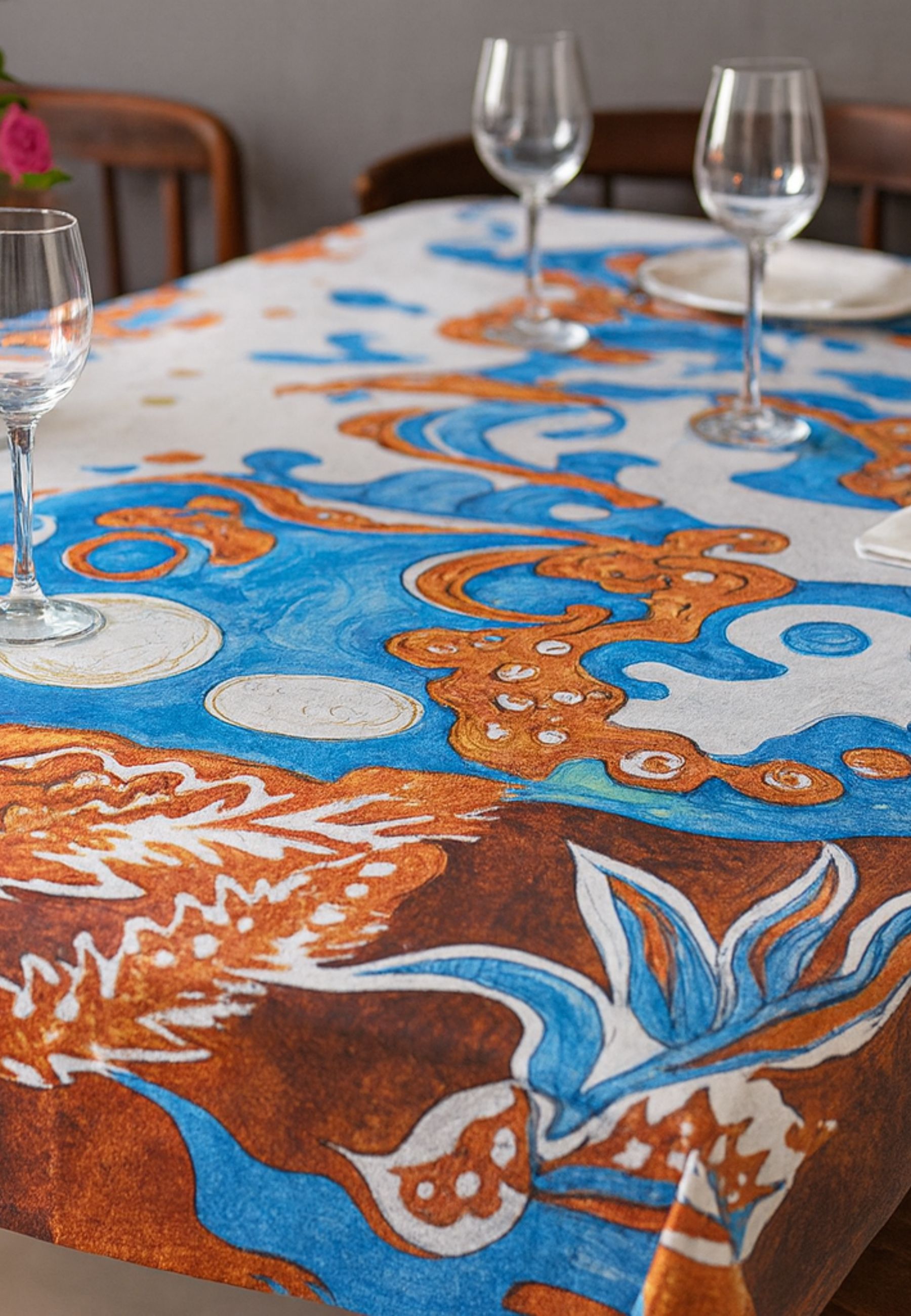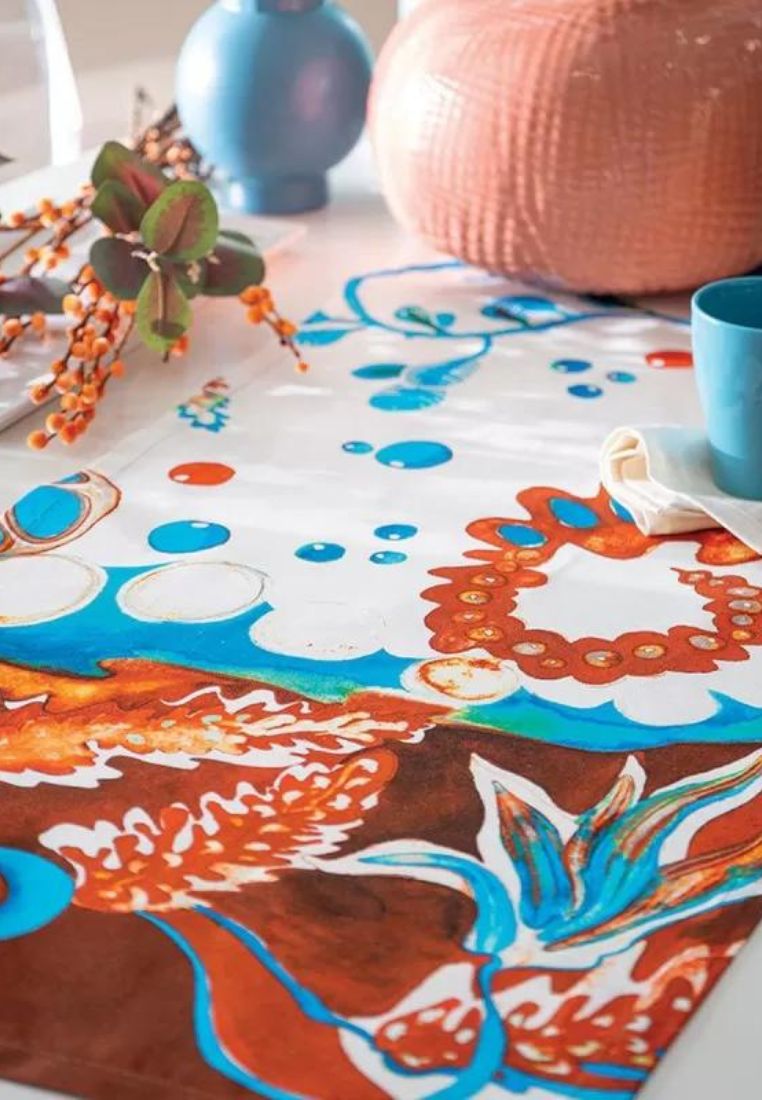 Tovaglia stampata in 100% cotone panama con trattamento antimacchia, perfetta per una tavola elegante ma vivace.