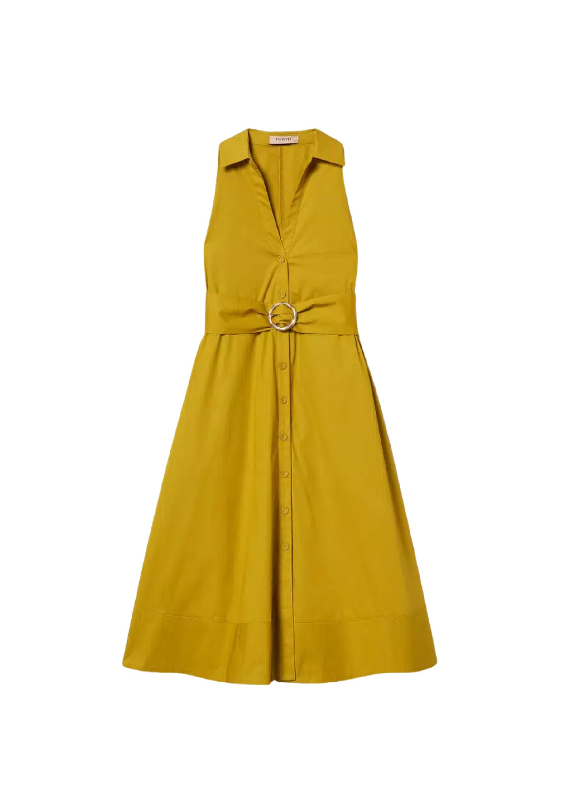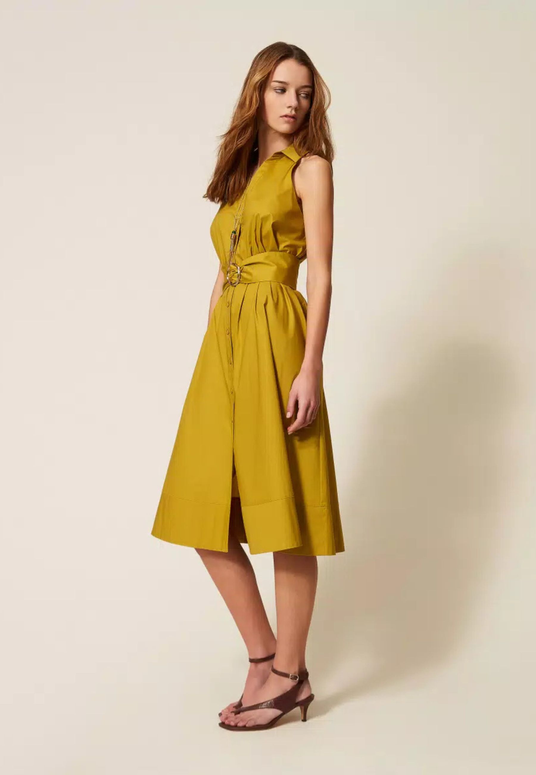 La linea ampia valorizza il movimento del tessuto e dona leggerezza alla figura, mentre la cintura rimovibile con fibbia in metallo permette di definire il punto vita e personalizzare la vestibilità. Il popeline di cotone elasticizzato garantisce comfort e freschezza, rendendo questo abito ideale per la stagione estiva o per look raffinati da giorno.