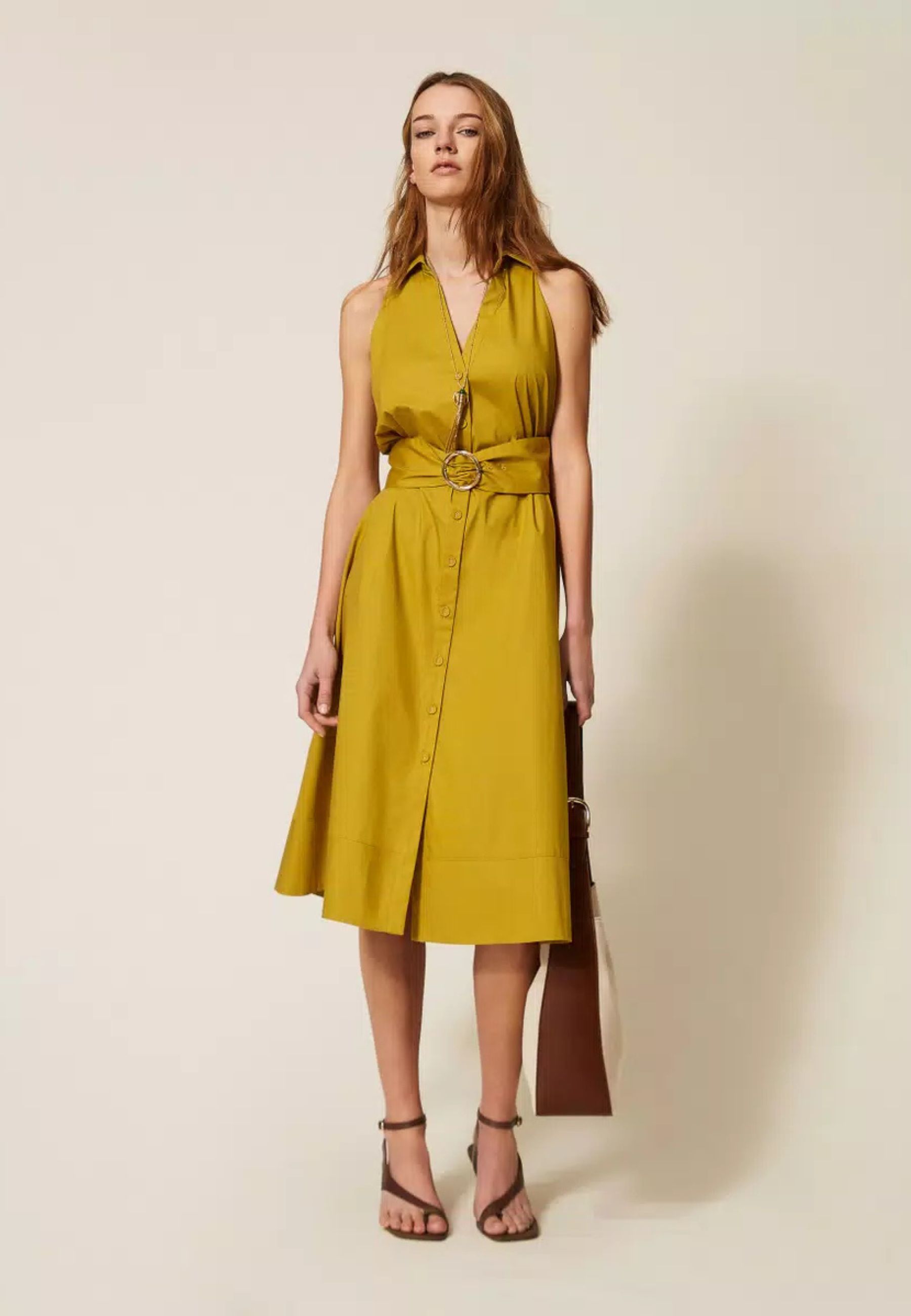 Abito longuette in popeline di cotone stretch dal design elegante e contemporaneo, caratterizzato da una silhouette femminile e fluida. Il modello presenta revers con scollatura a V e chiusura frontale con bottoni in tono, elementi che richiamano lestetica della classica shirt-dress reinterpretata in chiave moderna.