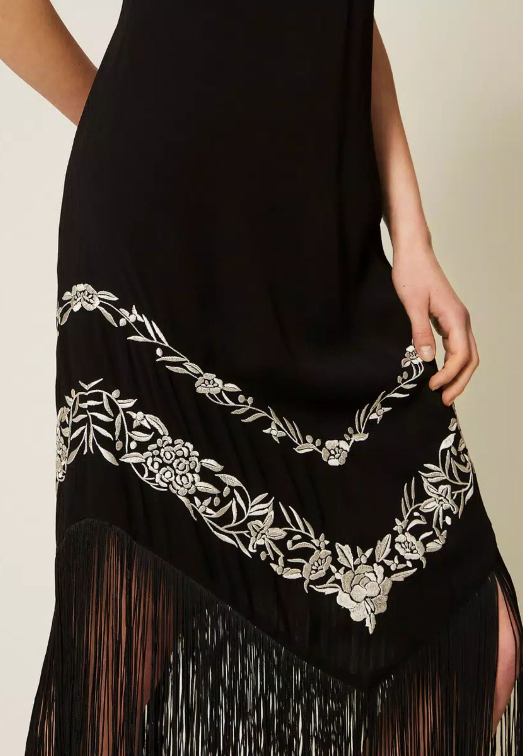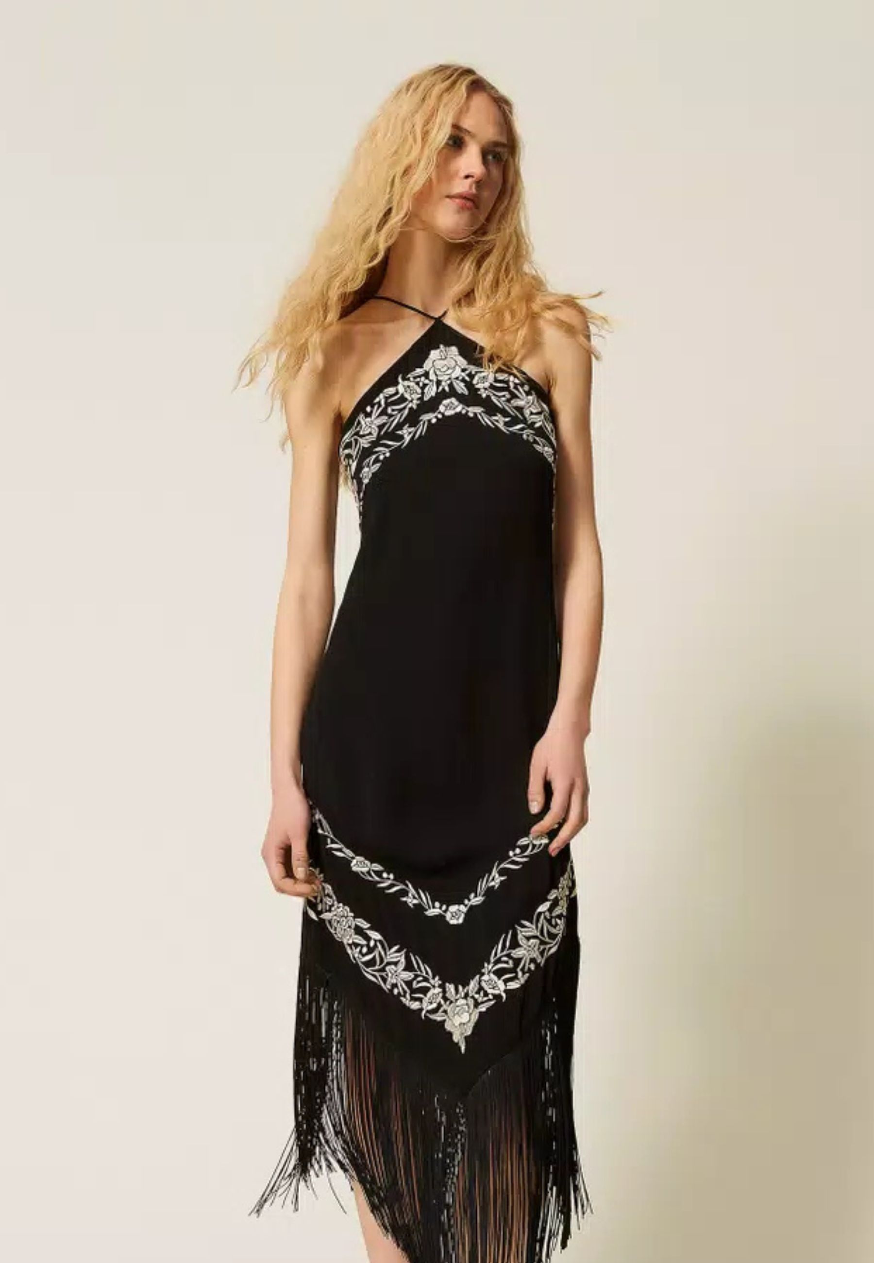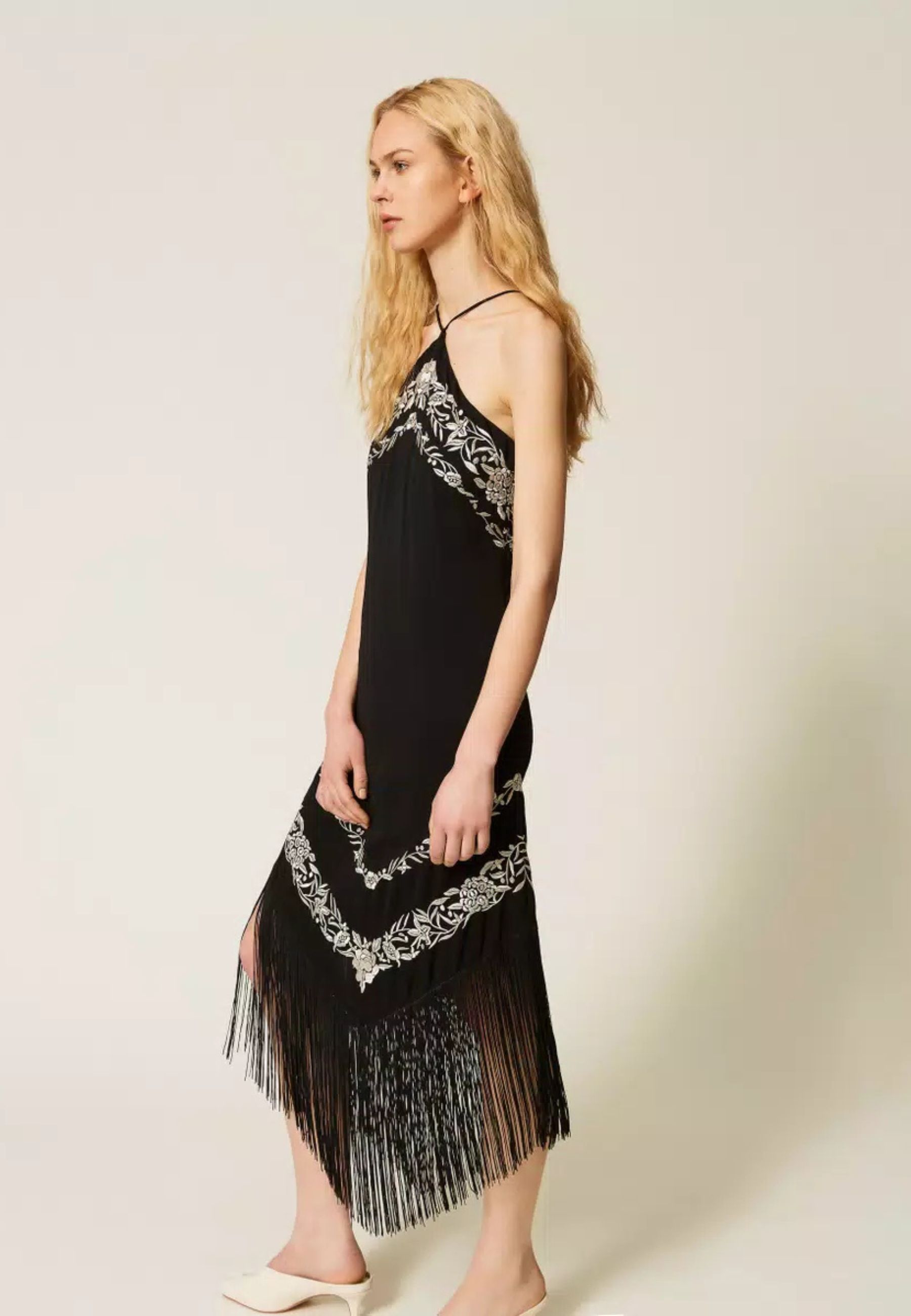 Abito lungo da donna realizzato in viscosa fluida, impreziosito da ricamo floreale piazzato a contrasto. Il design è valorizzato da frange a punta applicate sul davanti e sul retro, che conferiscono movimento e unestetica distintiva.