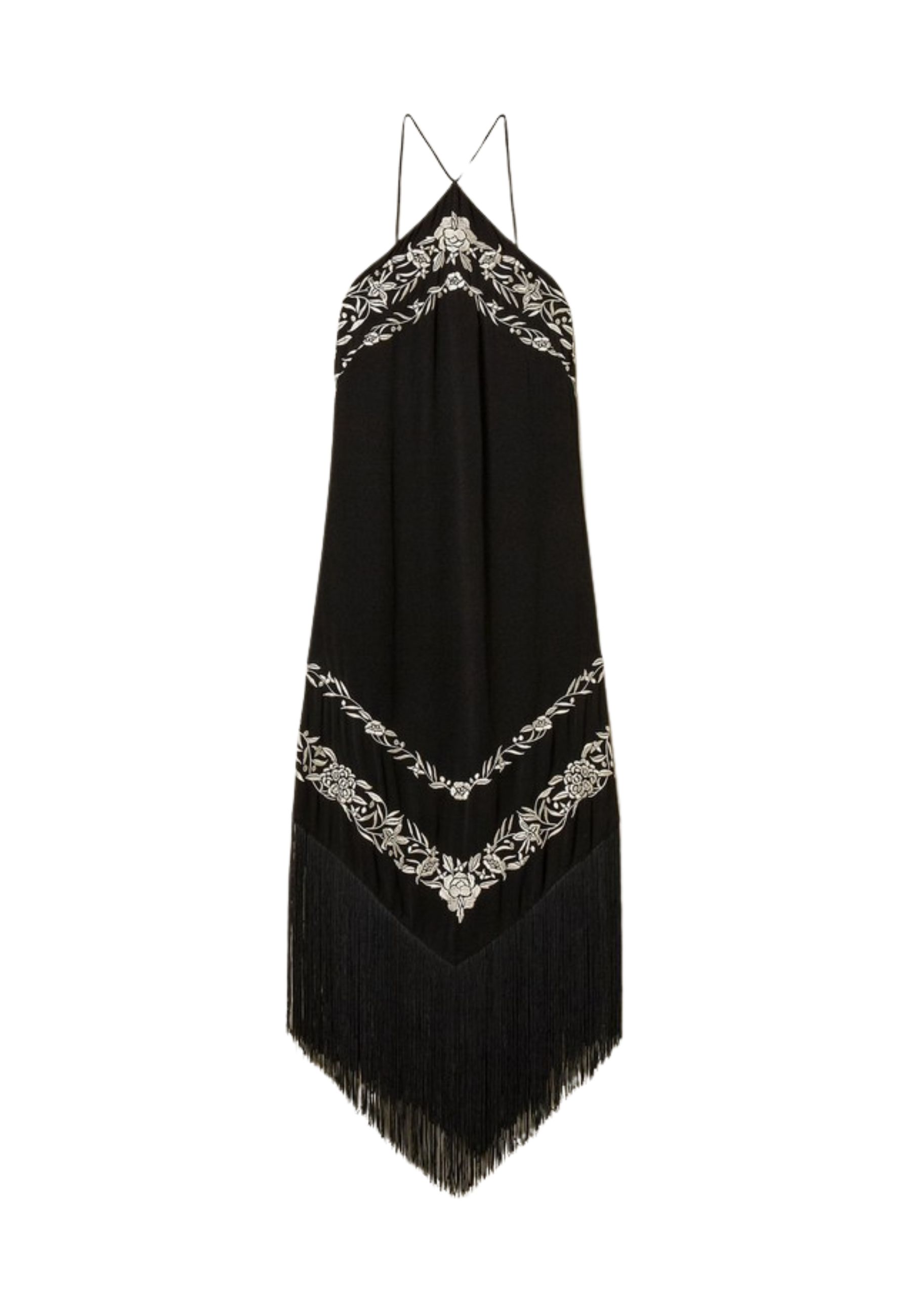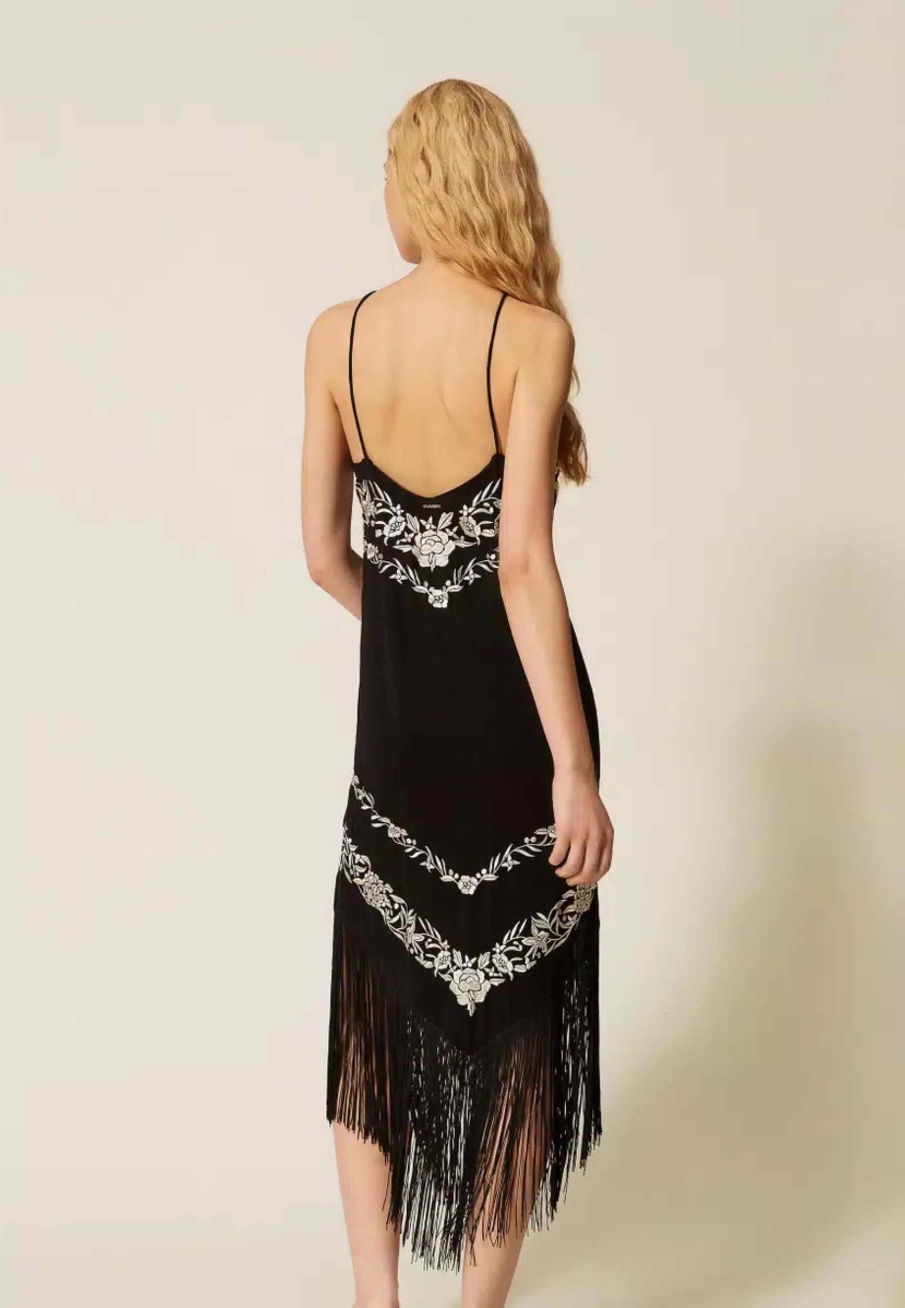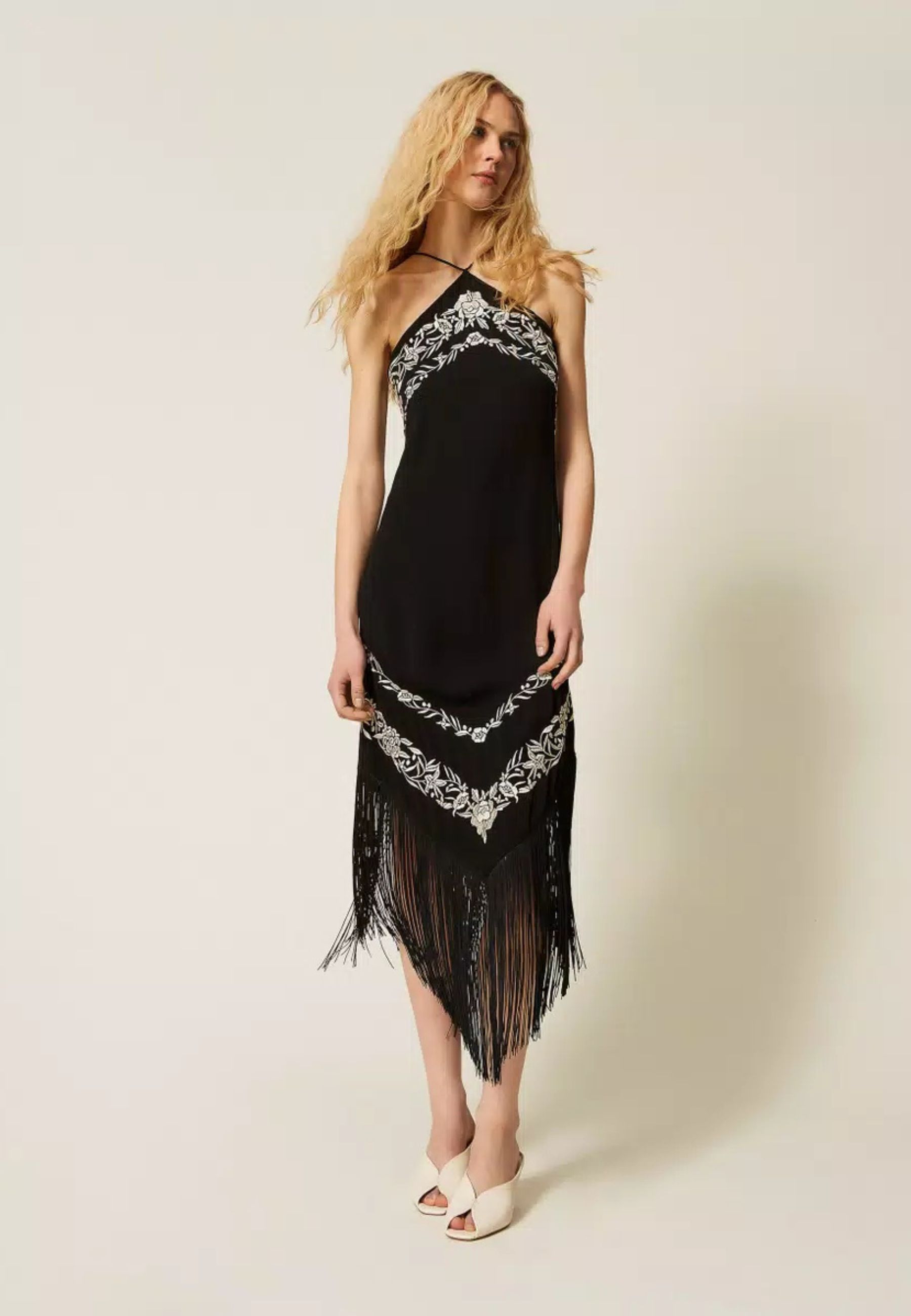 Abito lungo da donna realizzato in viscosa fluida, impreziosito da ricamo floreale piazzato a contrasto. Il design è valorizzato da frange a punta applicate sul davanti e sul retro, che conferiscono movimento e unestetica distintiva.