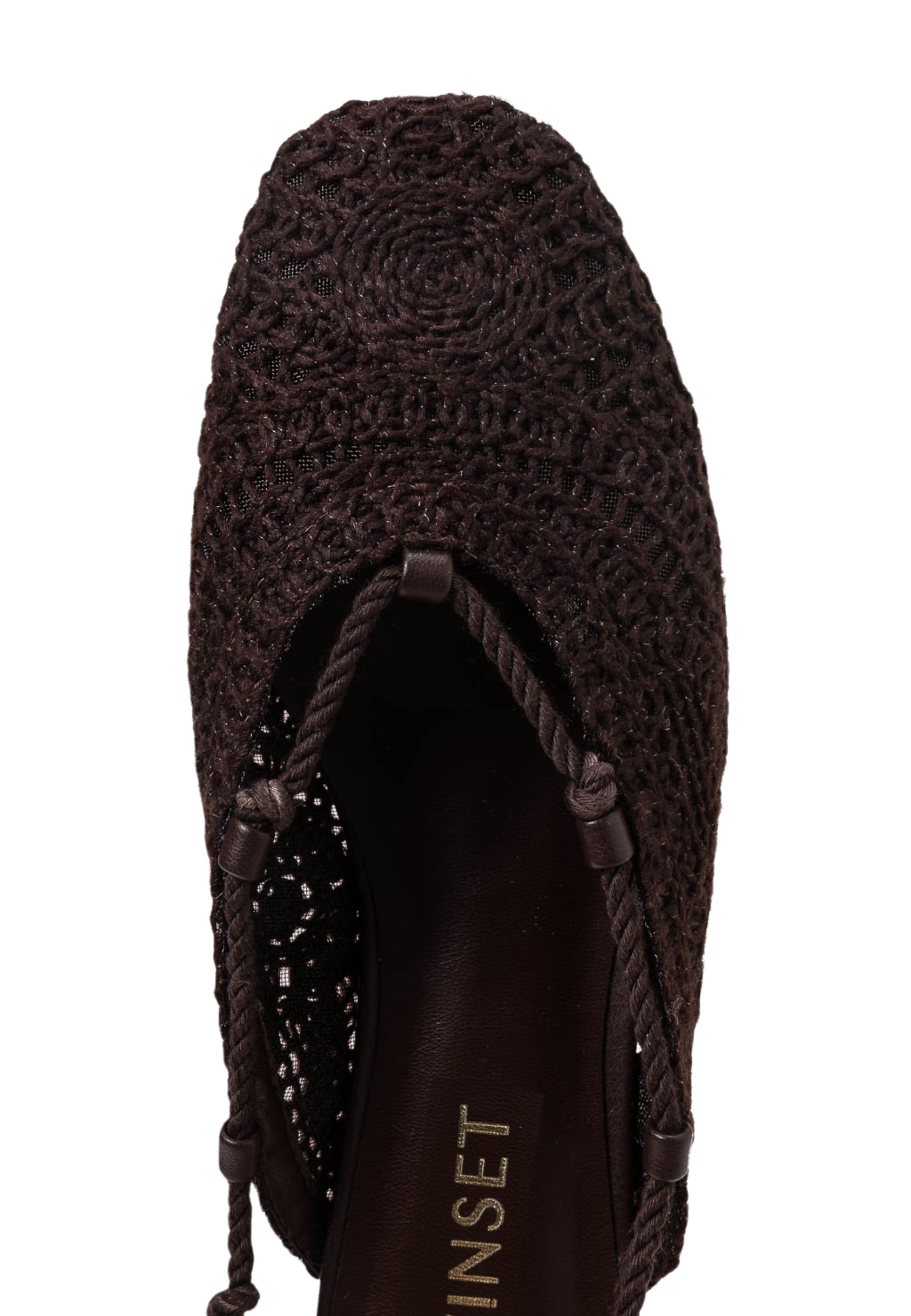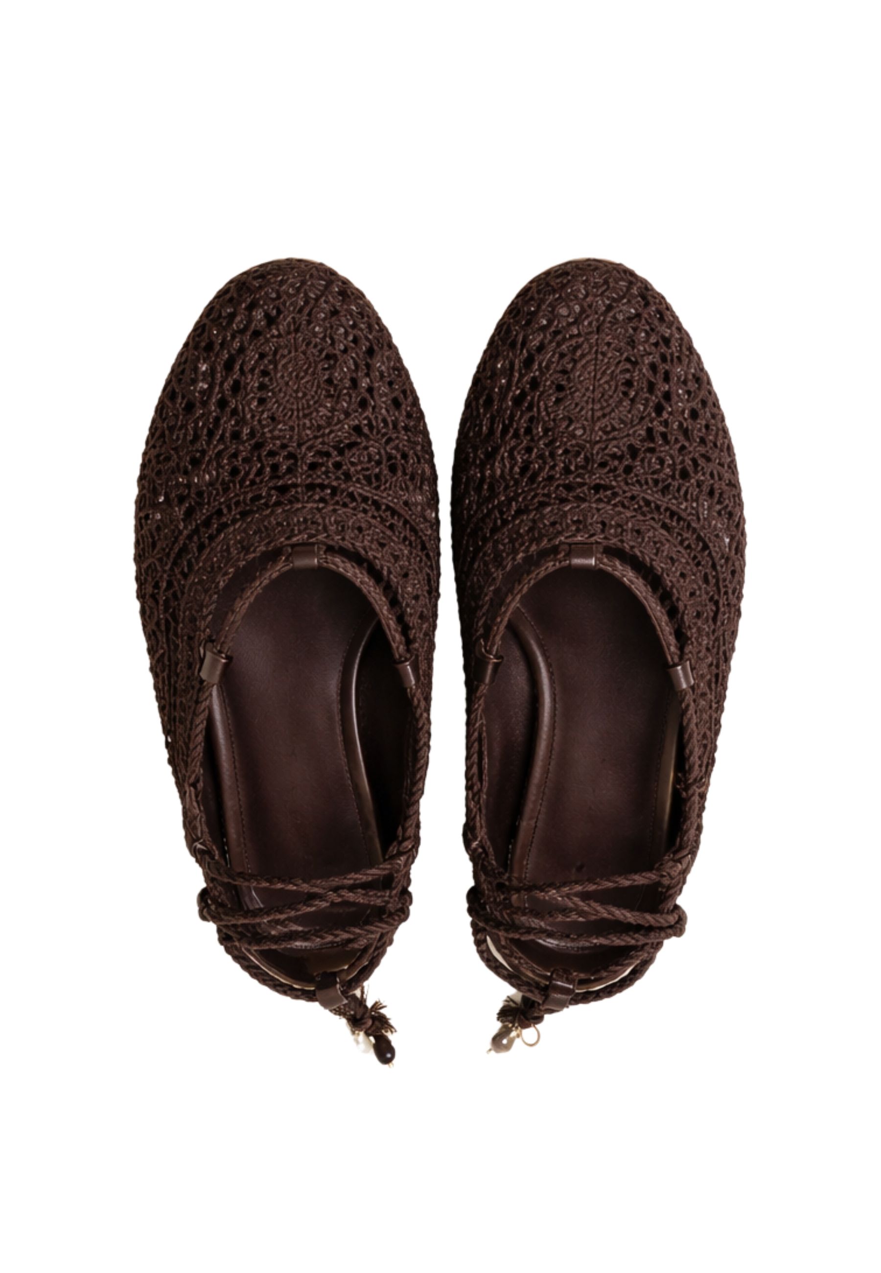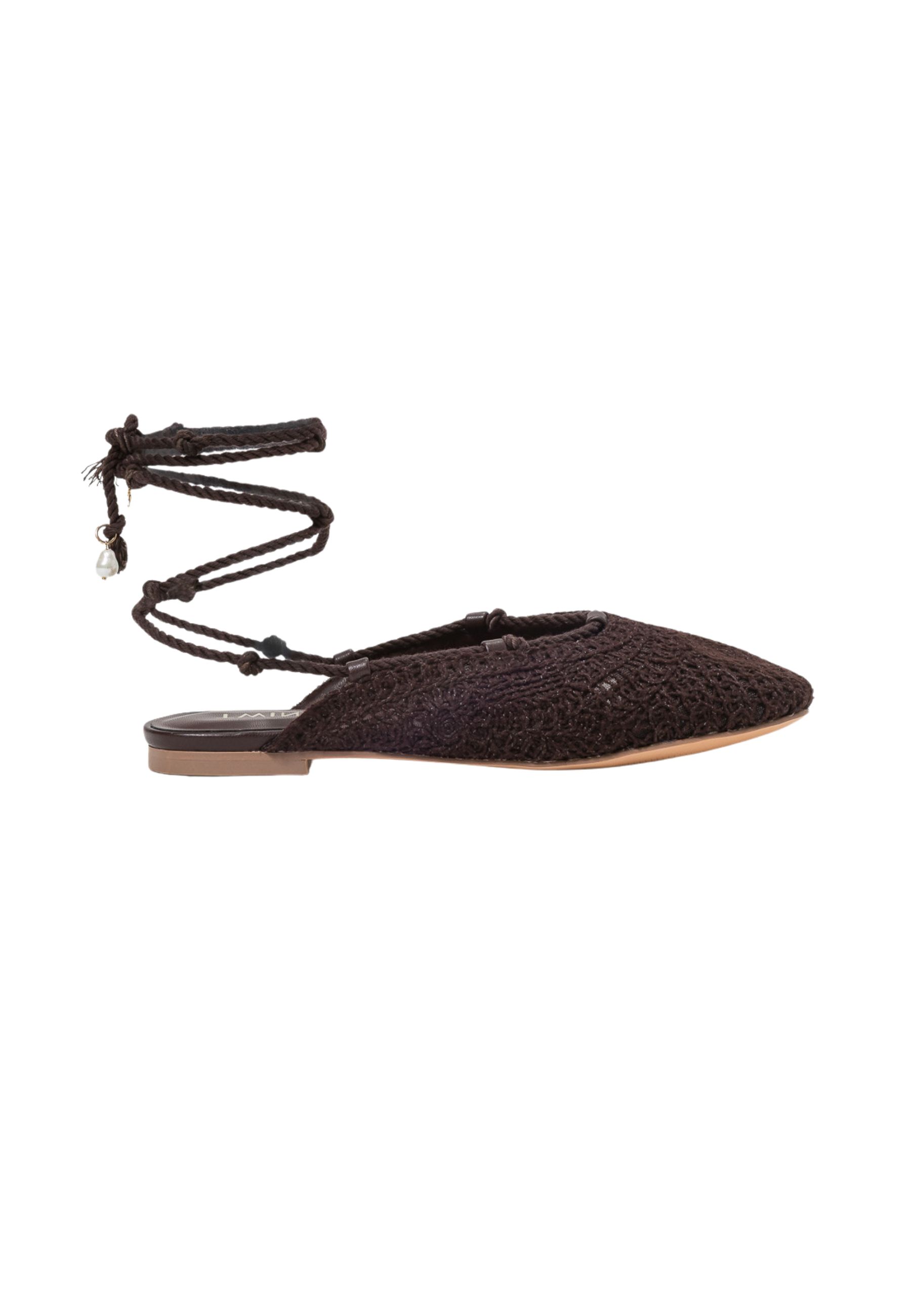 Ballerine mules in cotone con raffinata lavorazione crochet, caratterizzate da una silhouette femminile e leggera. Il design open-back valorizza la linea del piede, mentre lallacciatura alla caviglia con nastri criss-cross aggiunge un dettaglio distintivo e regolabile.