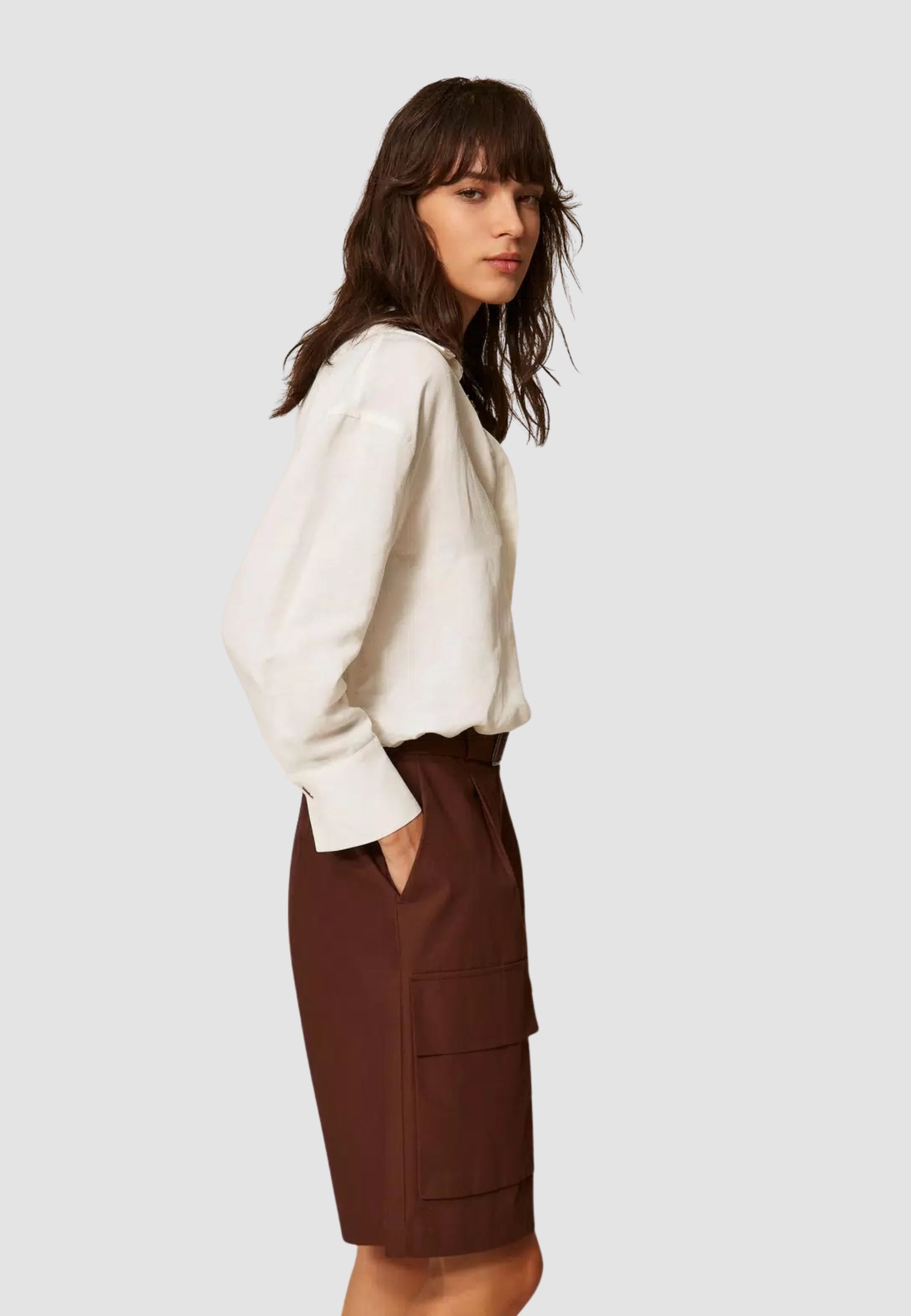 Il modello presenta una linea morbida e confortevole, arricchita da tasche cargo con patta applicate ai fianchi e tasche alla francese. È completato da cintura coordinata rimovibile con fibbia in metallo e chiusura con zip e bottone. Eventuali micro-impurità sono una caratteristica naturale dei materiali riciclati e ne attestano lautenticità.