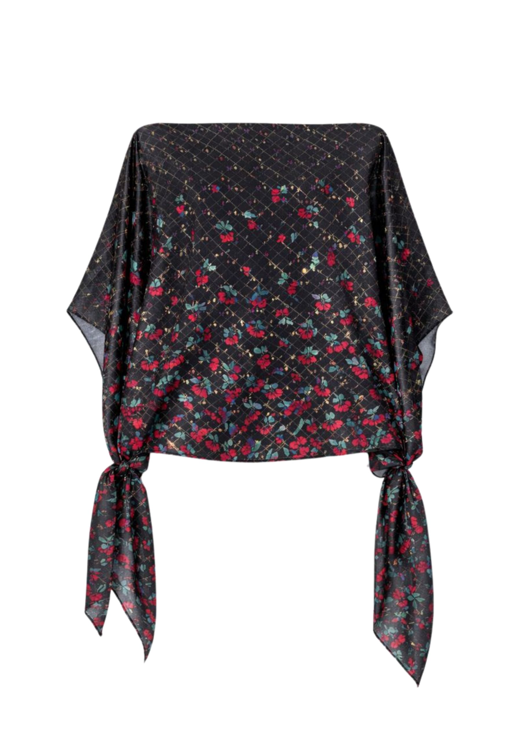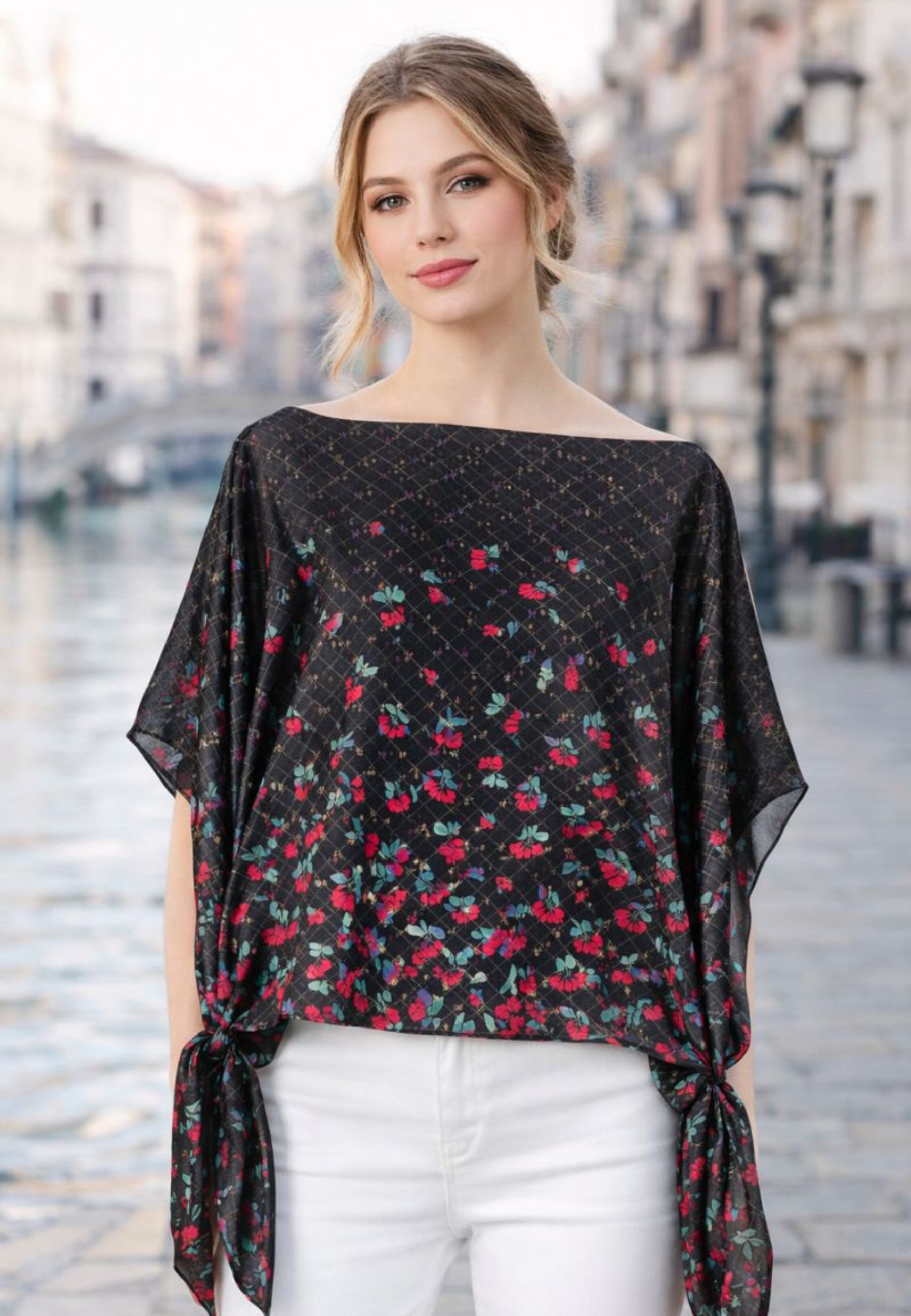 Blusa da donna dal taglio fluido e contemporaneo, caratterizzata da una raffinata stampa floreale su fondo nero con delicato motivo a losanghe. Il design a poncho presenta scollo a barca e maniche ampie, arricchite da laccetti laterali regolabili che donano movimento e personalità al capo. Leggera e versatile, è ideale da abbinare a pantaloni o gonne per un look femminile ed elegante, sia di giorno che di sera.