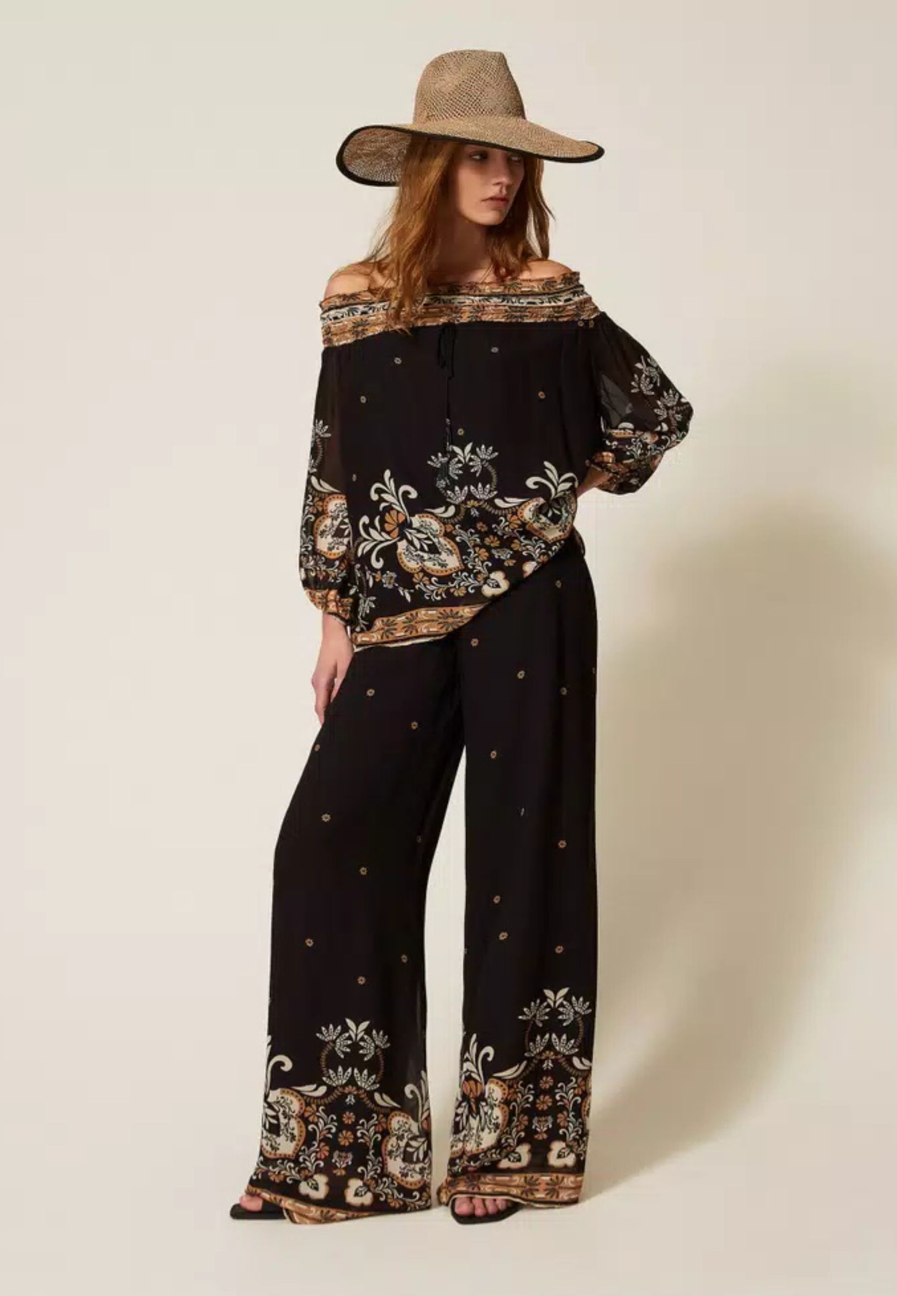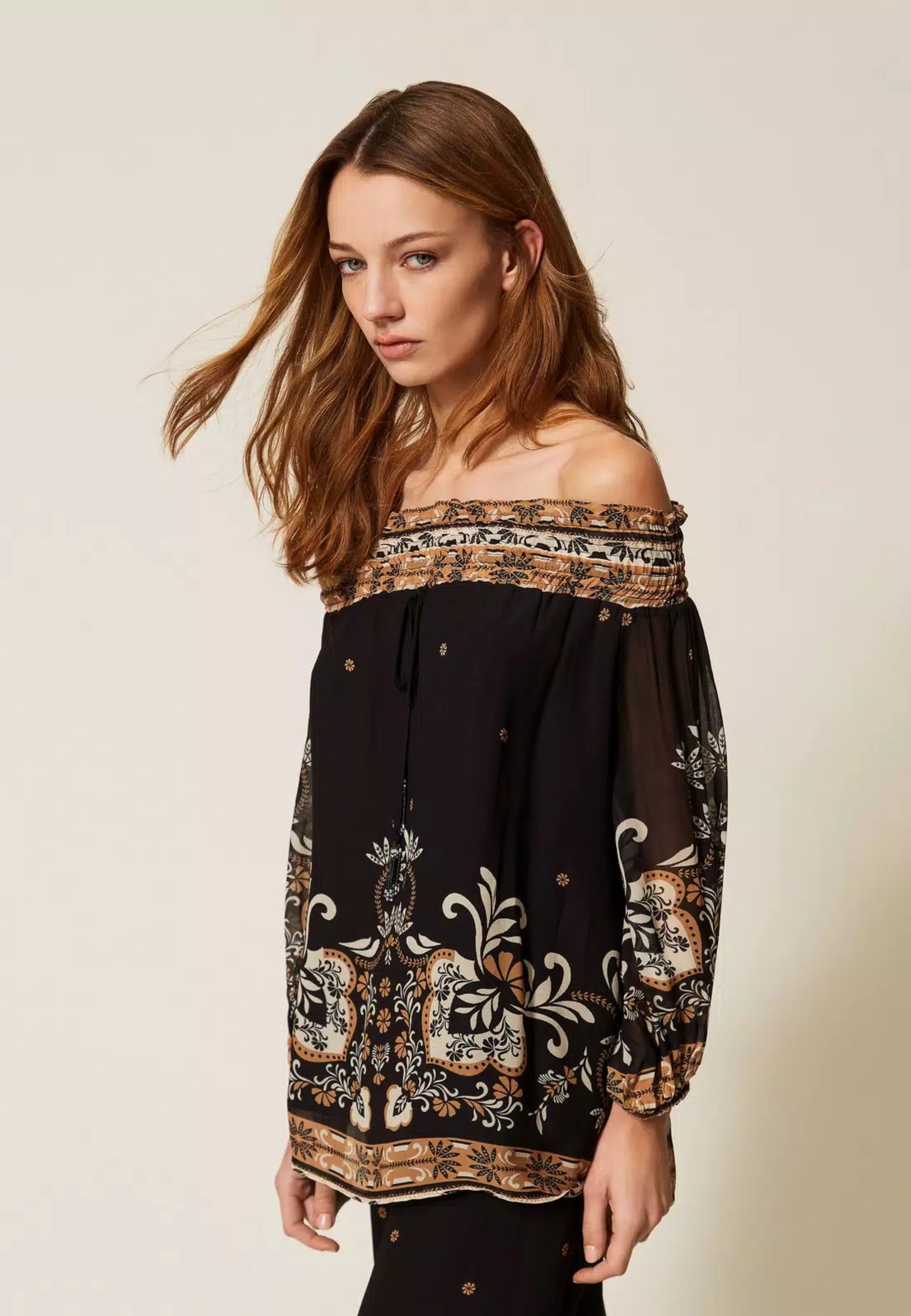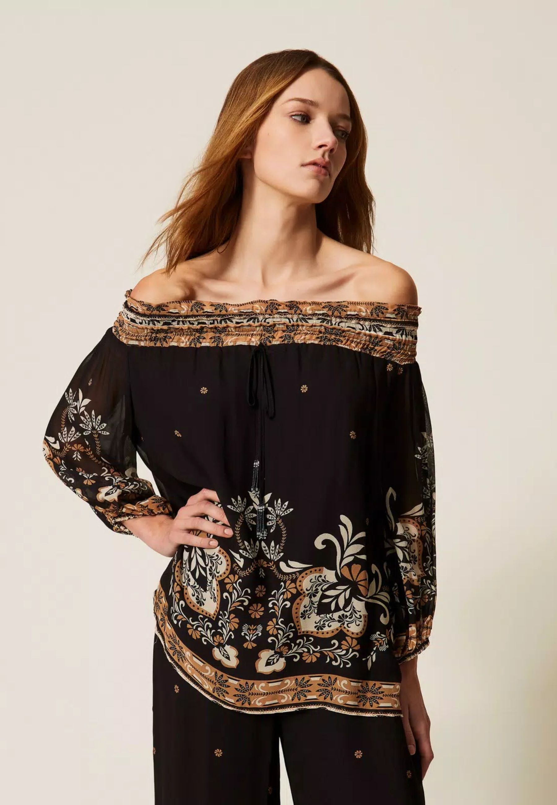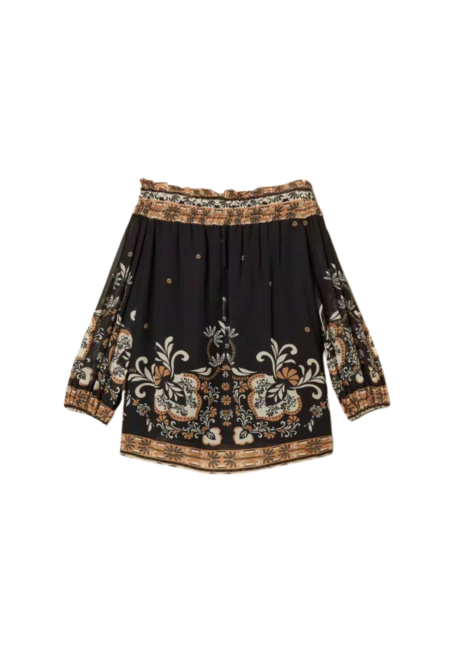 Blusa femminile dal carattere boho-chic realizzata in leggera georgette di viscosa, impreziosita da stampa piazzata dispirazione foulard nei toni del nero, beige e marrone. Il disegno ornamentale valorizza il capo con un effetto ricercato e distintivo.