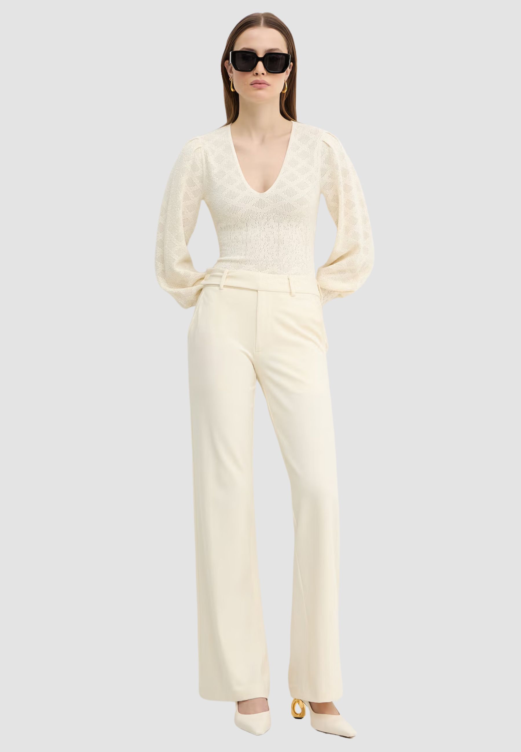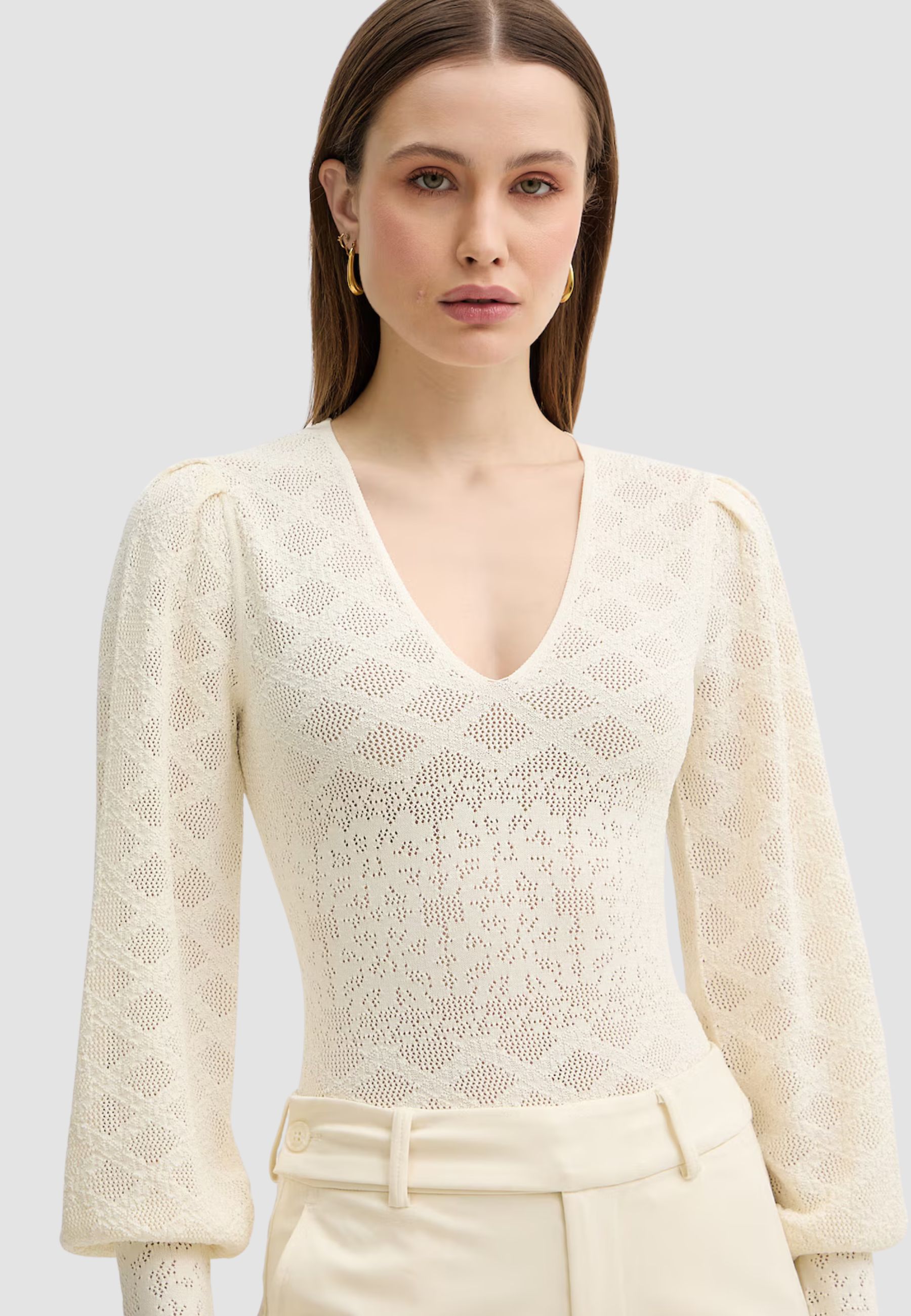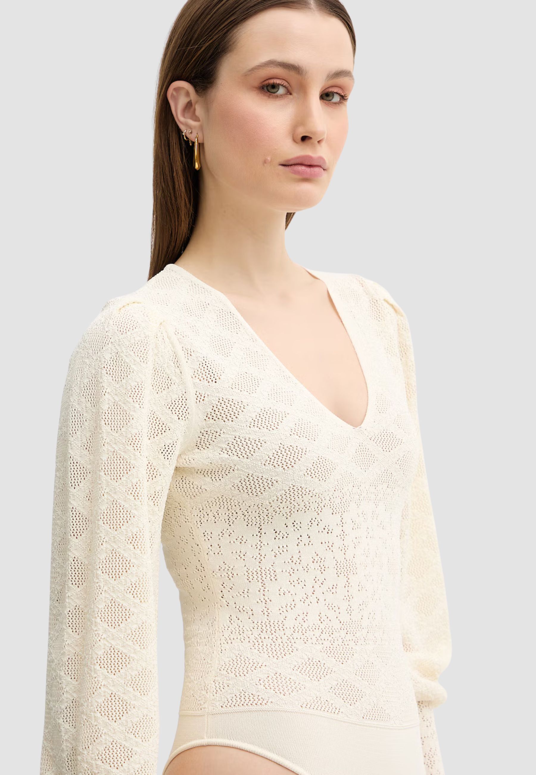 Body in maglia di viscosa stretch caratterizzato da una raffinata lavorazione punzonata con motivo a losanghe e disegno floreale effetto pizzo, che dona leggerezza e femminilità al capo. Il modello presenta uno scollo tondo profondo e maniche lunghe ampie, pensate per valorizzare la silhouette mantenendo comfort e vestibilità. La linea fitted aderisce al corpo con naturalezza, rendendolo ideale sia come capo protagonista sia abbinato a giacche o pantaloni a vita alta.