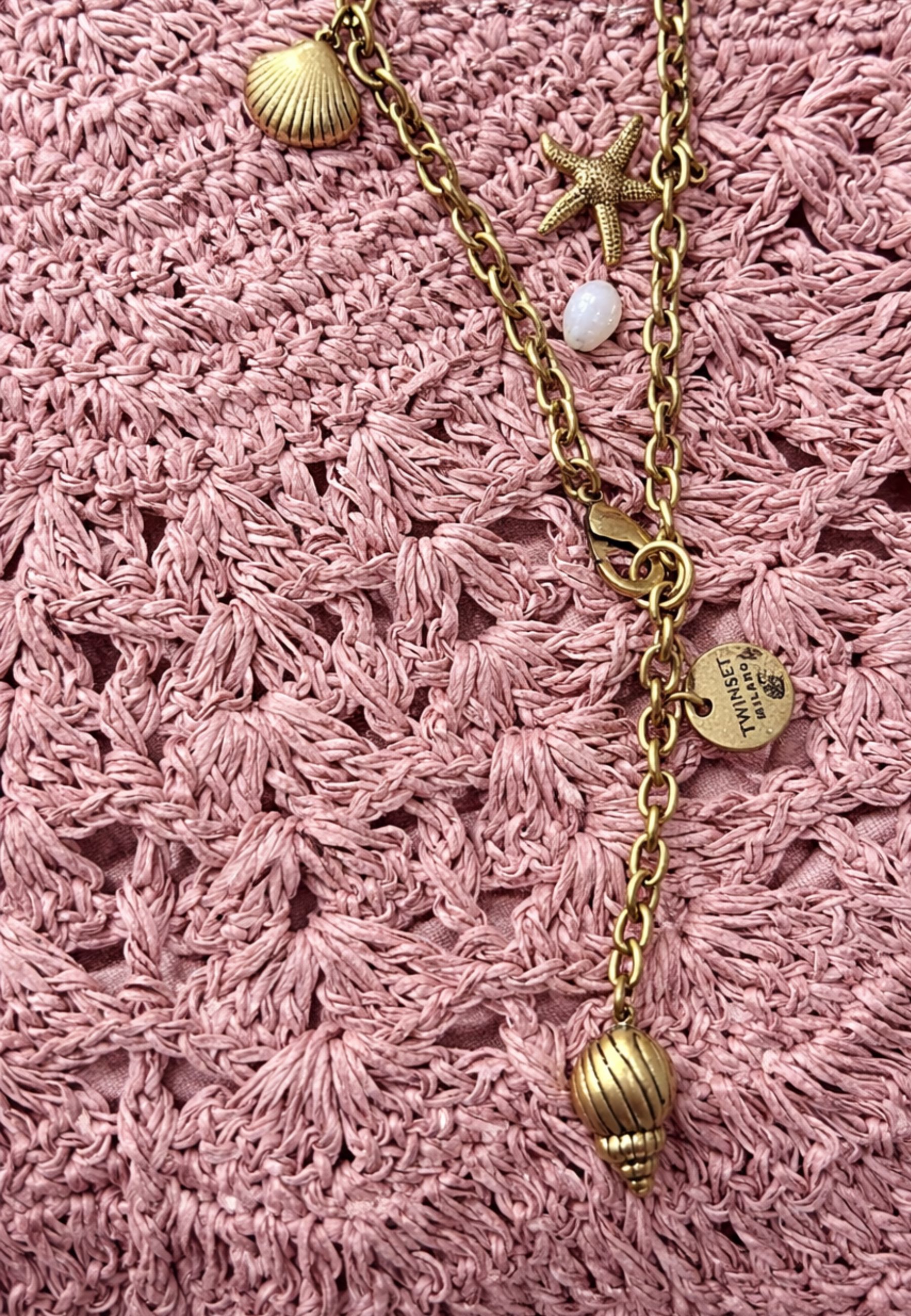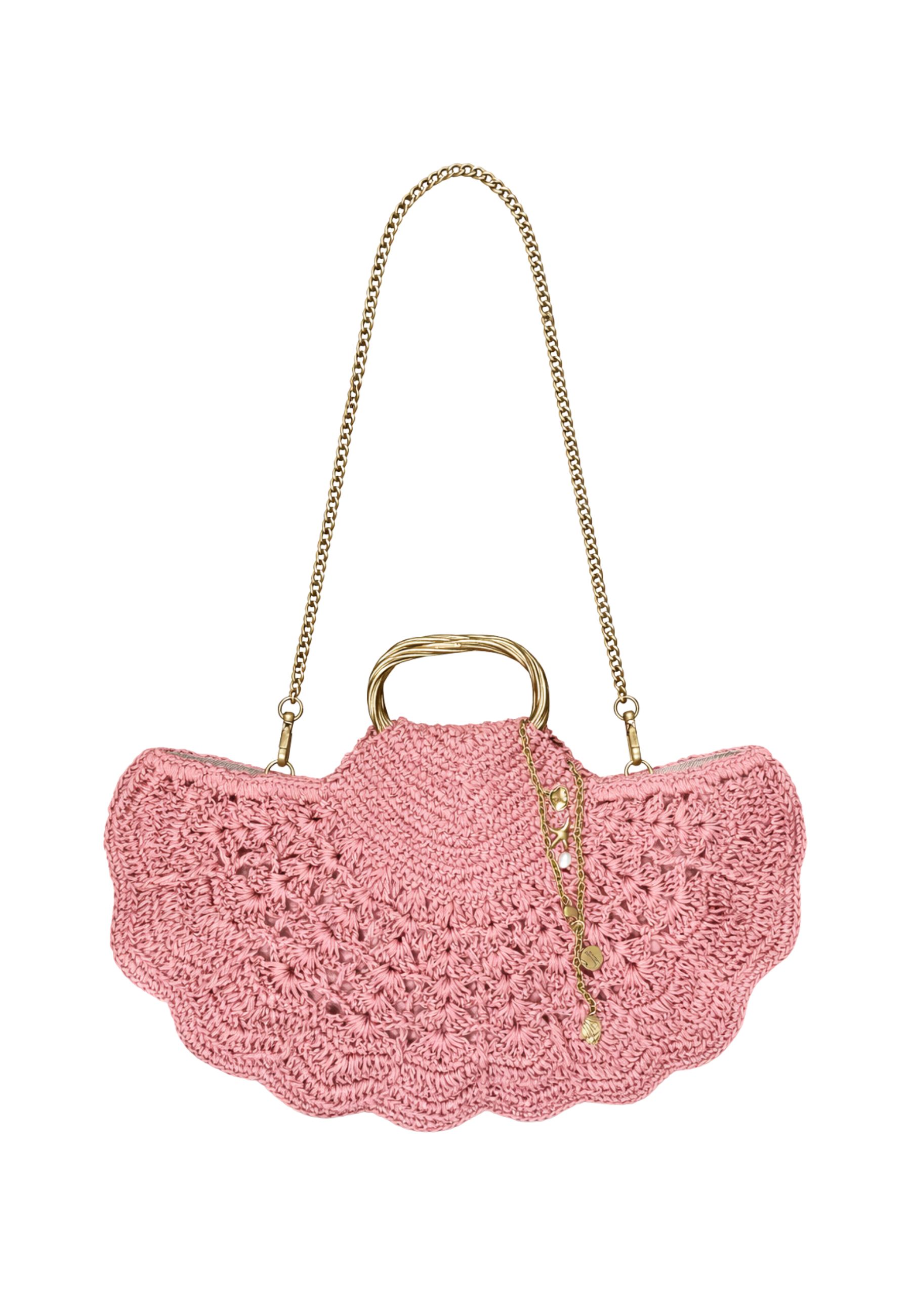 Dotata di doppi manici rigidi con finitura effetto oro e tracolla removibile da 50 cm, permette una doppia portabilità: a mano o a spalla. La tracolla è impreziosita da charms decorativi e catena in ottone, che aggiungono un dettaglio luminoso e distintivo.