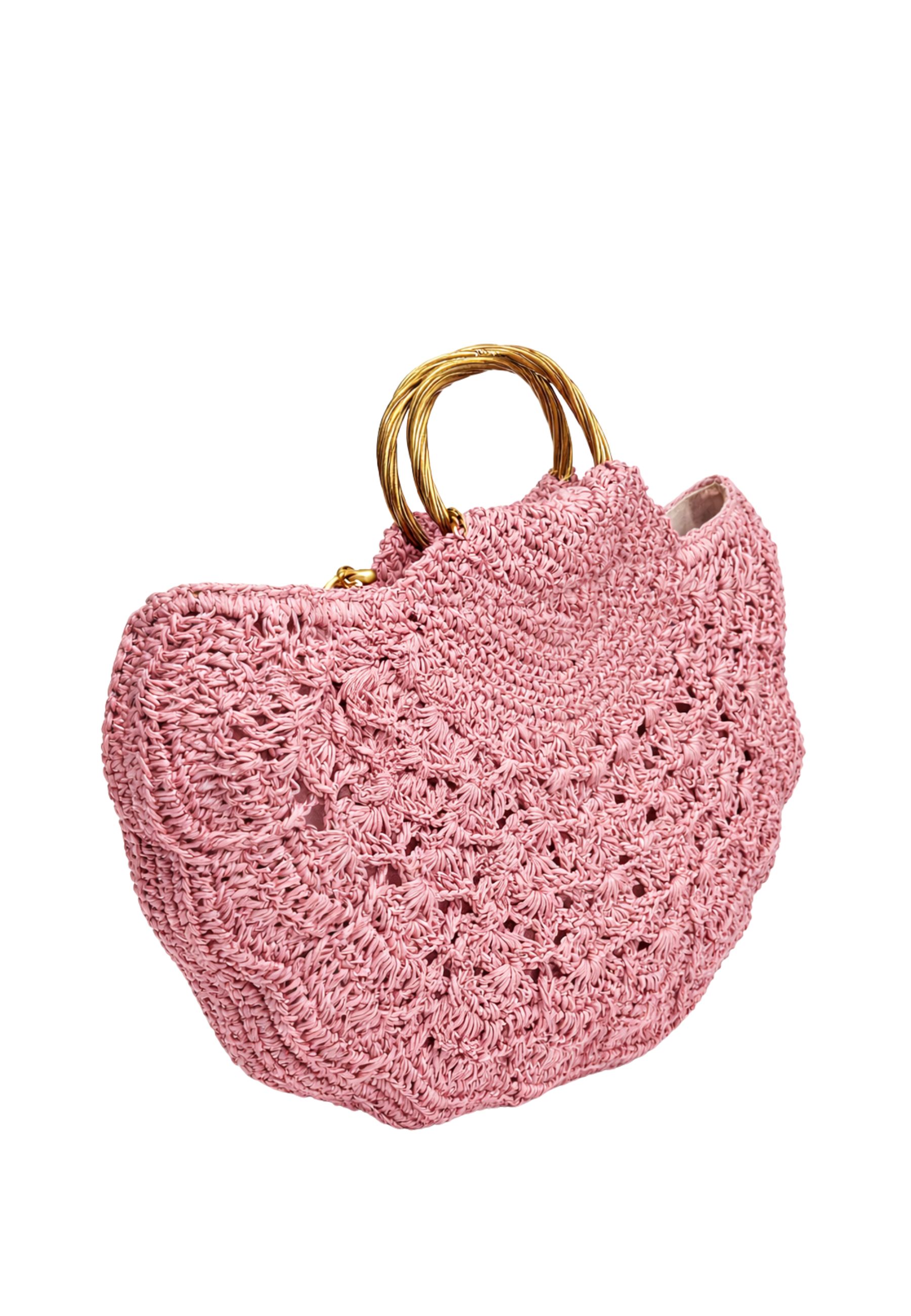 Borsa a mano dal design ricercato, realizzata in 100% carta tessile con lavorazione intrecciata a motivo floreale che valorizza la texture e dona un effetto tridimensionale sofisticato. La silhouette morbida e leggermente ondulata esalta il carattere artigianale del modello, rendendolo ideale per la stagione primavera/estate.