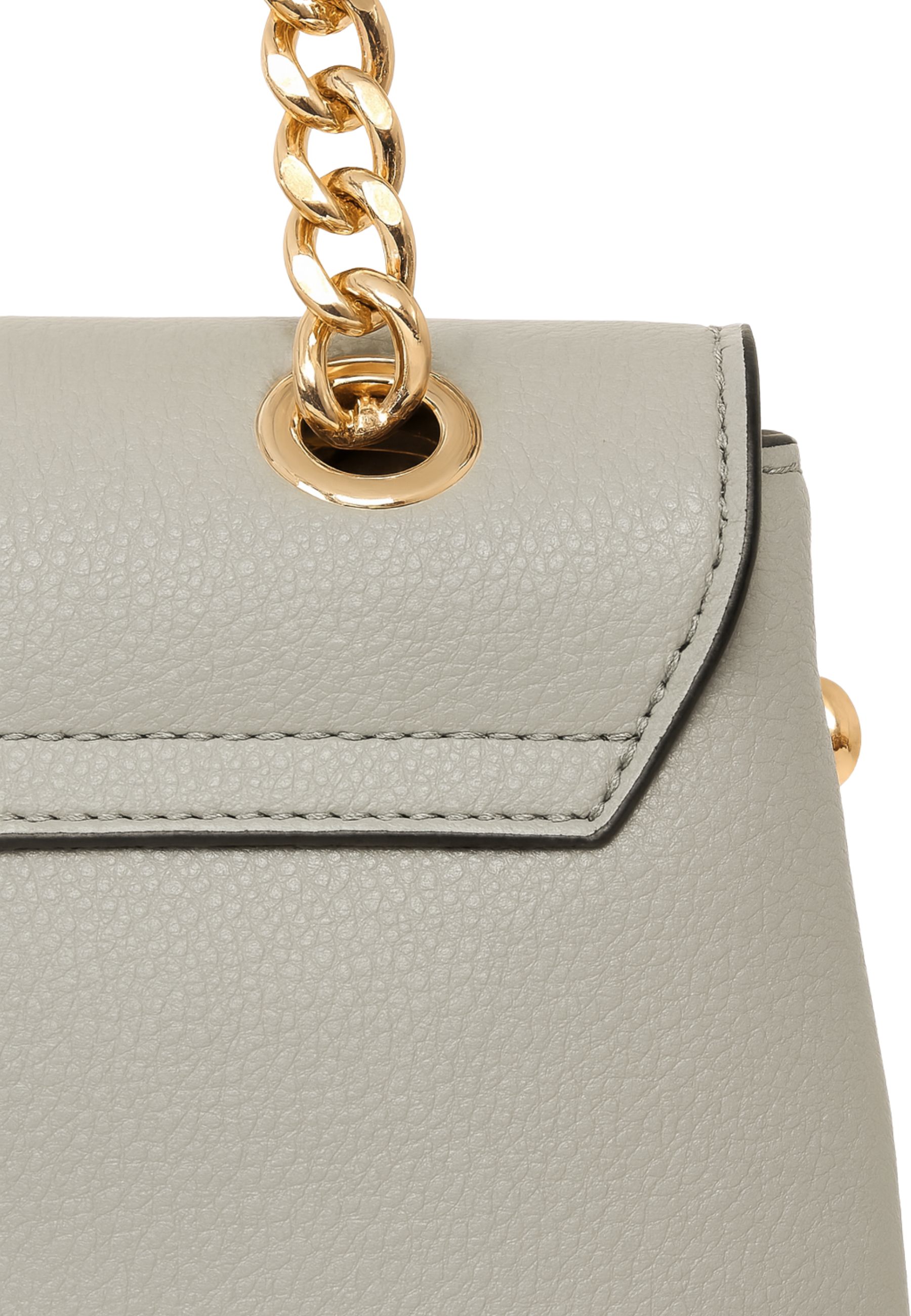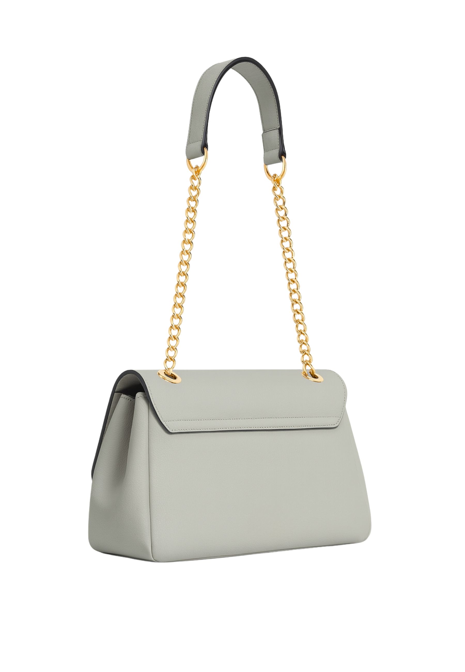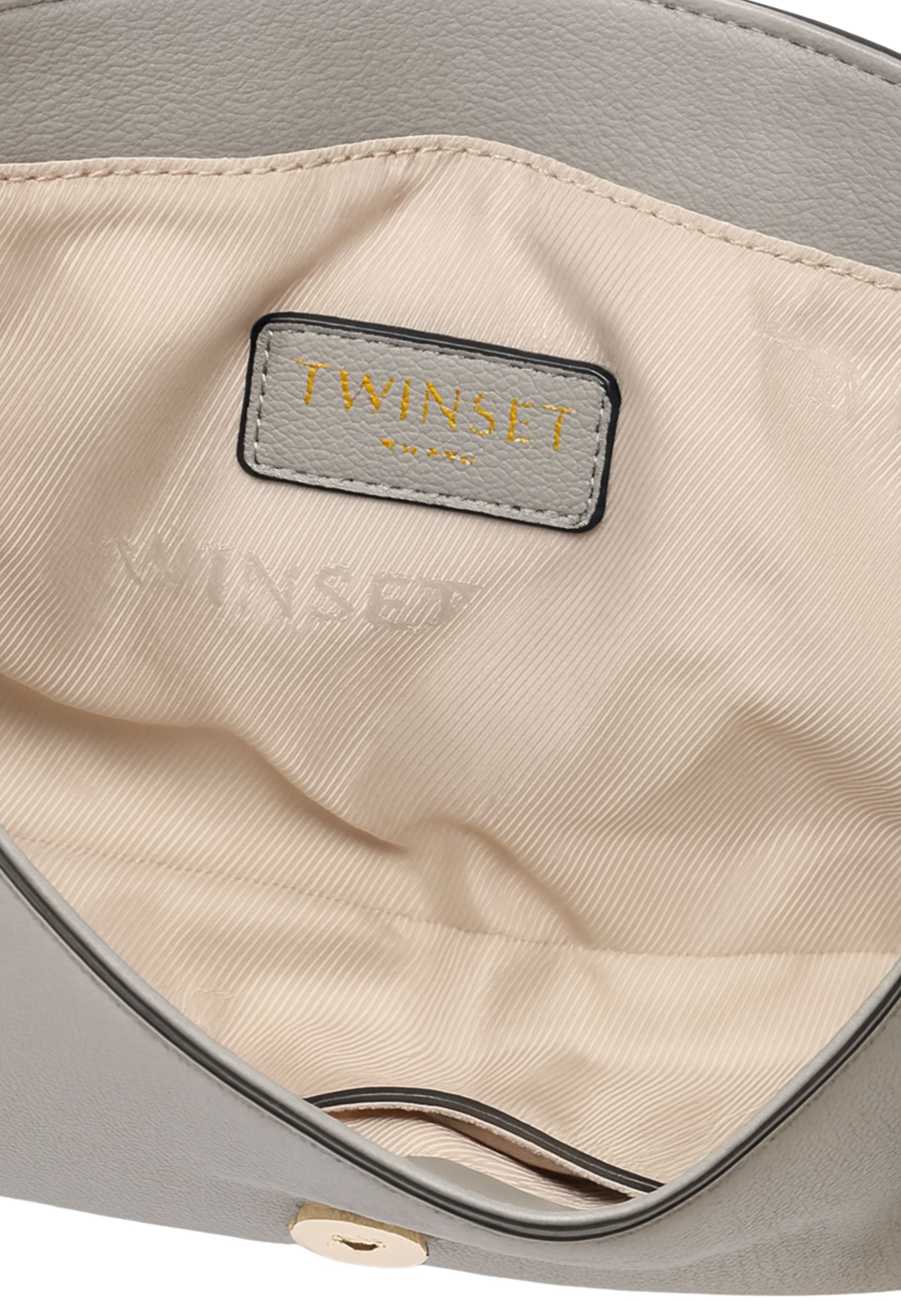 Elegante borsa a spalla Twinset realizzata in similpelle liscia, caratterizzata da un design raffinato e dettagli femminili. La patta frontale è impreziosita da due fibbie decorative con finitura dorata, che richiamano lo stile iconico del brand. Presenta tracolla in catena metallica intrecciata con inserti in pelle per una comoda portabilità a spalla o a mano.